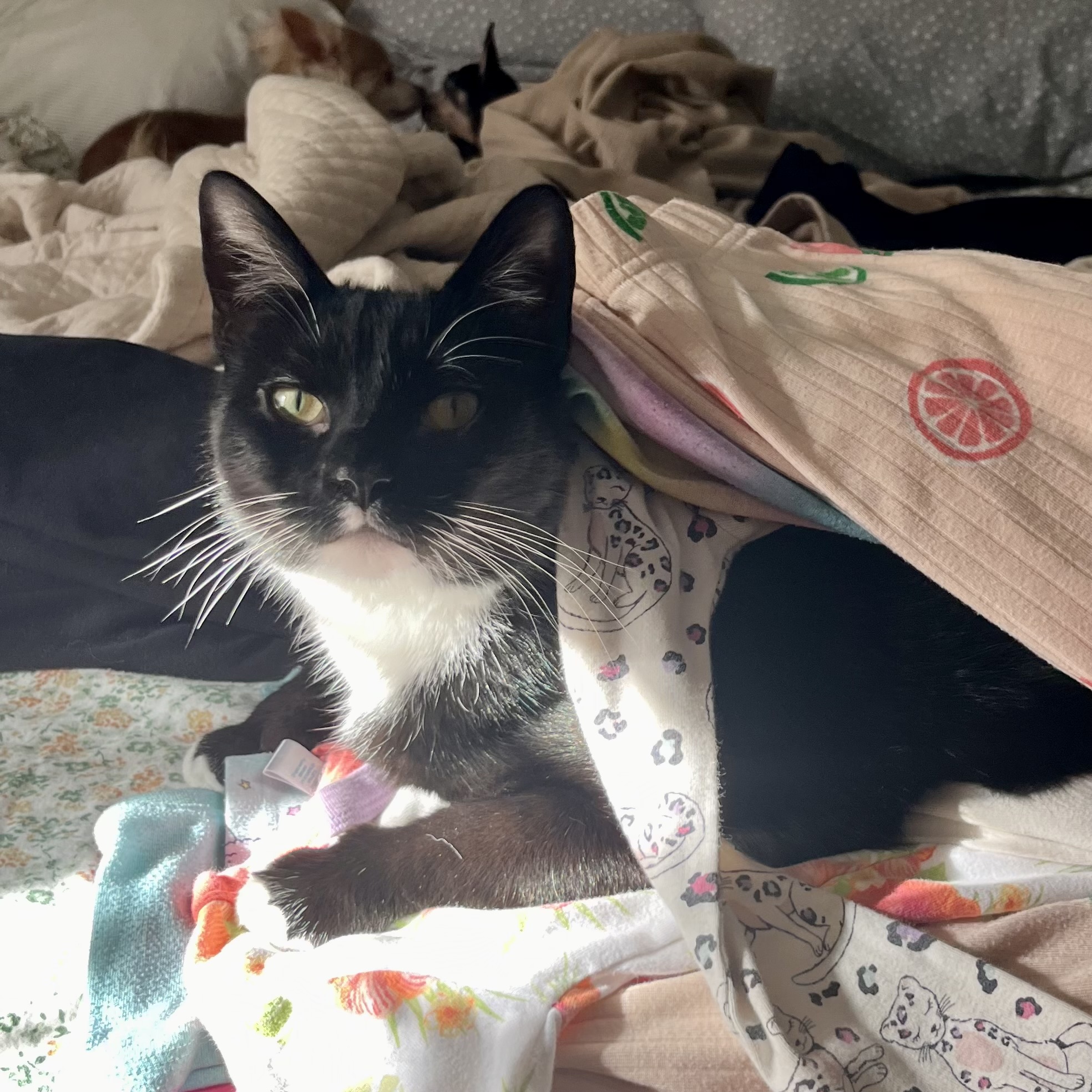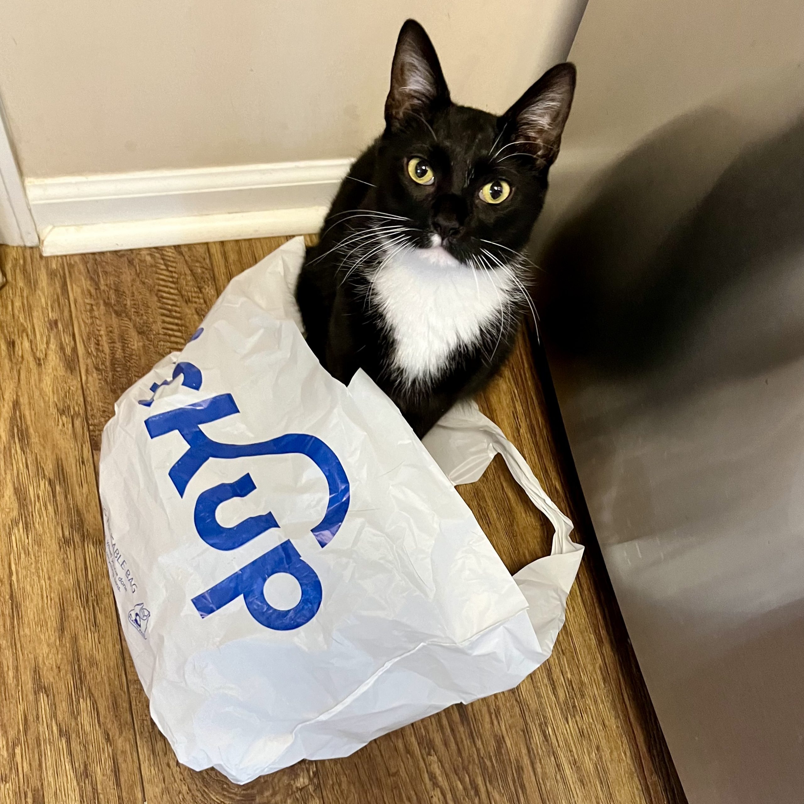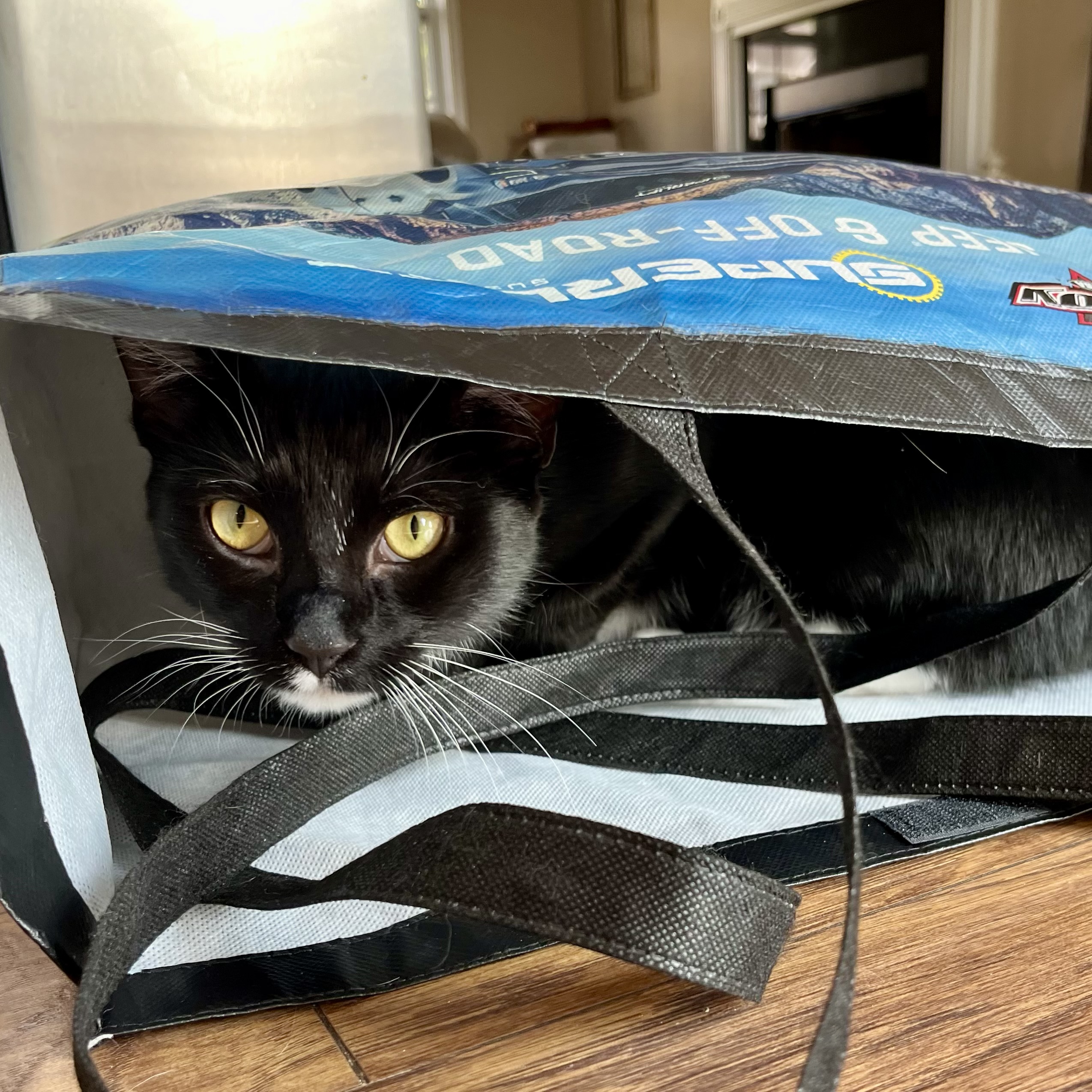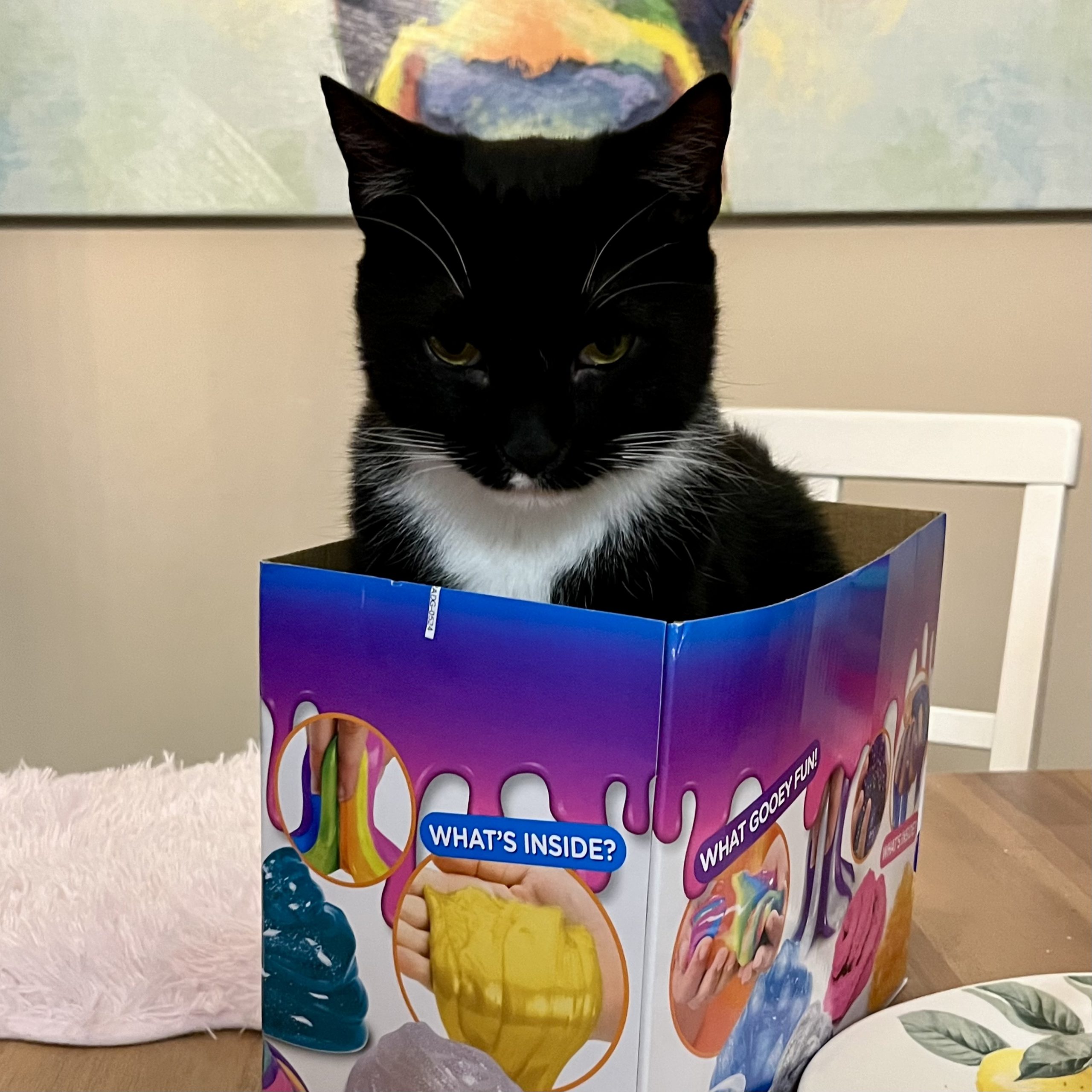 Alan “Cash” Quatermain is a cat who knows what he loves… sitting in things! If you’ve got a box, a basket, a bucket, whatever. He’ll find his way into it. He was recently returned only because he had a tendency to mosey out with dogs when they went outside. Other than being a bit of a door darter, his family said there was absolutely nothing wrong with him. Cash is overly friendly, social and playful. He does great with cats and dogs and kiddos too!