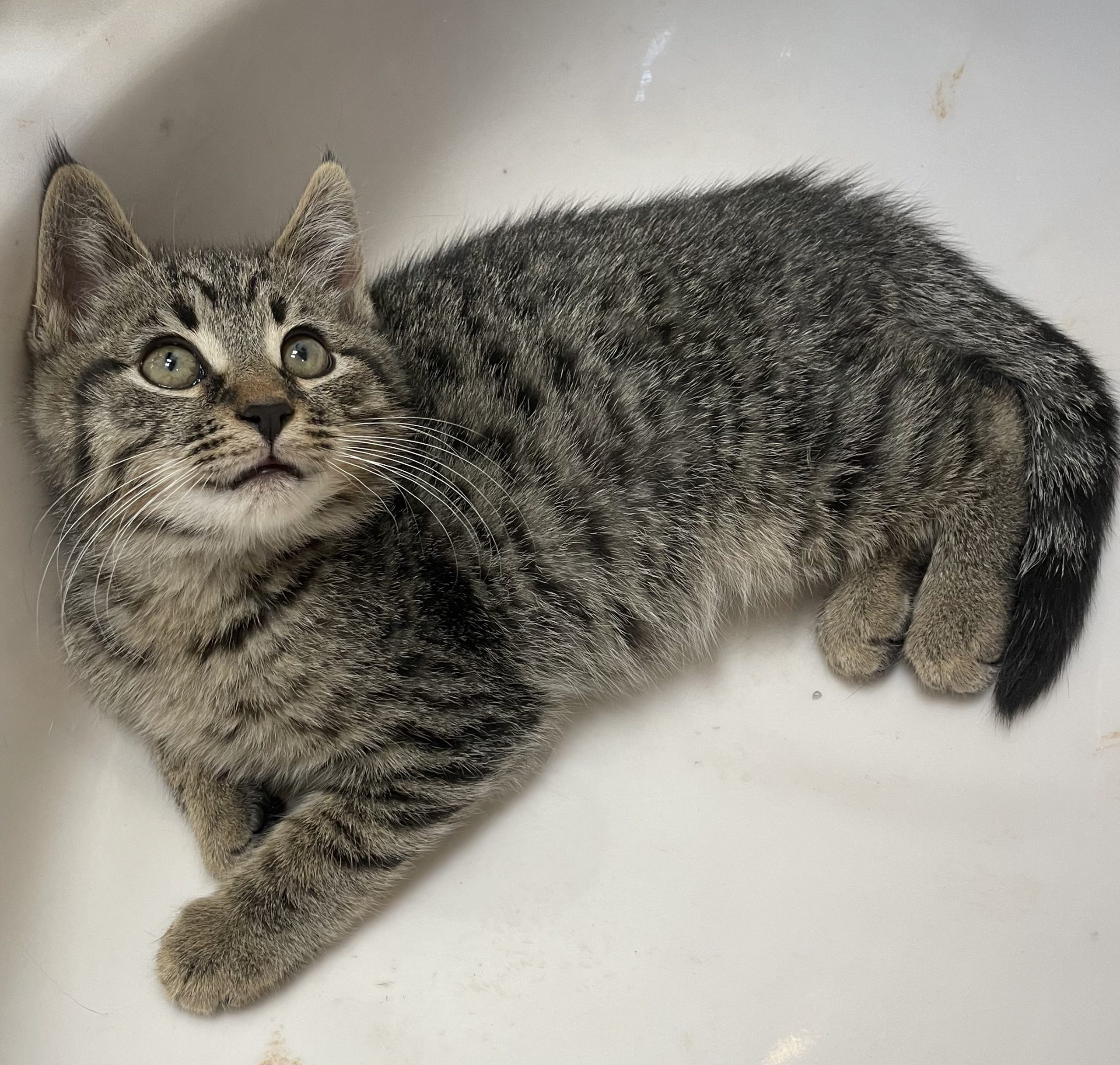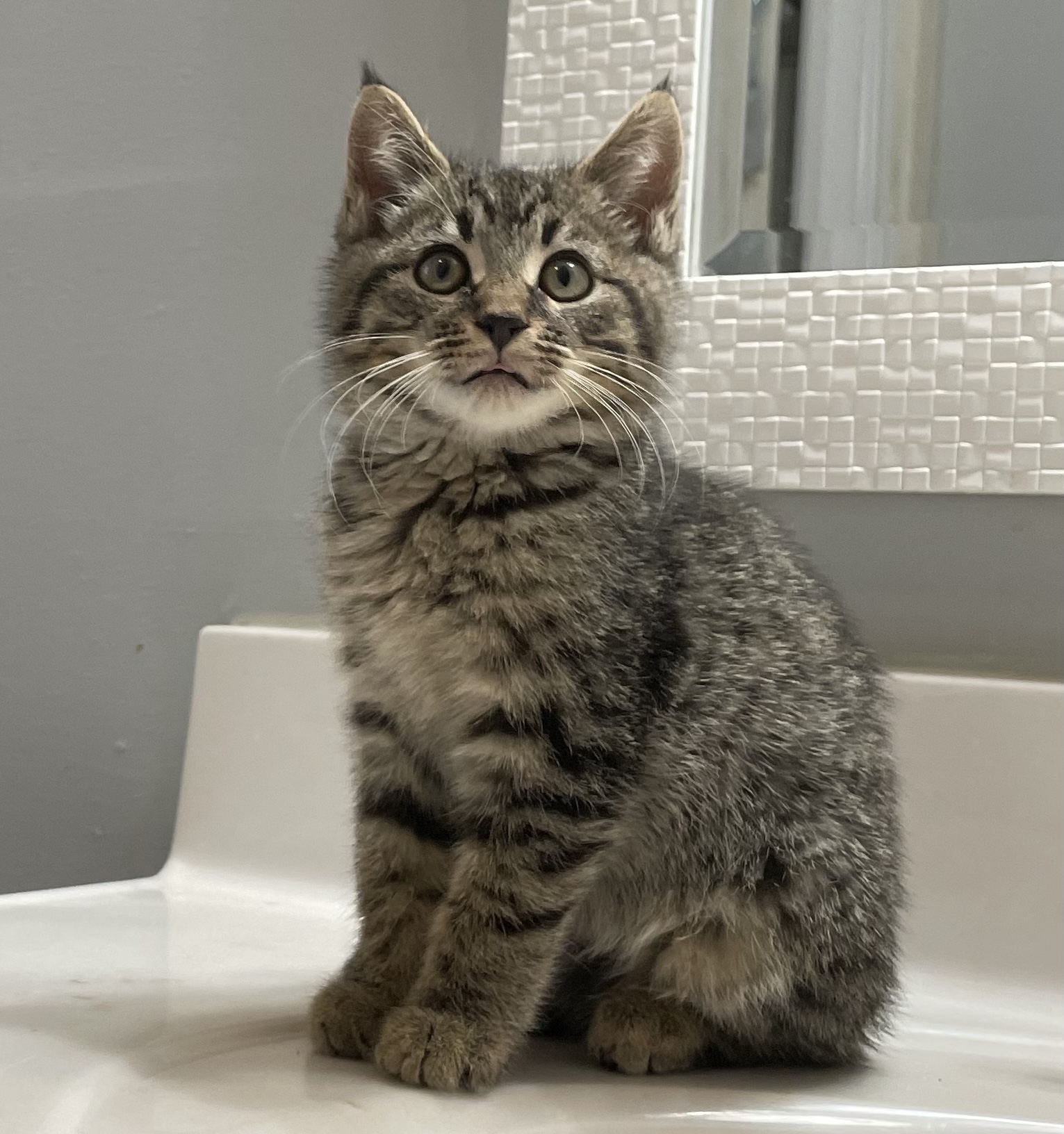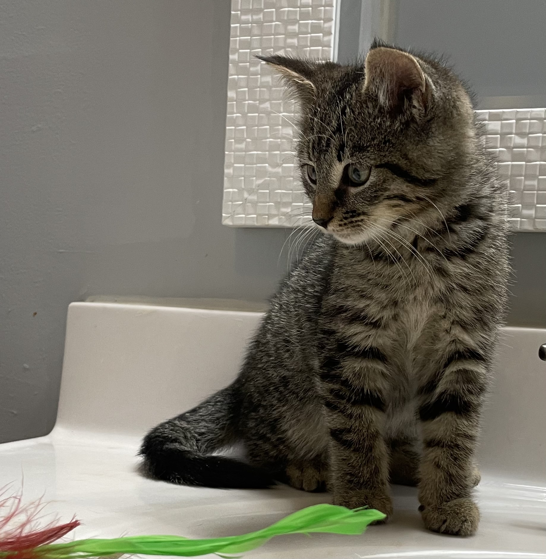 With my cute ear tips and spotted coat, I might look like a baby bobcat, but I'm just a baby kitten! I will need a little time to adjust to my new surroundings, but I already respond well to pets, wand toys, and love.