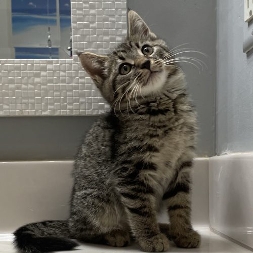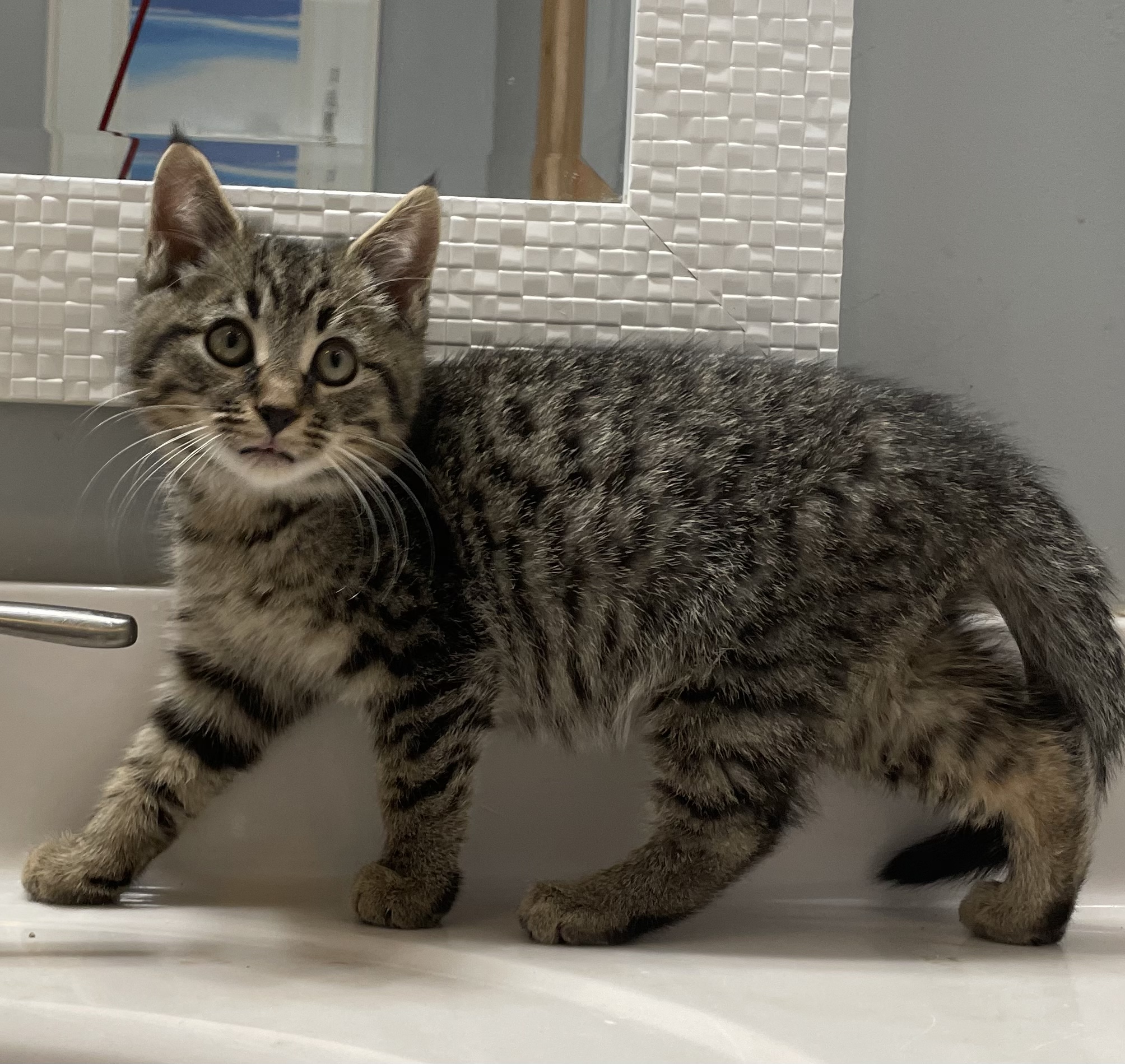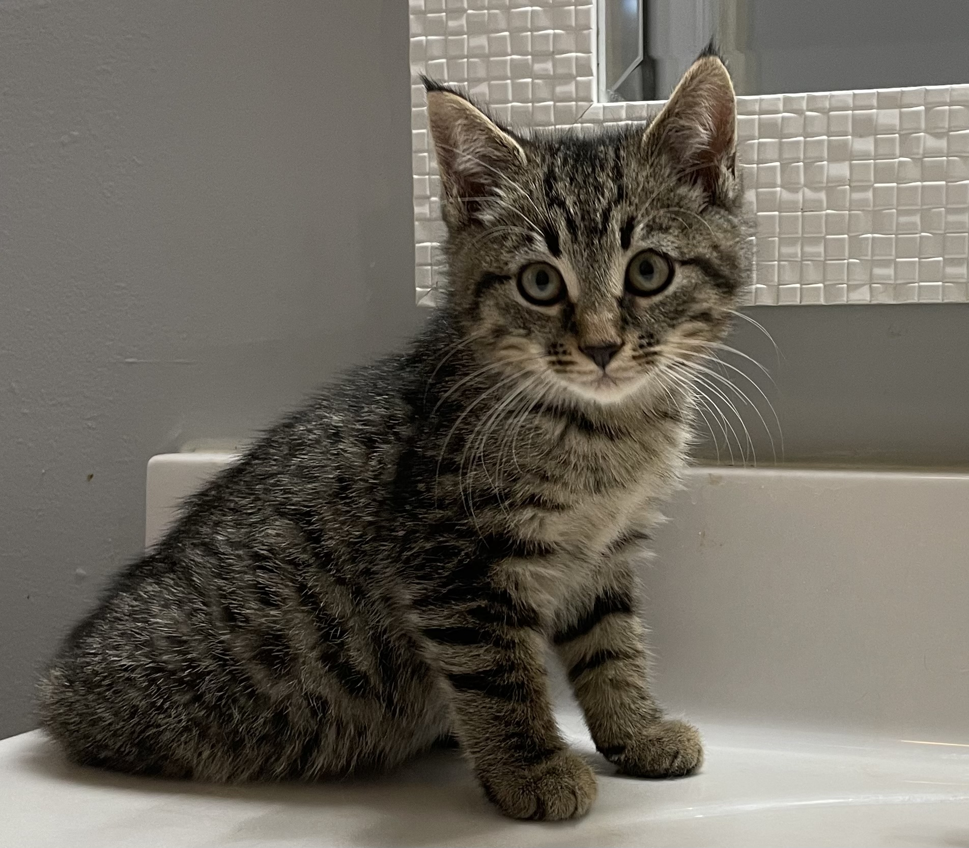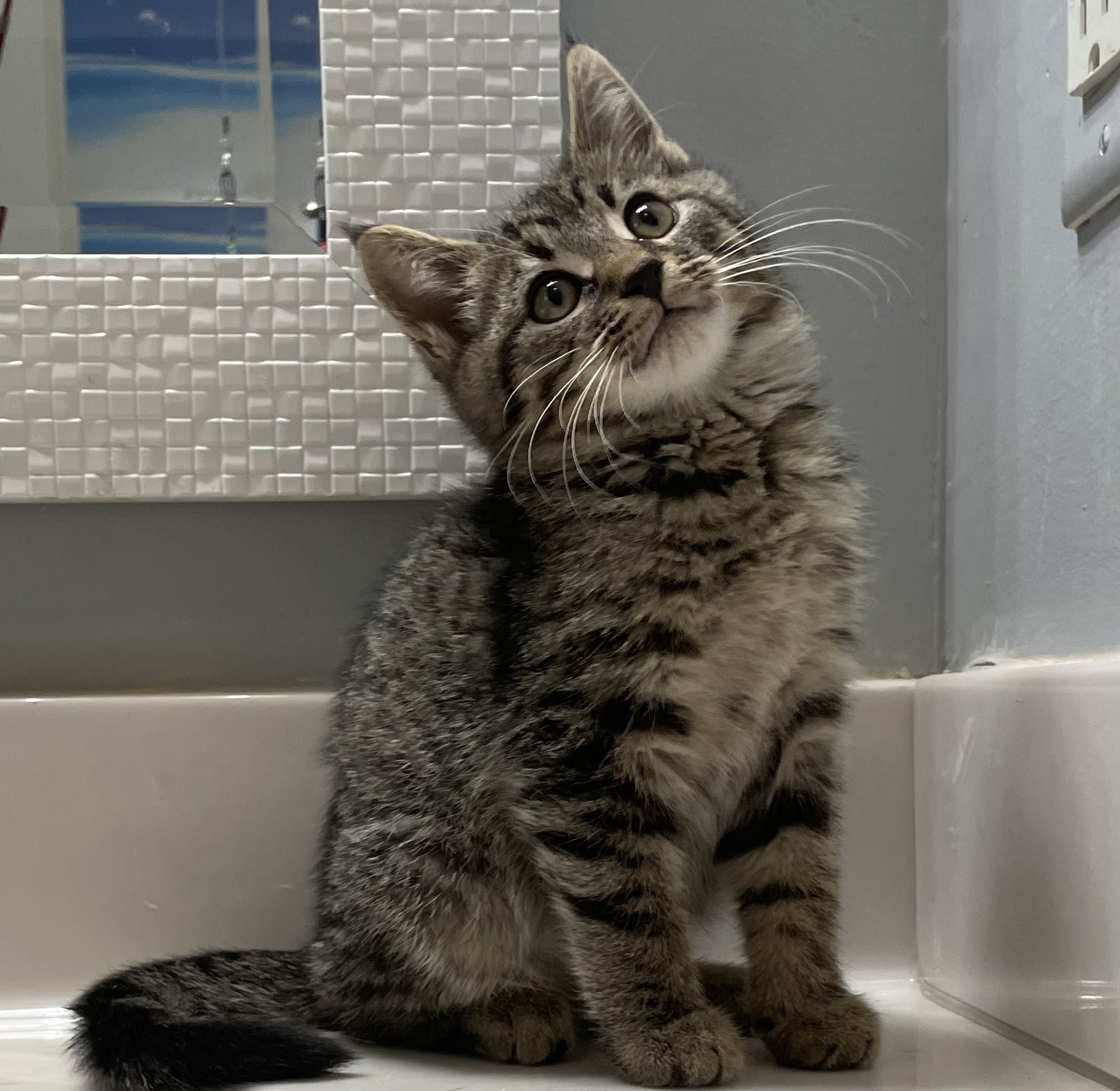 With my cute ear tips and spotted coat, I might look like a baby bobcat, but I'm just a baby kitten! I will need a little time to adjust to my new surroundings, but I already respond well to pets, wand toys, and love.