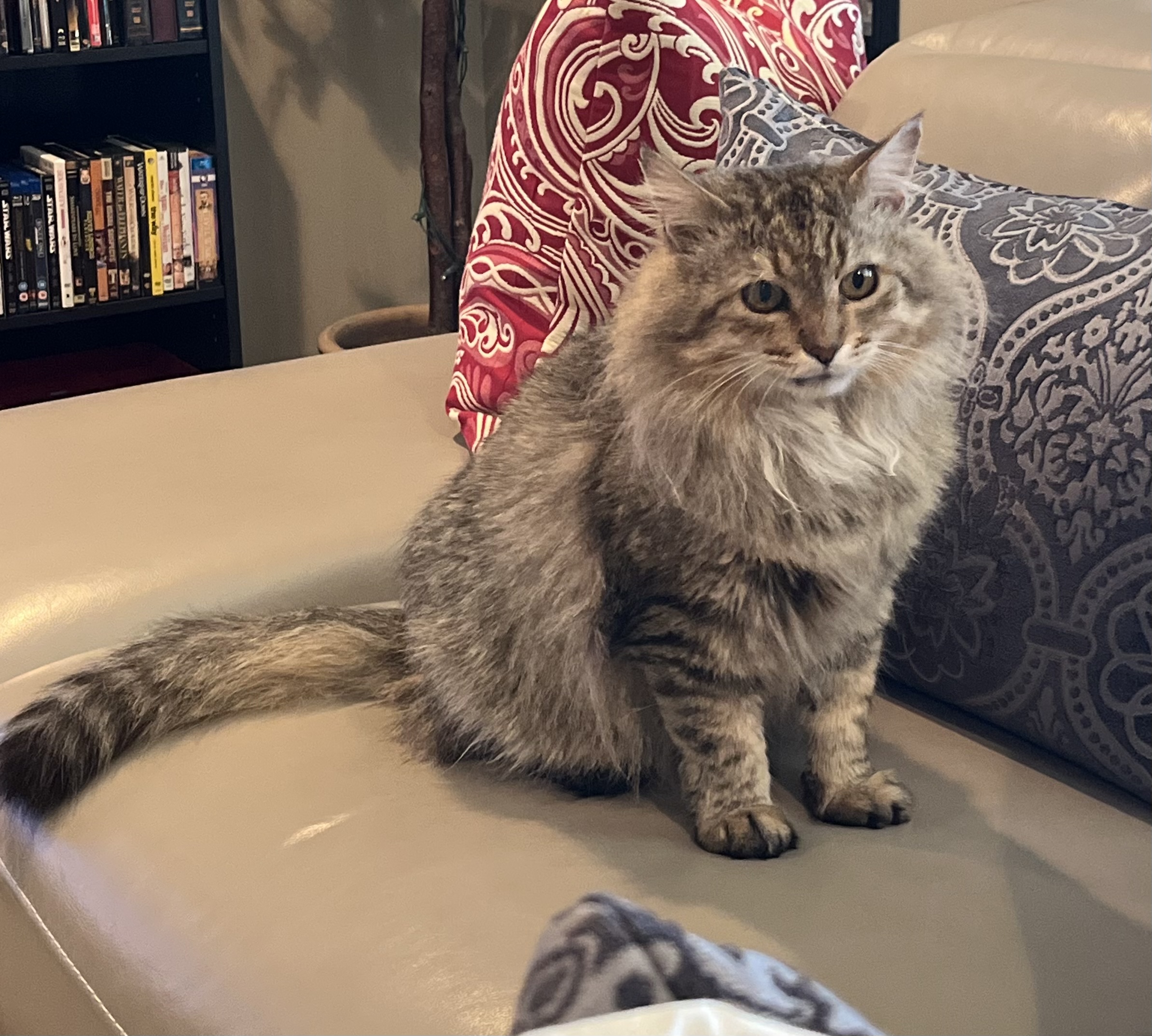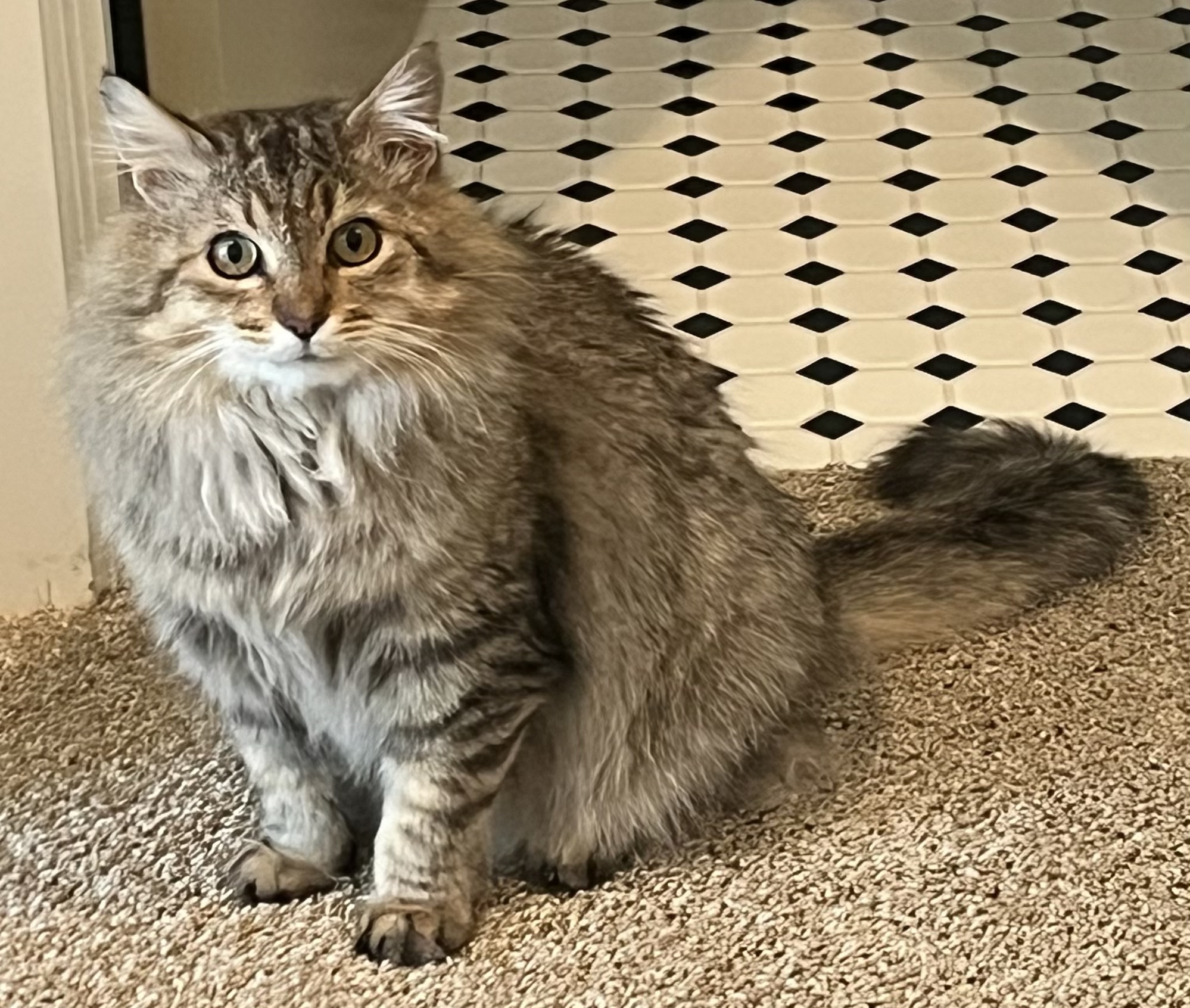 We bathed him, cut out his mats, and our good friends at Riverside saved his life. He has doubled his weight and his medium long coat is growing back He is a beautiful boy who purrs for pets. He is still on the shy side, but will push his head into your hands for love.