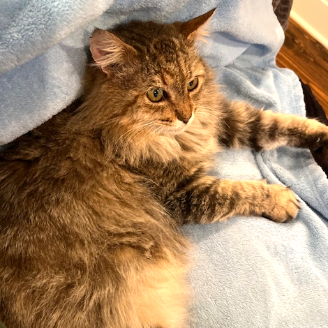 I will skip food for pets anytime! I love my new brush! I like a soft blanket where I can observe the world. I don’t like surprises or if you move too quickly. I’m very cautious so when I explore, I’m very “stealthy!” When the day is over, I crawl into bed with my foster Mommy for a good night’s sleep!
