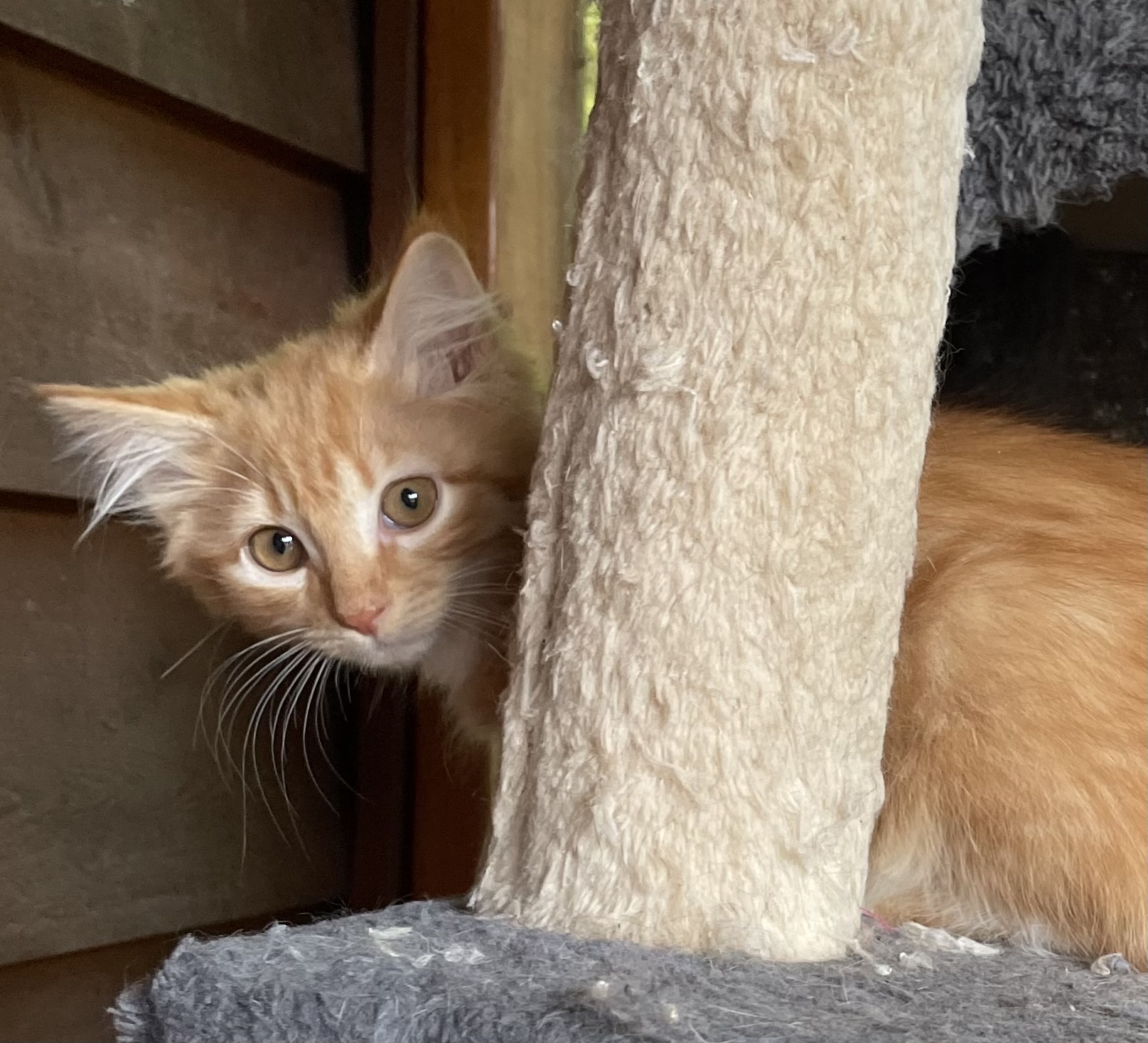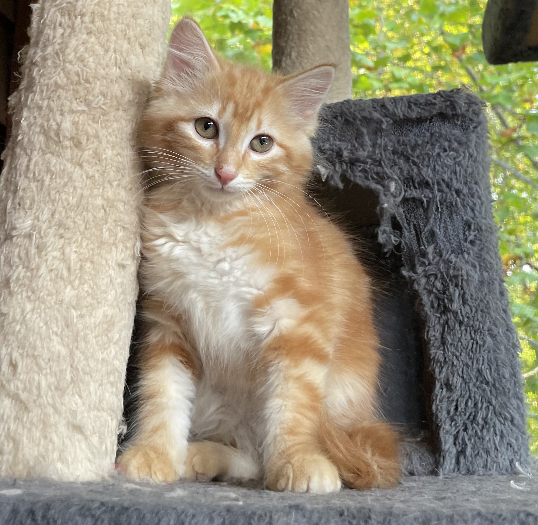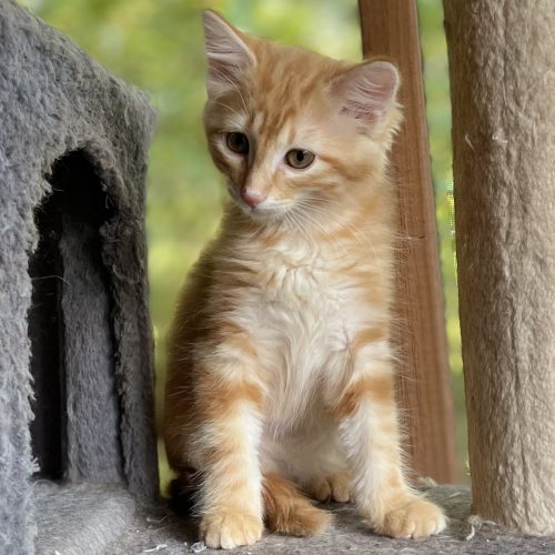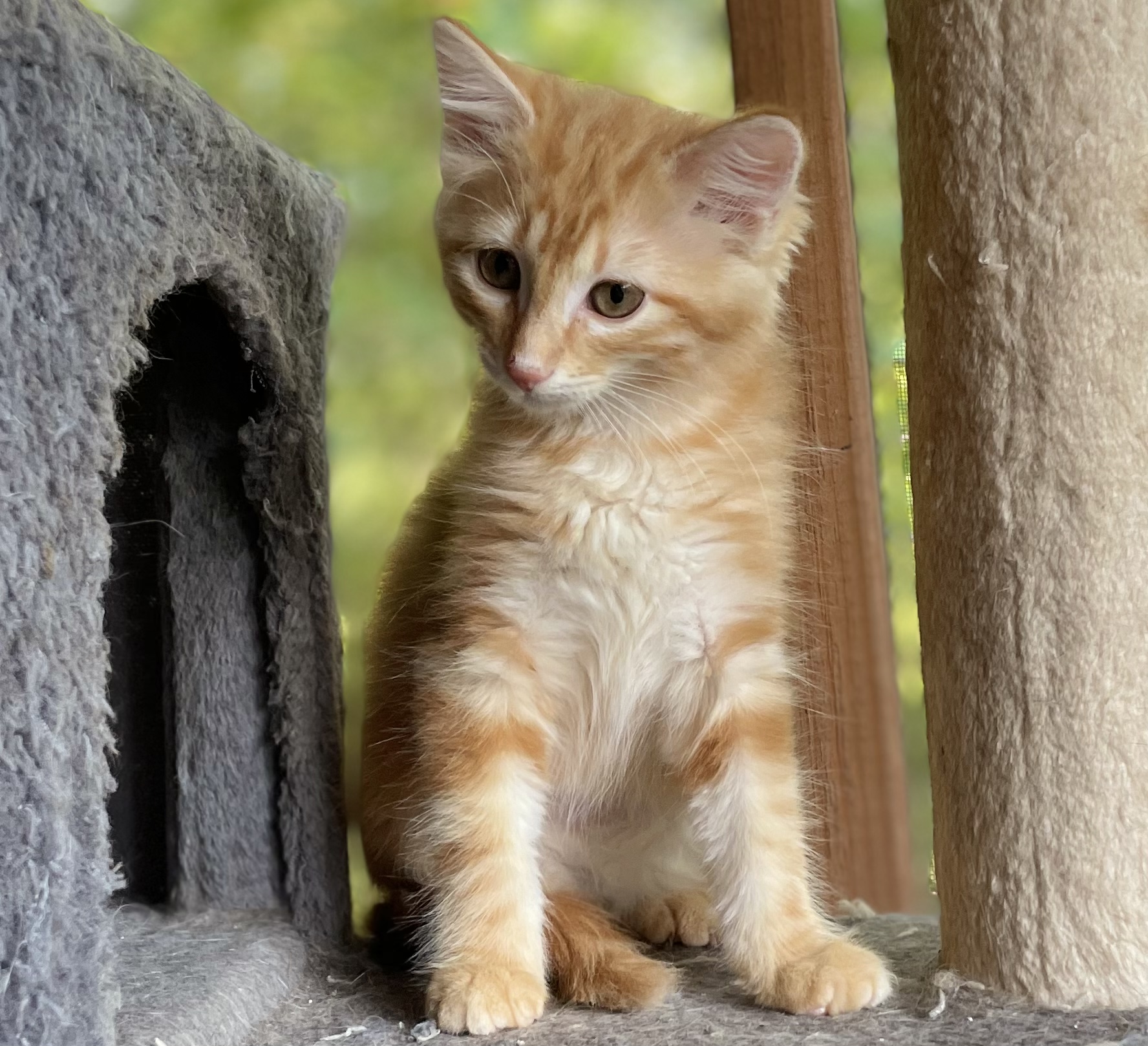 Carrot Top is an energetic, orange tabby with a curious spirit that perfectly matches his fiery orange fur. His big personality turns every day into an adventure. He loves playing with his siblings and lounging in the window for some afternoon sun.