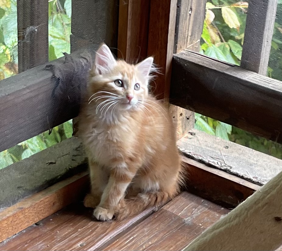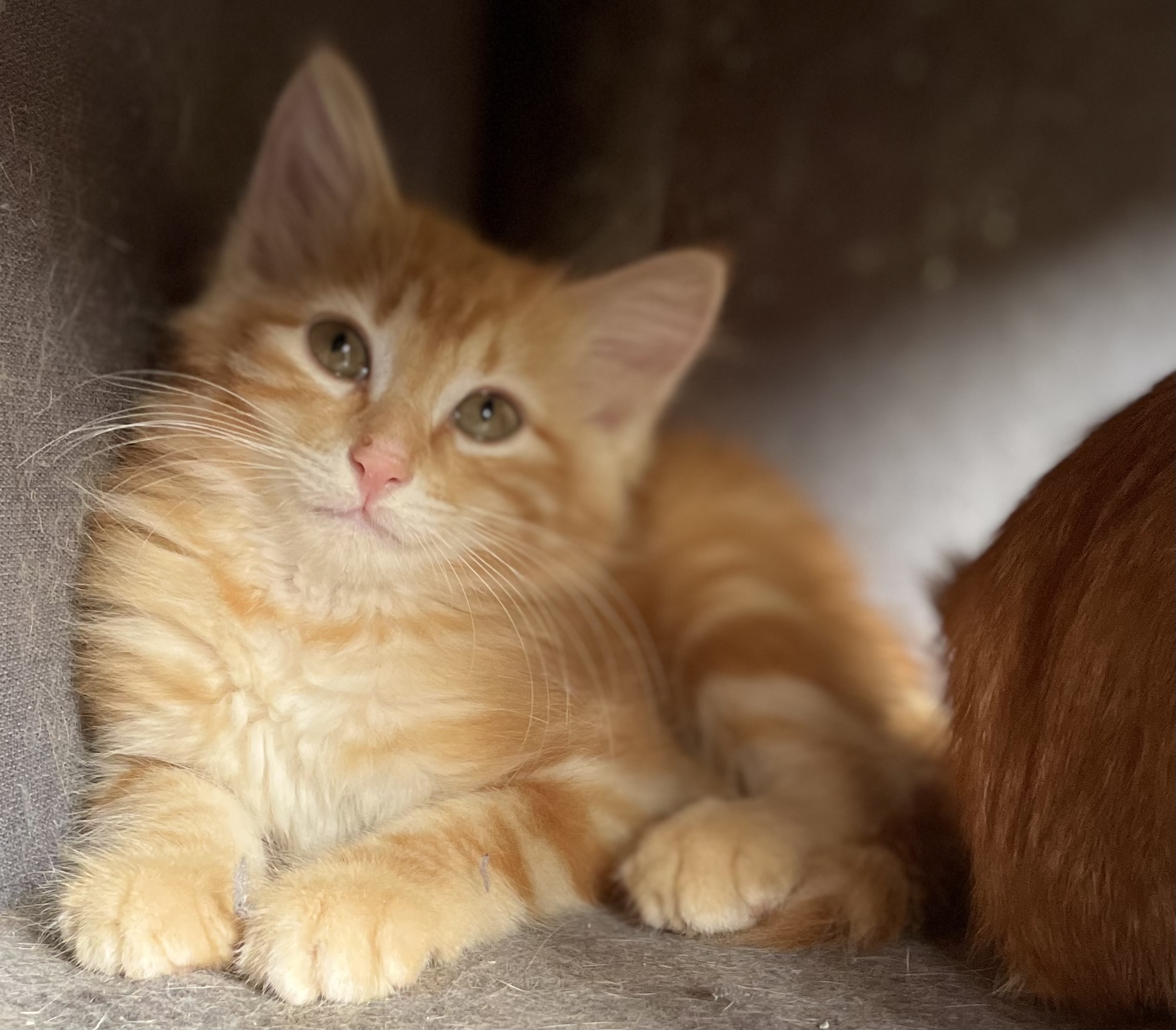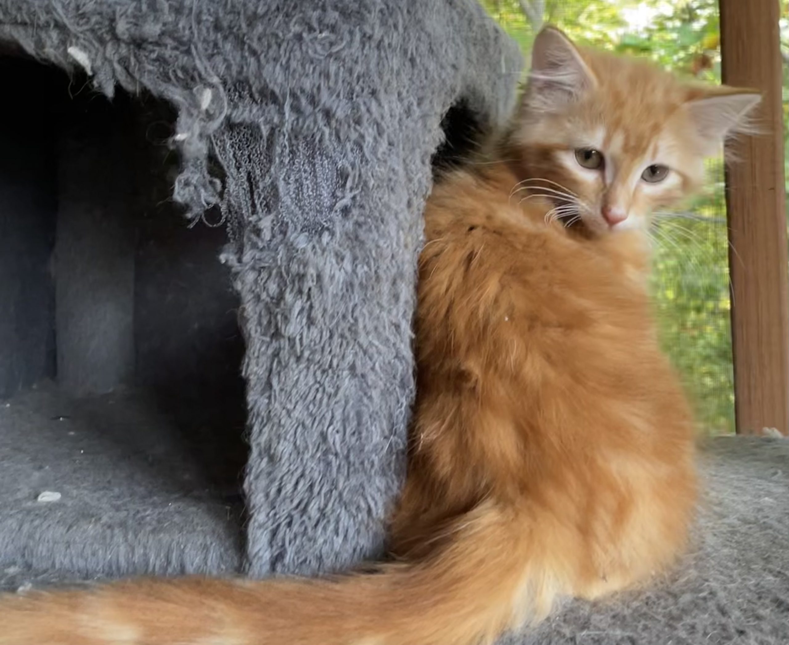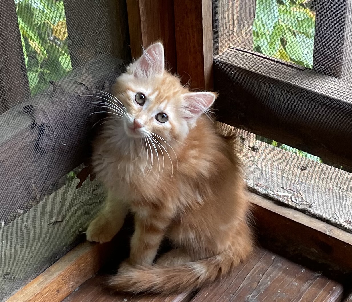 Carrot Top is an energetic, orange tabby with a curious spirit that perfectly matches his fiery orange fur. His big personality turns every day into an adventure. He loves playing with his siblings and lounging in the window for some afternoon sun.