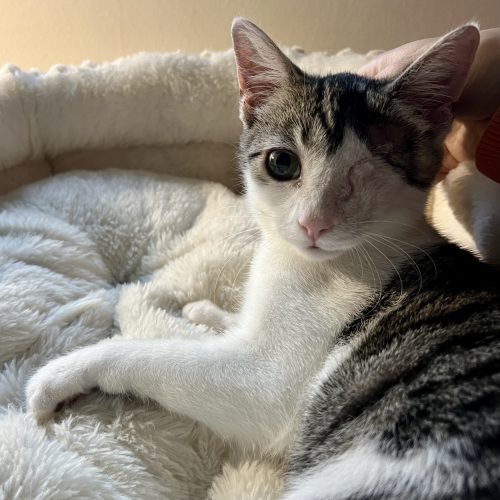 Catastrophe (Tazz for short) is a playful and seriously cuddly kitten who happens to have one eye. His other eye had to be removed due to a severe infection, but he doesn’t let it slow him down at all. He is quick to fall head over heels in love, and will be purring and cuddling in your arms as soon as he gets an opportunity. He is good with other cats and would thrive in a multi-cat household, but could also be a solo kitty for an engaging, present owner. Despite having one eye he is a great playmate and has plenty of energy. If you’re looking for the perfect kitten, look no further! Tazz spent two weeks in an e-collar (cone) and was an absolute gentlemen about it. He’s very adaptable and just loves life.