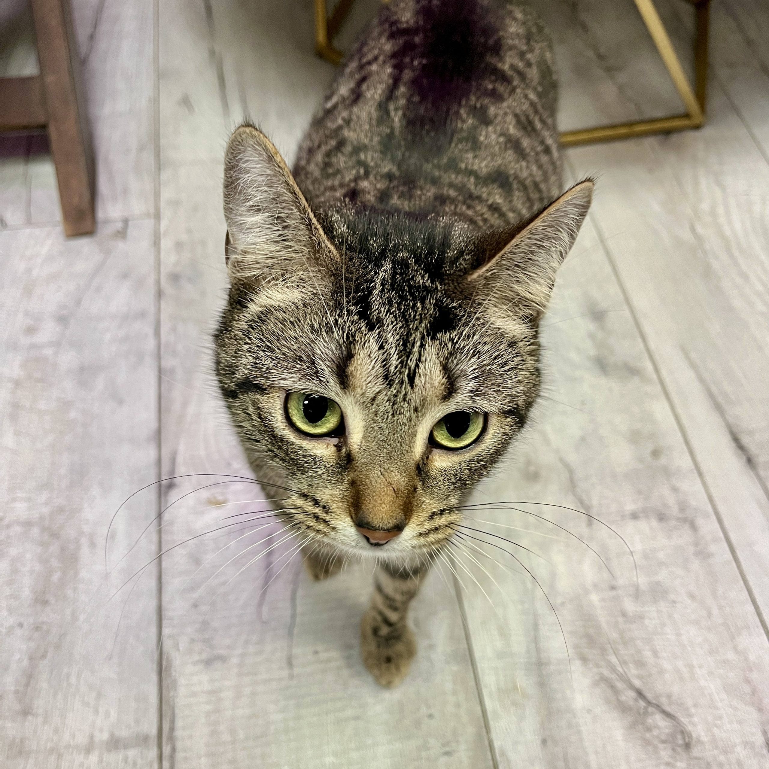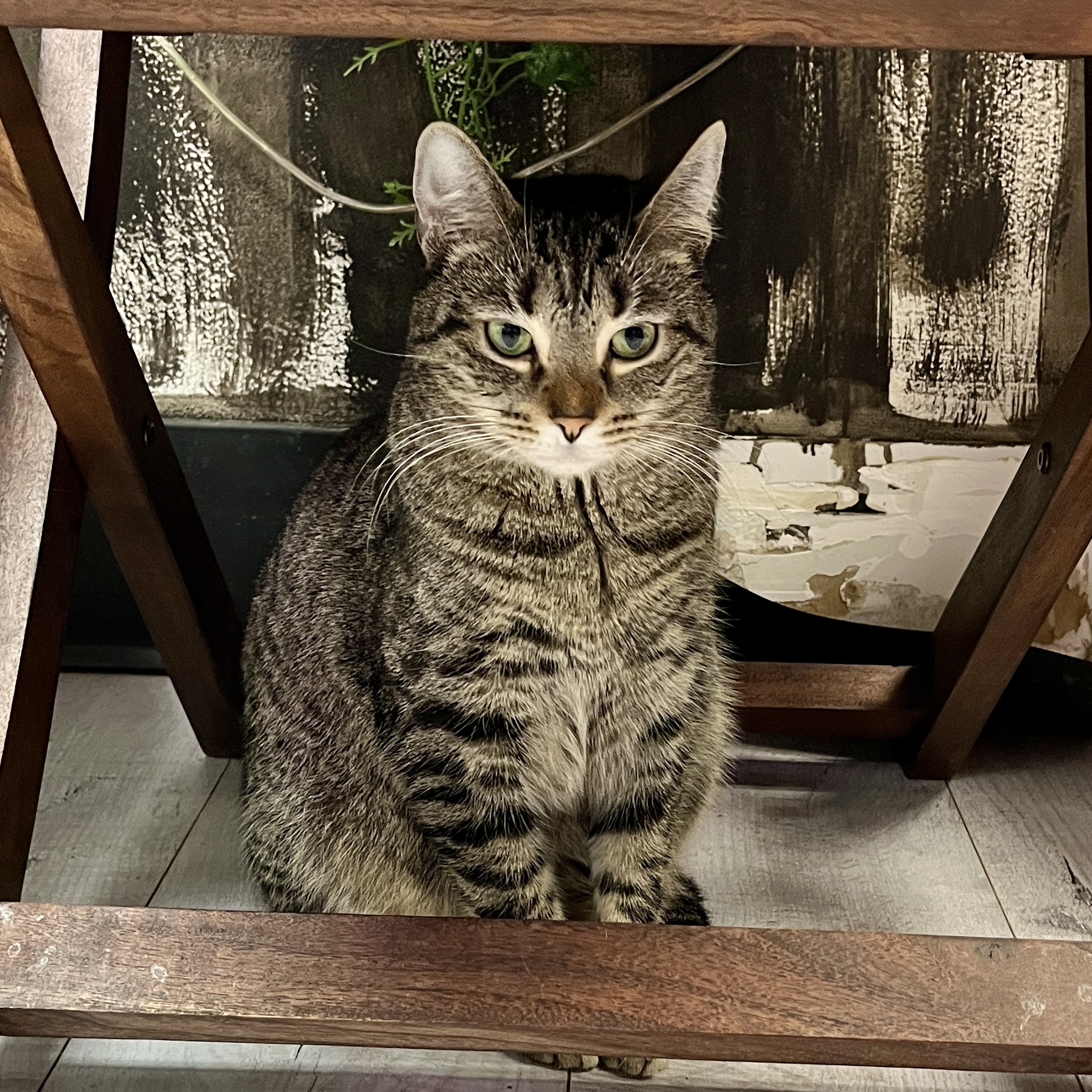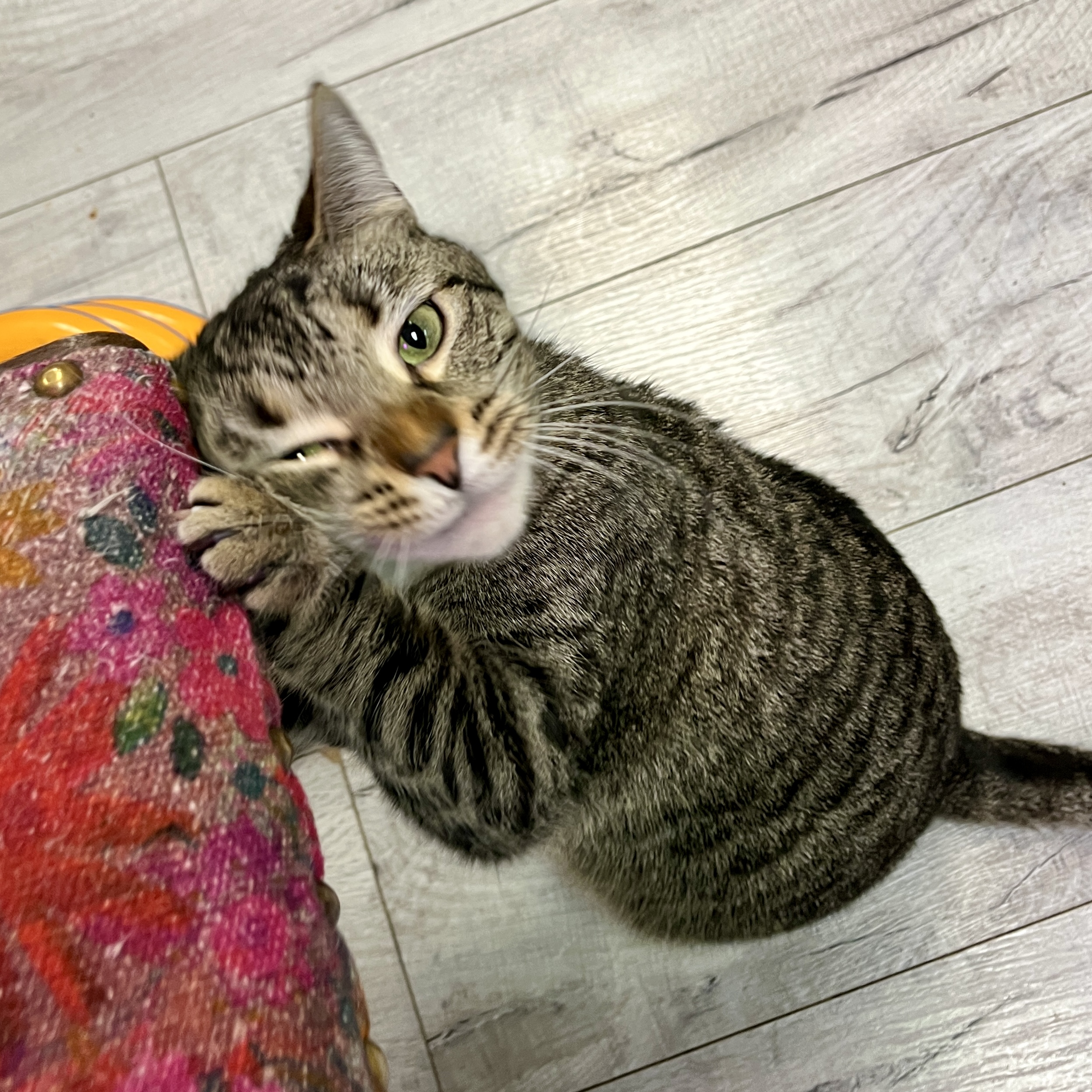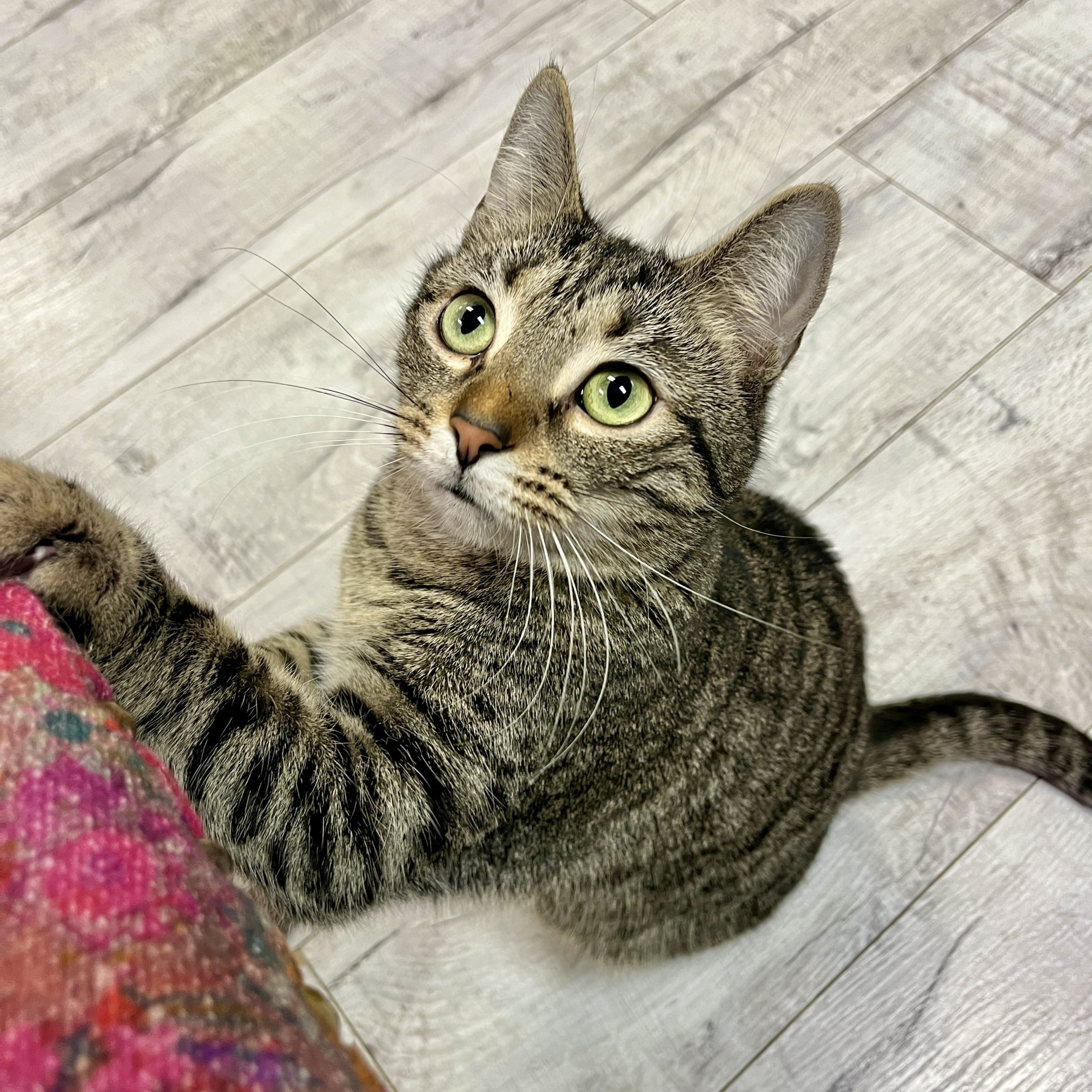 Earhart may be a tiny girl, but she’s got a huge personality packed into her little frame! She’s playful, silly, and always plotting her next sneaky move (whether that’s scratching the walls or sneaking up for a surprise cuddle.) You can usually find her in her favorite chair or couch ready to snuggle! And when she wants attention? She’ll make it very clear by reaching her paws up to you for a hug (seriously, it’s adorable). Earhart knows she’s a cutie and isn’t afraid to use it to her advantage. She’d prefer to be your one and only cat (or share the spotlight with one other!) And she’s happy with humans of all ages. Basically, if you’re looking for a cat who can keep you laughing and melt your heart, Earhart is your girl!