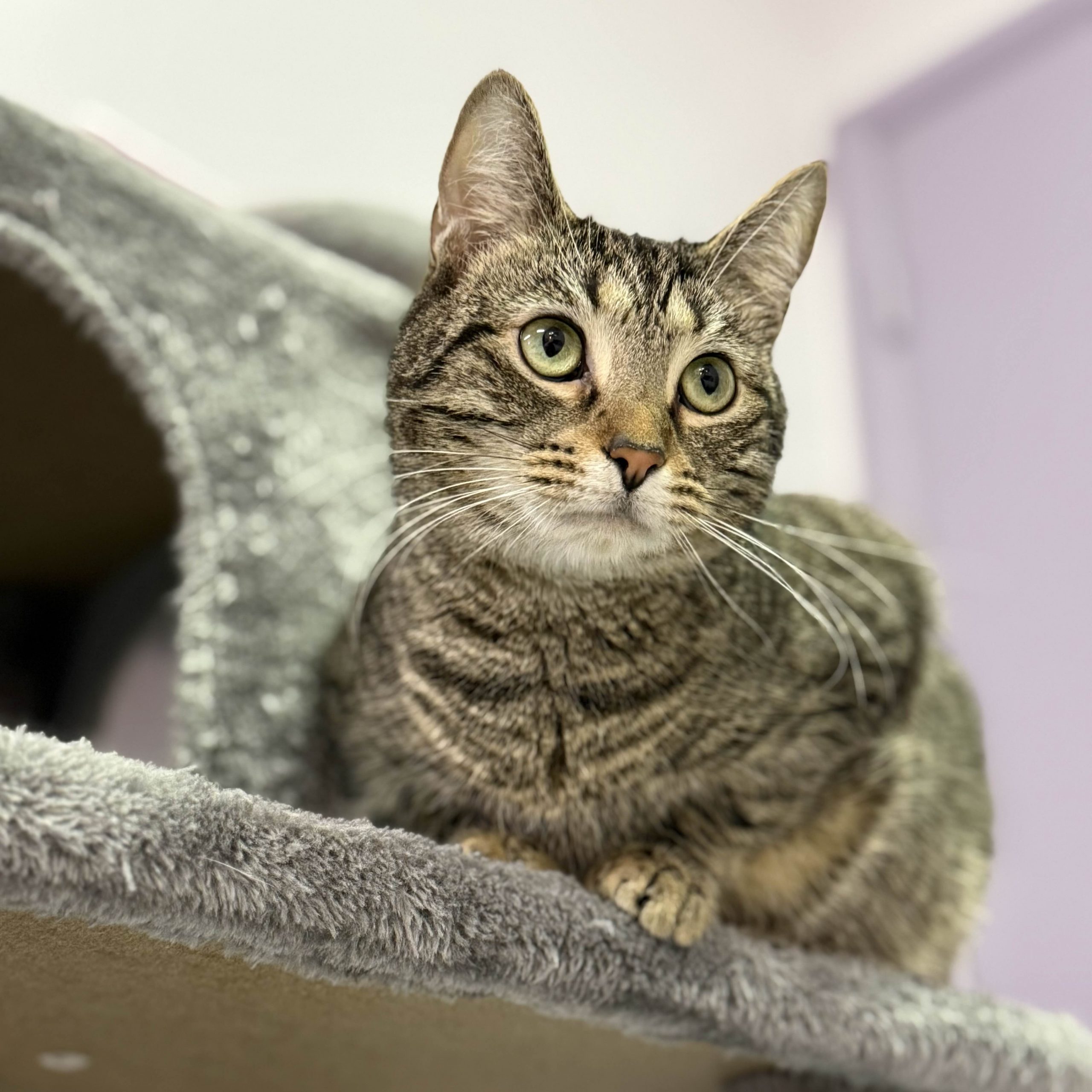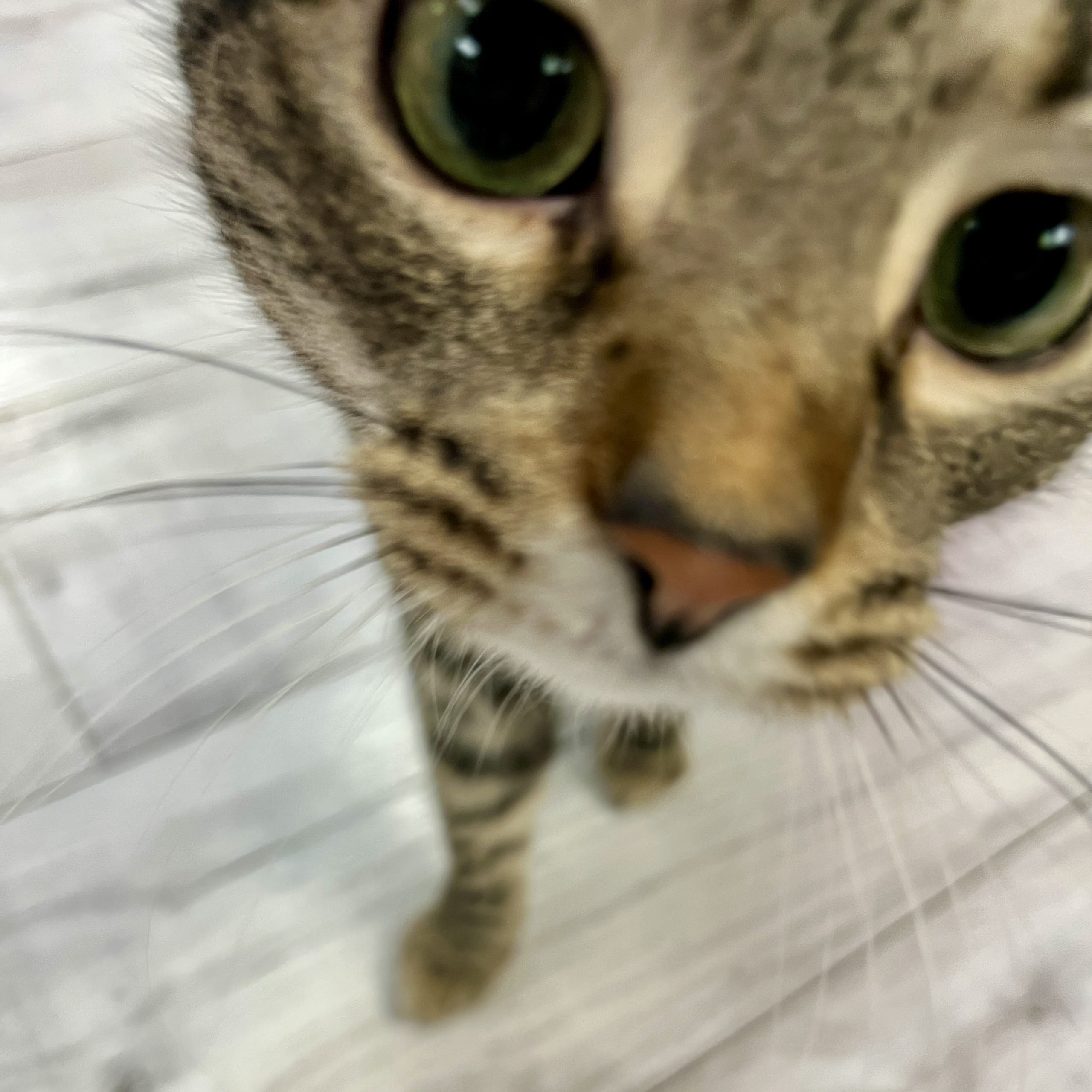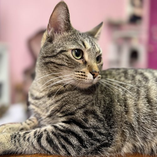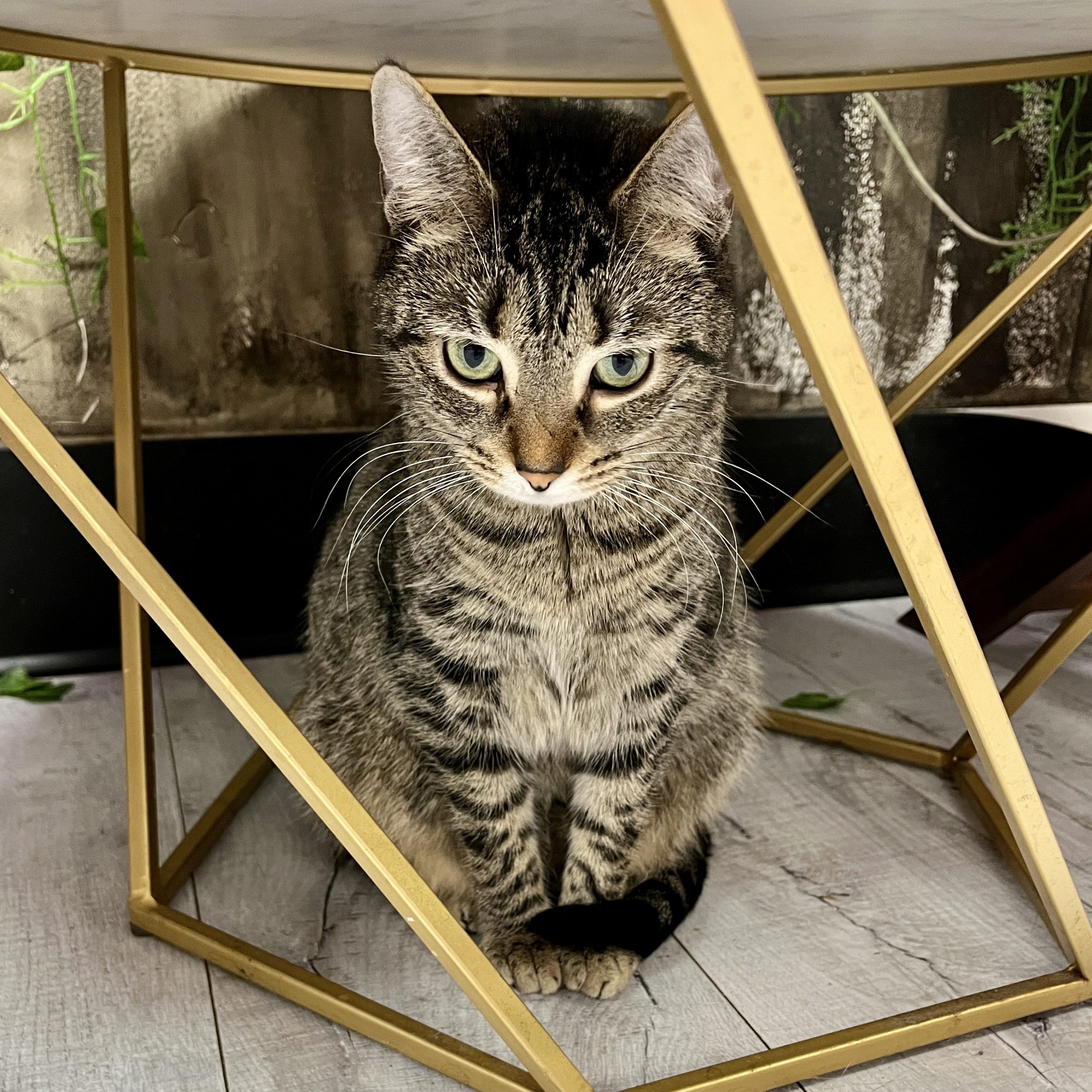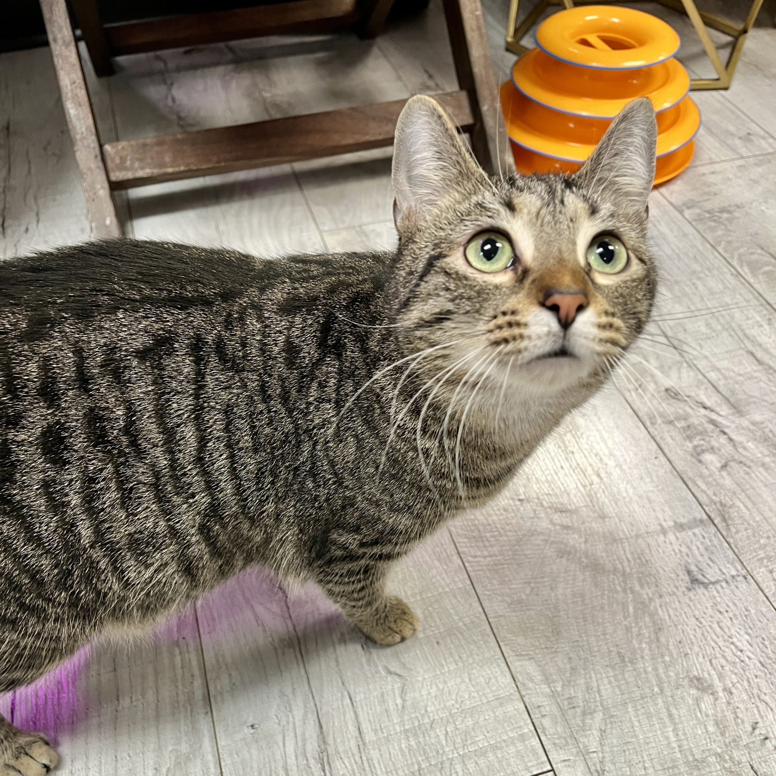 Earhart may be a tiny girl, but she’s got a huge personality packed into her little frame! She’s playful, silly, and always plotting her next sneaky move (whether that’s scratching the walls or sneaking up for a surprise cuddle.) You can usually find her in her favorite chair or couch ready to snuggle! And when she wants attention? She’ll make it very clear by reaching her paws up to you for a hug (seriously, it’s adorable). Earhart knows she’s a cutie and isn’t afraid to use it to her advantage. She’d prefer to be your one and only cat (or share the spotlight with one other!) And she’s happy with humans of all ages. Basically, if you’re looking for a cat who can keep you laughing and melt your heart, Earhart is your girl!
