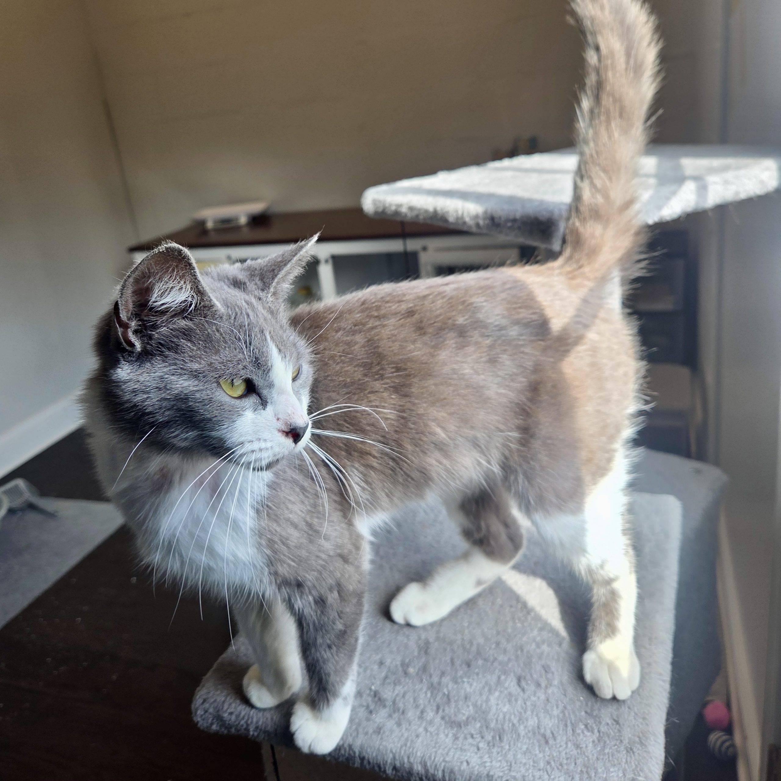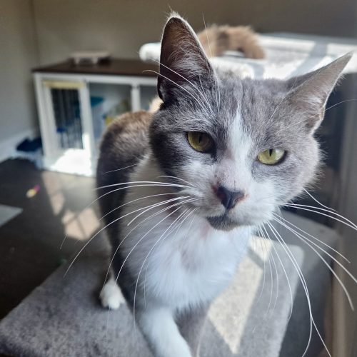 Cinderella is a sweet girl, ready to put the past behind her and blossom into the real princess she is. She is calm, loving, and she wants your attention but she wont bother you for it. She loves to sit on top of the cat tree and watch the birds outside. She has playful moments that last about 5 minutes and then she just wants you to pet her. She'll make biscuits on your legs and purr for more pets. She is a very easy going cat, and does well with the 3 other cats and 2 children under 6 in her foster home. She tolerates the dogs in her foster home but she would feel more confident without them around. Would you be her fairy godmother and give her a forever home? If the shoe fits, apply for her today!