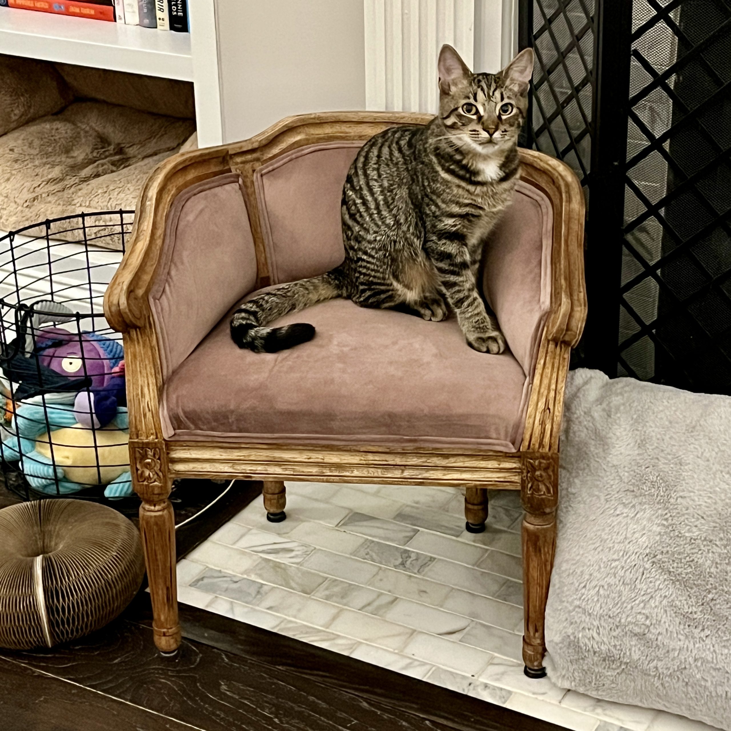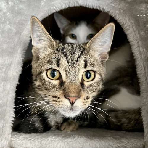 Dave is the little tabby brother in the duo with his bigger brother Krist. Dave really, really wants to be social and hang out with his humans, but since he was born outside, he’s still learning to trust. If you find him lounging on the cat tree, chances are he’ll welcome some bats and scratches and show off his elevator butt skills. He and Krist love toys and will race around the house chasing after them. The pair sound like a herd of elephants when they get going! The boys do fine with other friendly cats, but their ideal forever home would be canine free. Older kids with cat experience would be ok too.