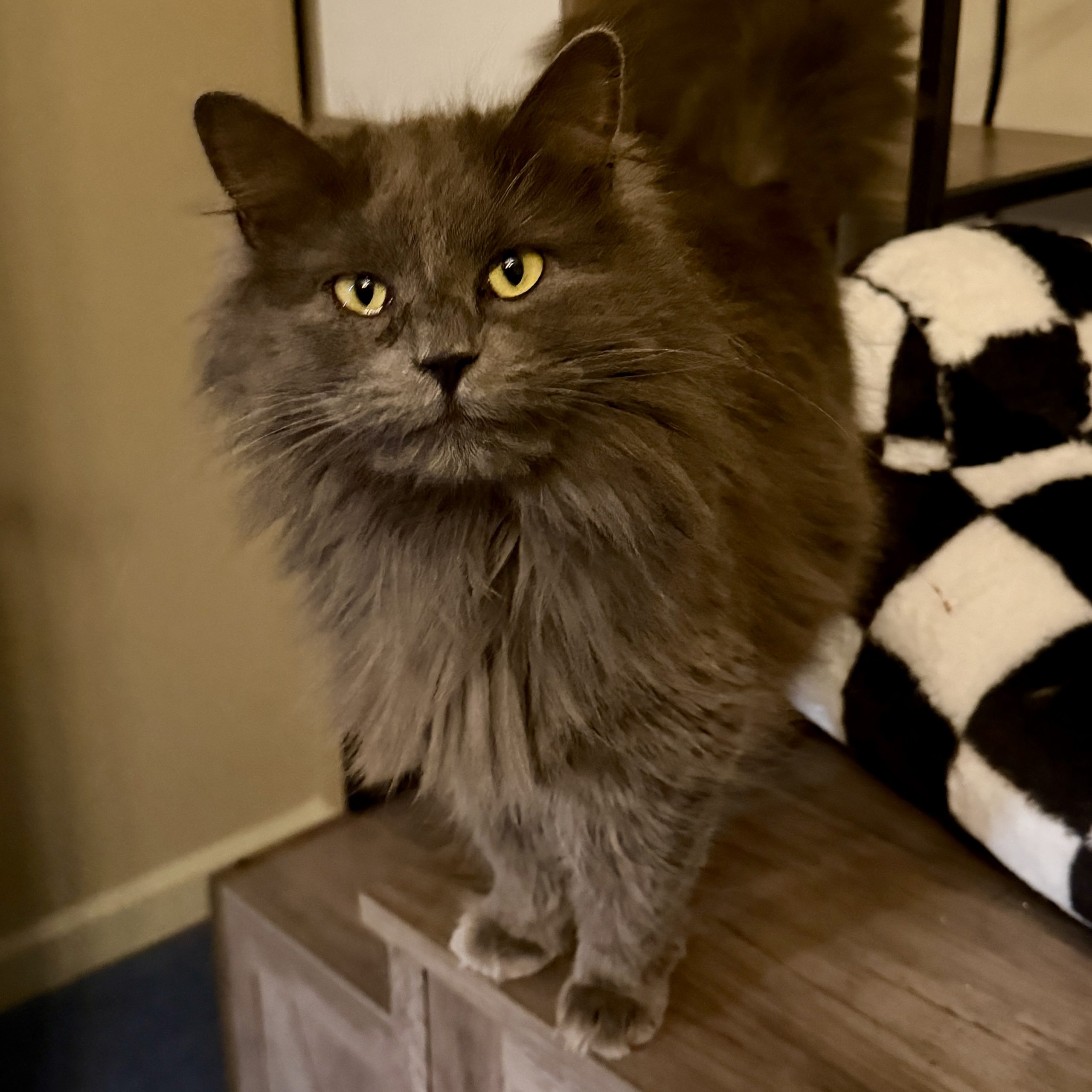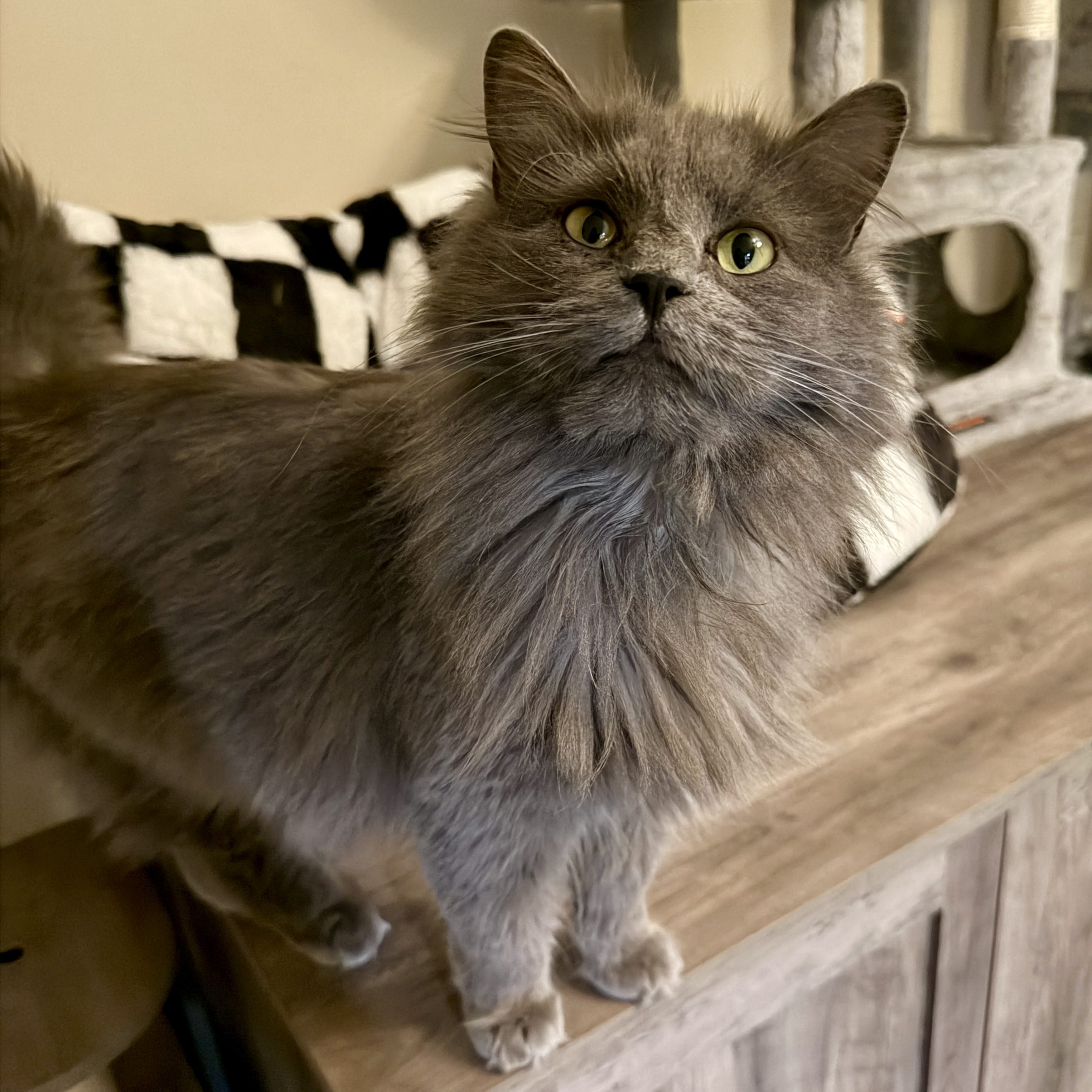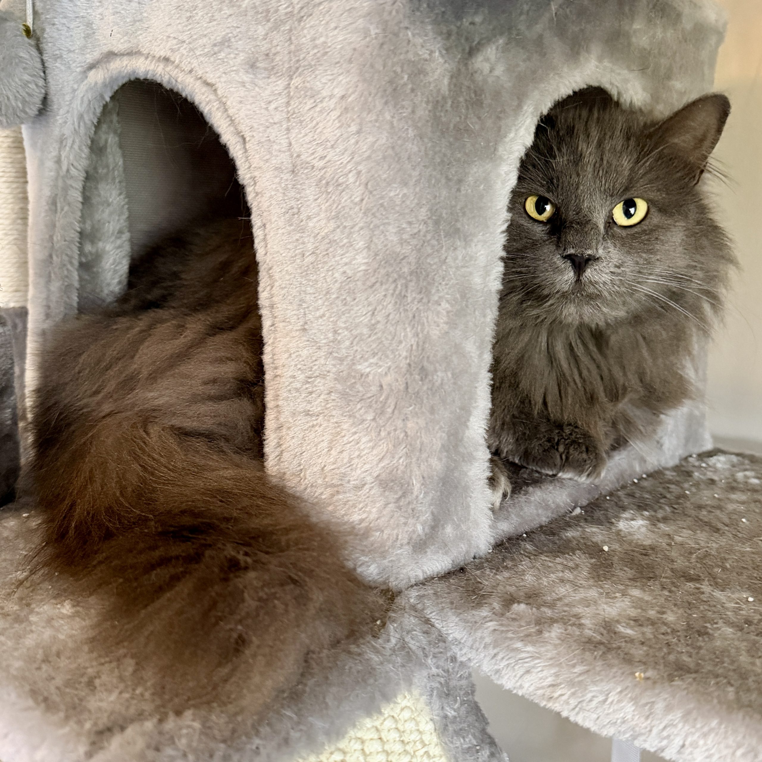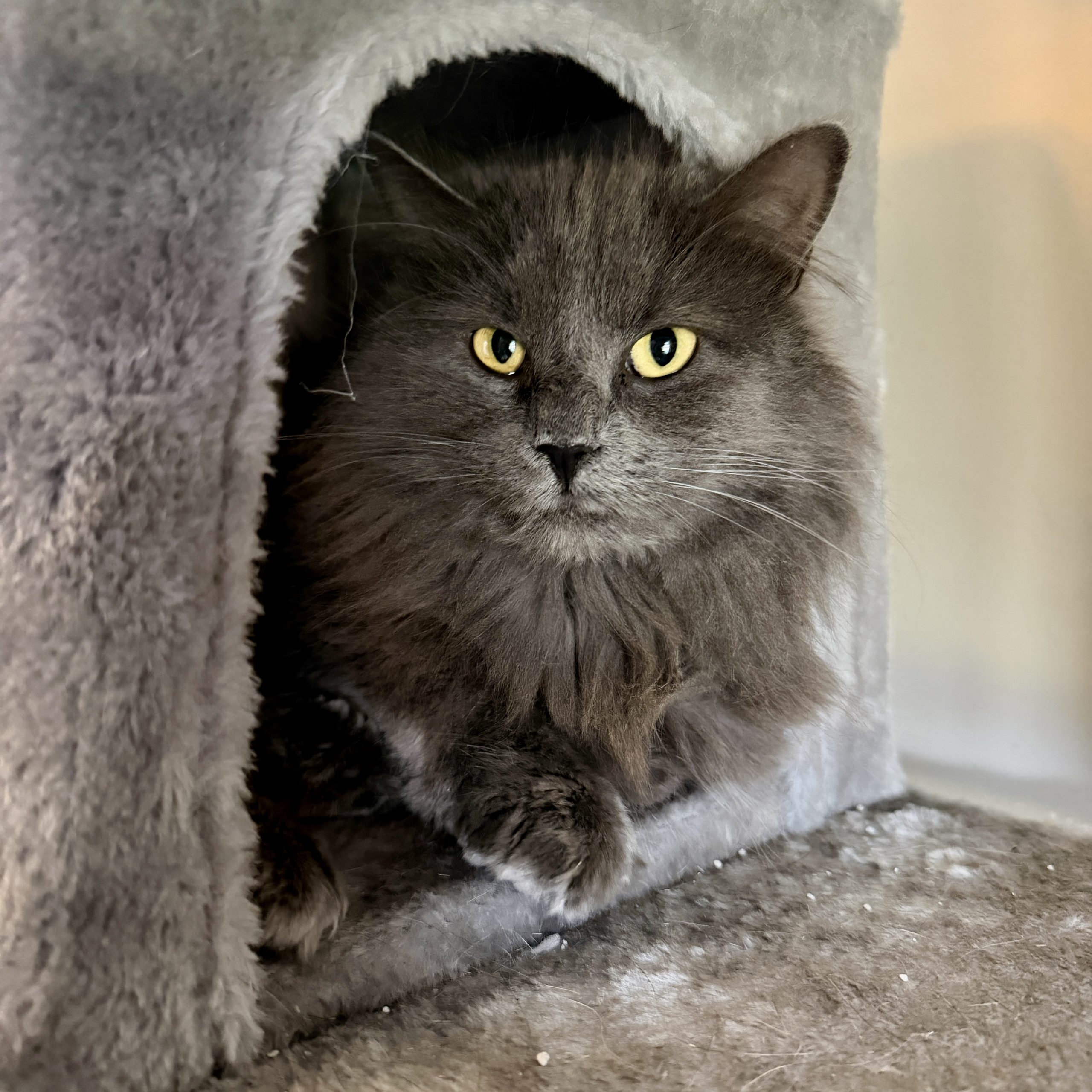 Eloise is a fluffy happy cat with a bit of a cranky face. When she first got to her foster momma’s house, she was a bit concerned that Eloise was actually cranky, since she was a little growly. Eloise continued to growl, though, while making biscuits, so we think it’s just her way of chatting first. Eloise seems indifferent to the other cats in her foster home and doesn’t mind the cat-savvy dogs either. She enjoys hanging at the top of the cat tree, reigning over her territory like the queen she is.