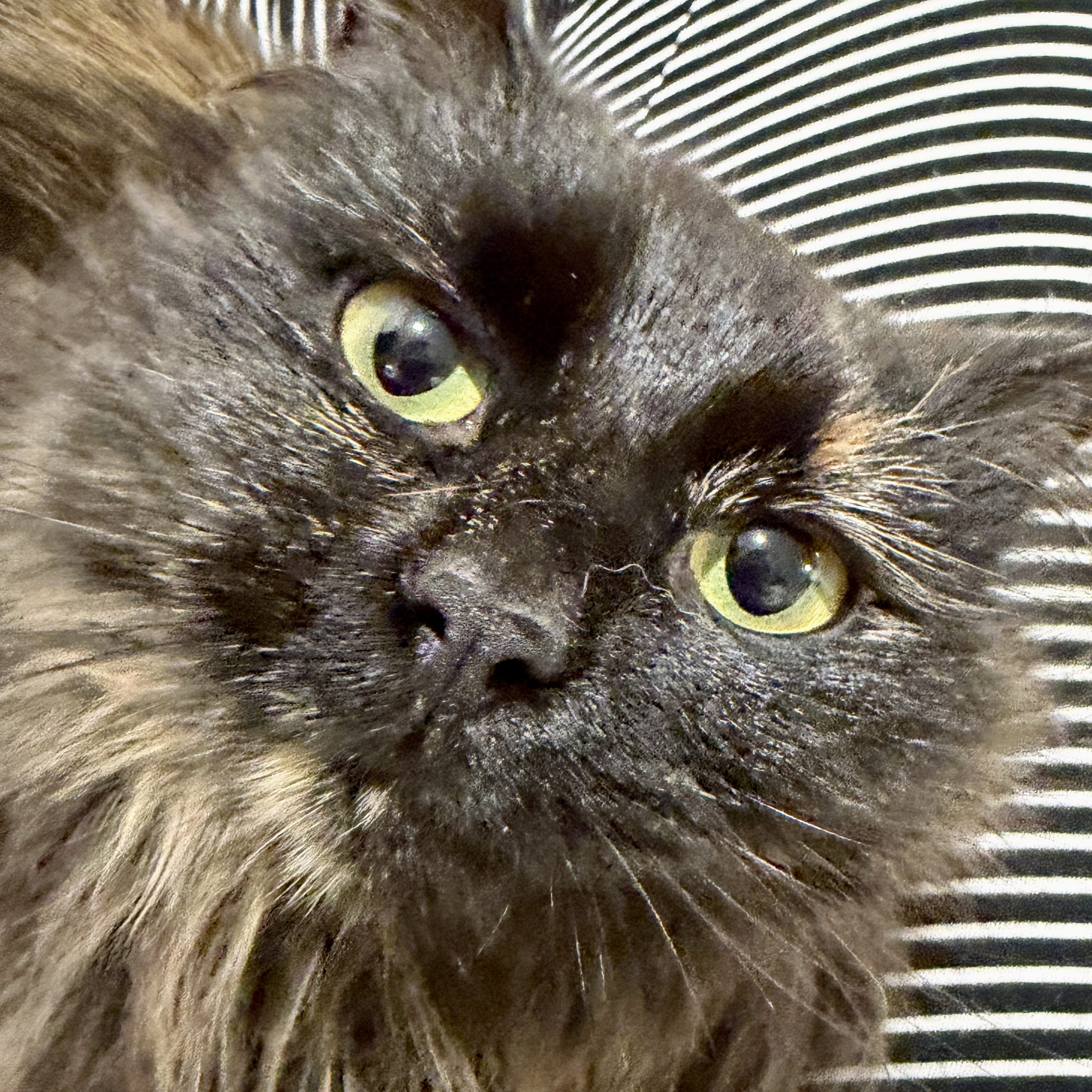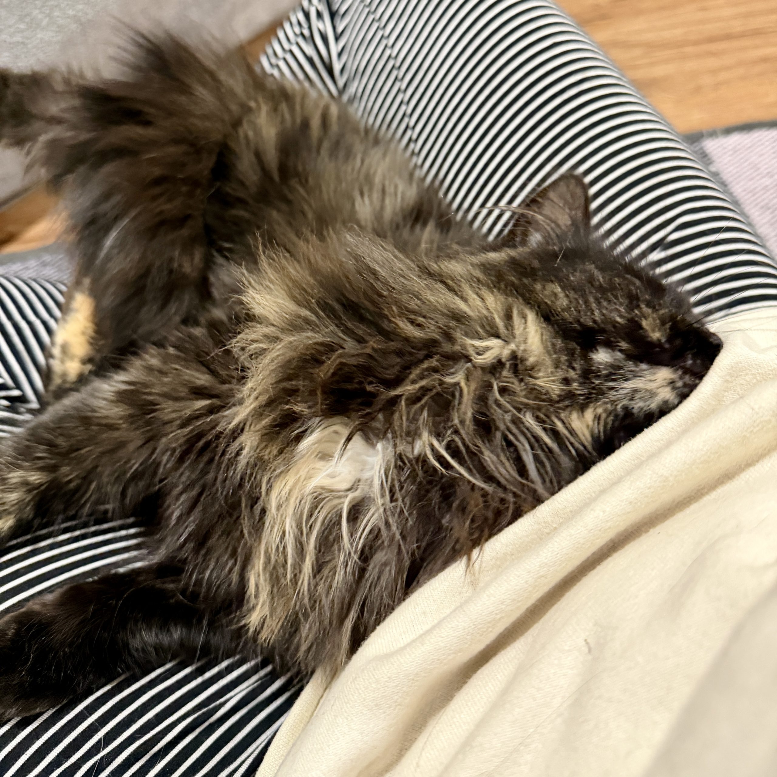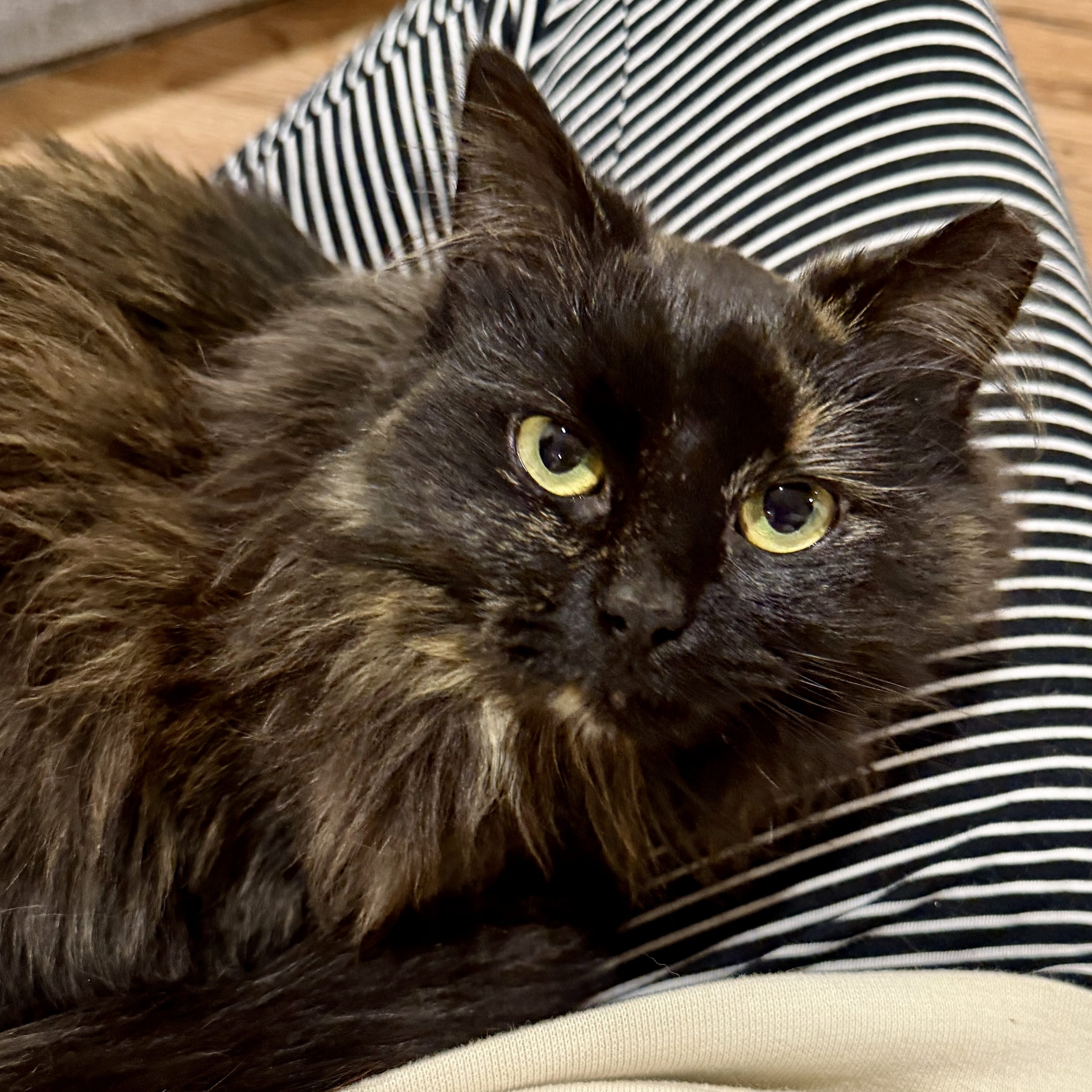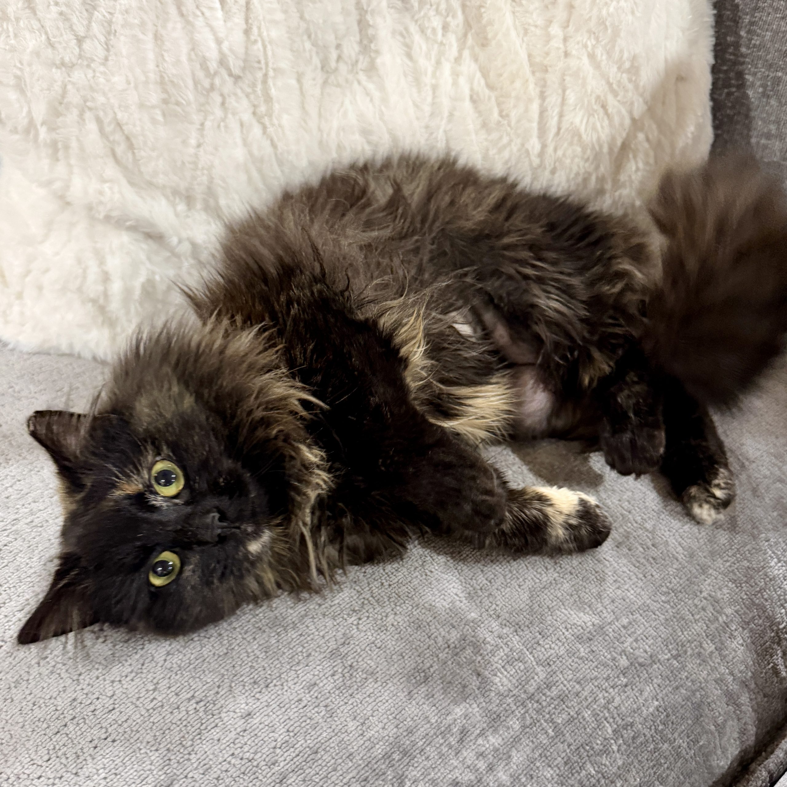 Freesia is a beautiful long-haired tortie… with the opposite of that traditional tortie attitude! She’s shy at first, preferring you approach her calmly and quietly. Once you reach her, though, there’s nothing quiet about her purrs! At first we thought she might be feral (which is why her ear is tipped!), but there’s nothing feral about her little loud motor. She also makes the cutest biscuits with her fluffy paws! She also loooooves belly rubs and will happily roll over in preparation. She came to us with a fair amount of mats (some were still working out), but this angel of a cat purred the entire time while we brushed them out! Freesia does fine around other cats, seems suspicious but ok with dogs, and would do best with older, cat-savvy kiddos.