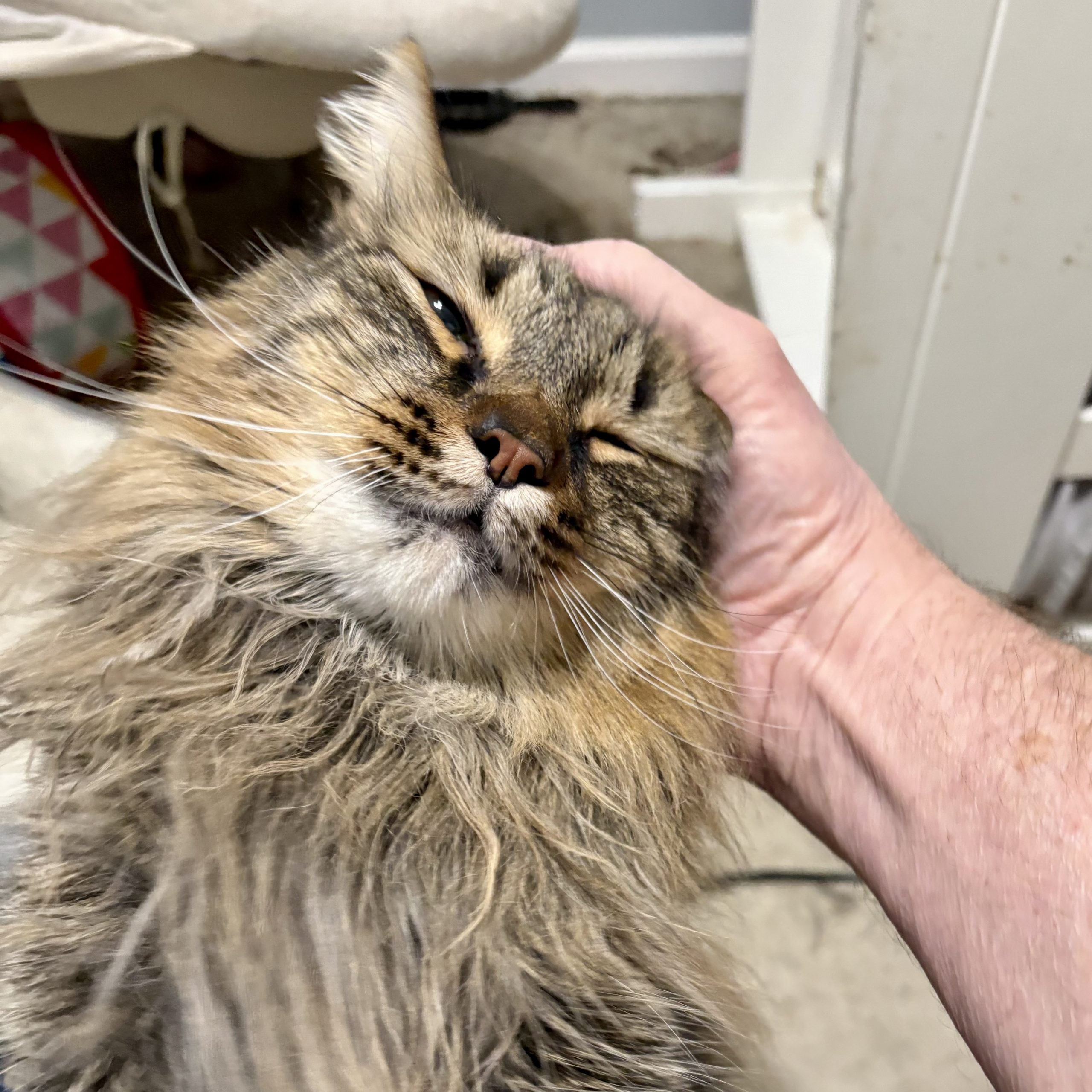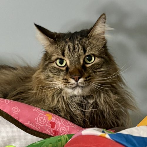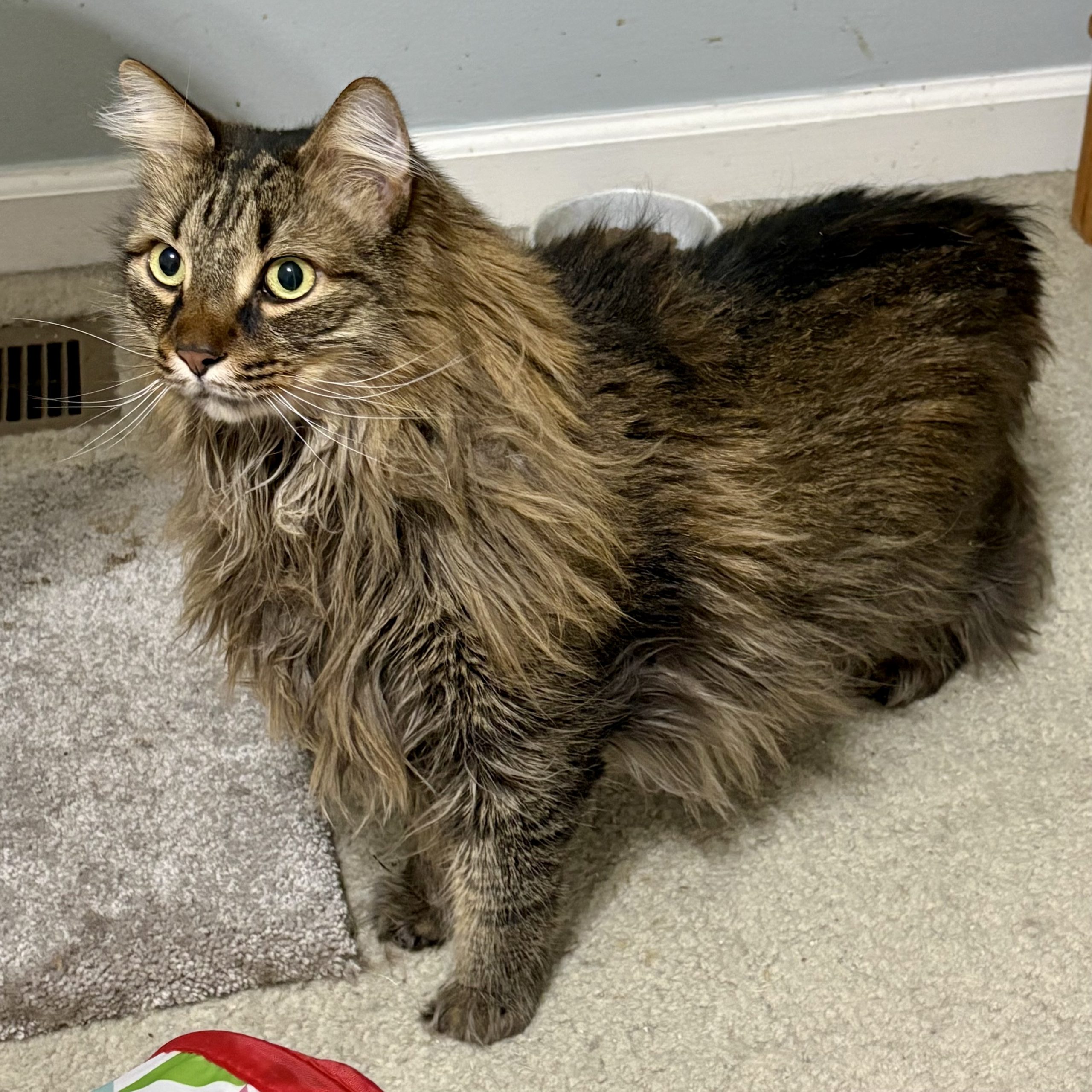 Hank and his sister Lucy were adopted from us as small kittens, but recently their adopter had a change of circumstance and returned them to us. Both are clearly confused and don’t understand why they’re not home. They’re timid around new people, and new situations make them very nervous. Once they’ve had time to settle in and decompress, Hank is the more social of the two. He loves a good head scratch! Lucy will take longer to trust, but it will be worth it when you see her explore her surroundings. Both will receive a haircut before being adopted; their coats have some unfortunate mats right now. They need to be adopted together into a home with no other animals or kids.