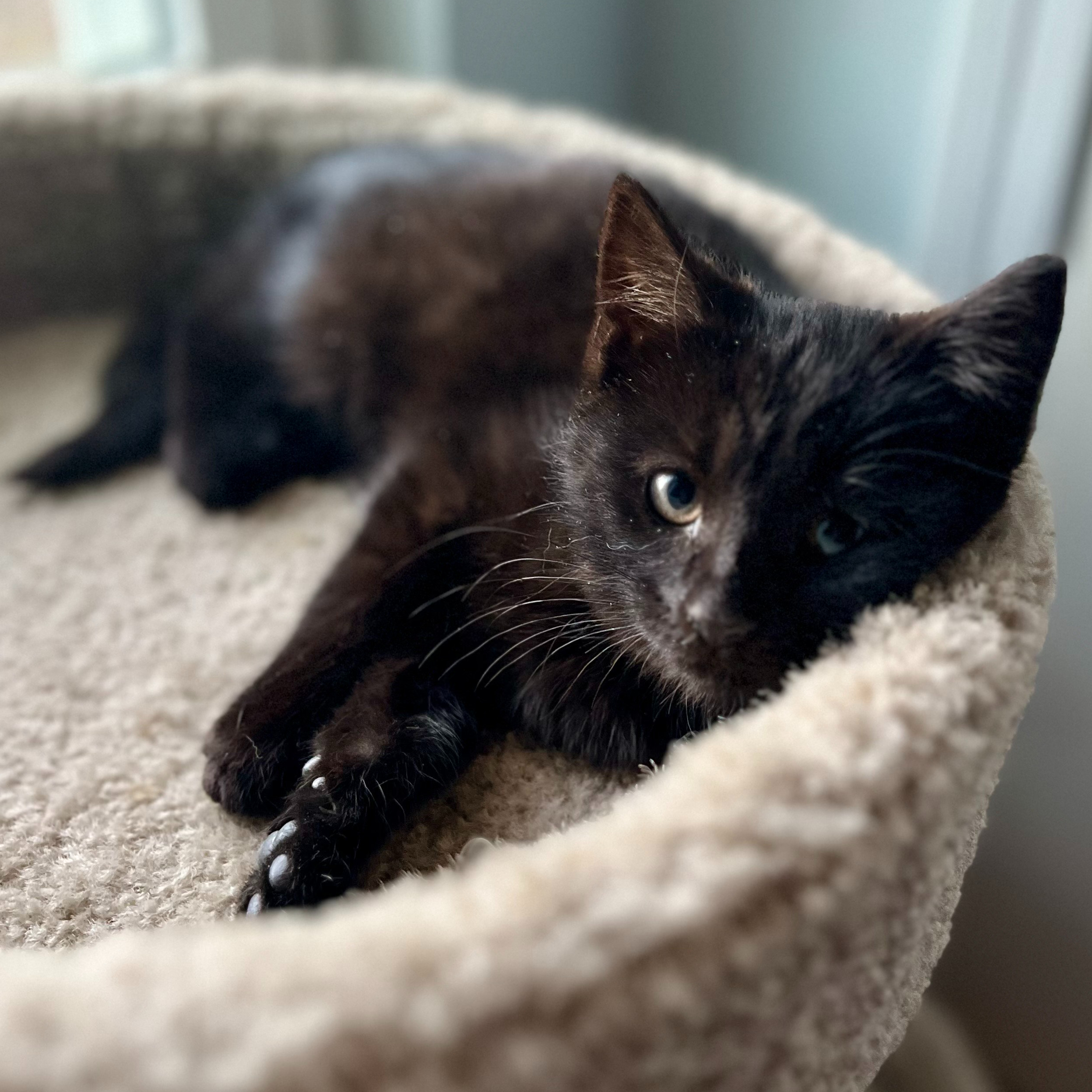 Hershey and his brother Godiva (yes, Godiva is a boy!) and mom Tootsie were rescued from behind a business in Maryville. They were friendly from the get go, so it is hard to say why they ended up there....we assume they were dumped. The brothers are very playful and love to sleep together. It would be so great for this little family to be adopted together.