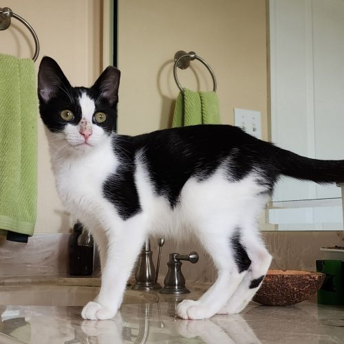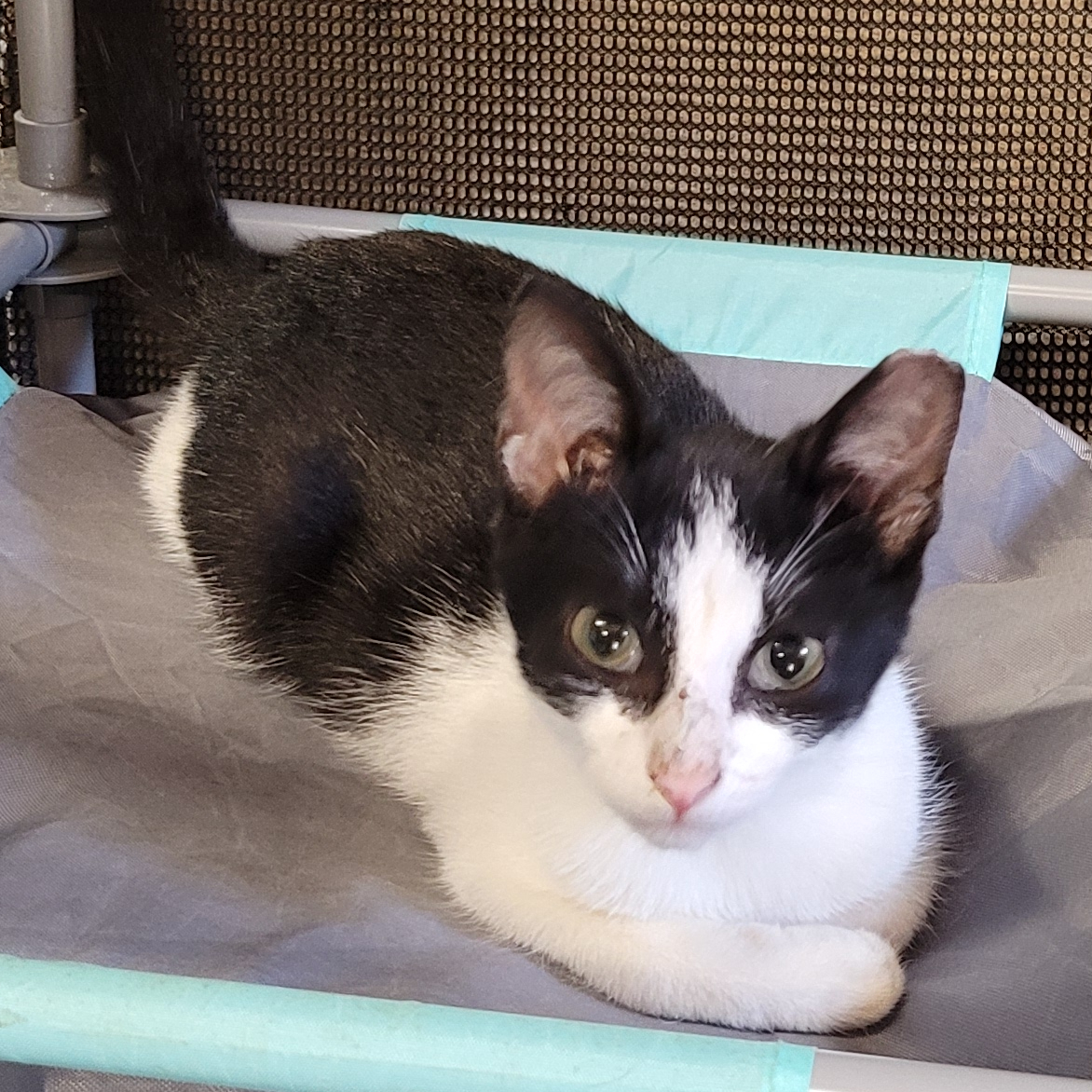Hitch hid under the seat in our trapper's car during a TNR effort and hitched a ride to the good life! He's a very sweet boy. He absolutely loves other cats and would do best in a house with another friendly cat. He loves bringing stuffed mice to life and playing with pretty much all the toys. He has excellent litter box manners!