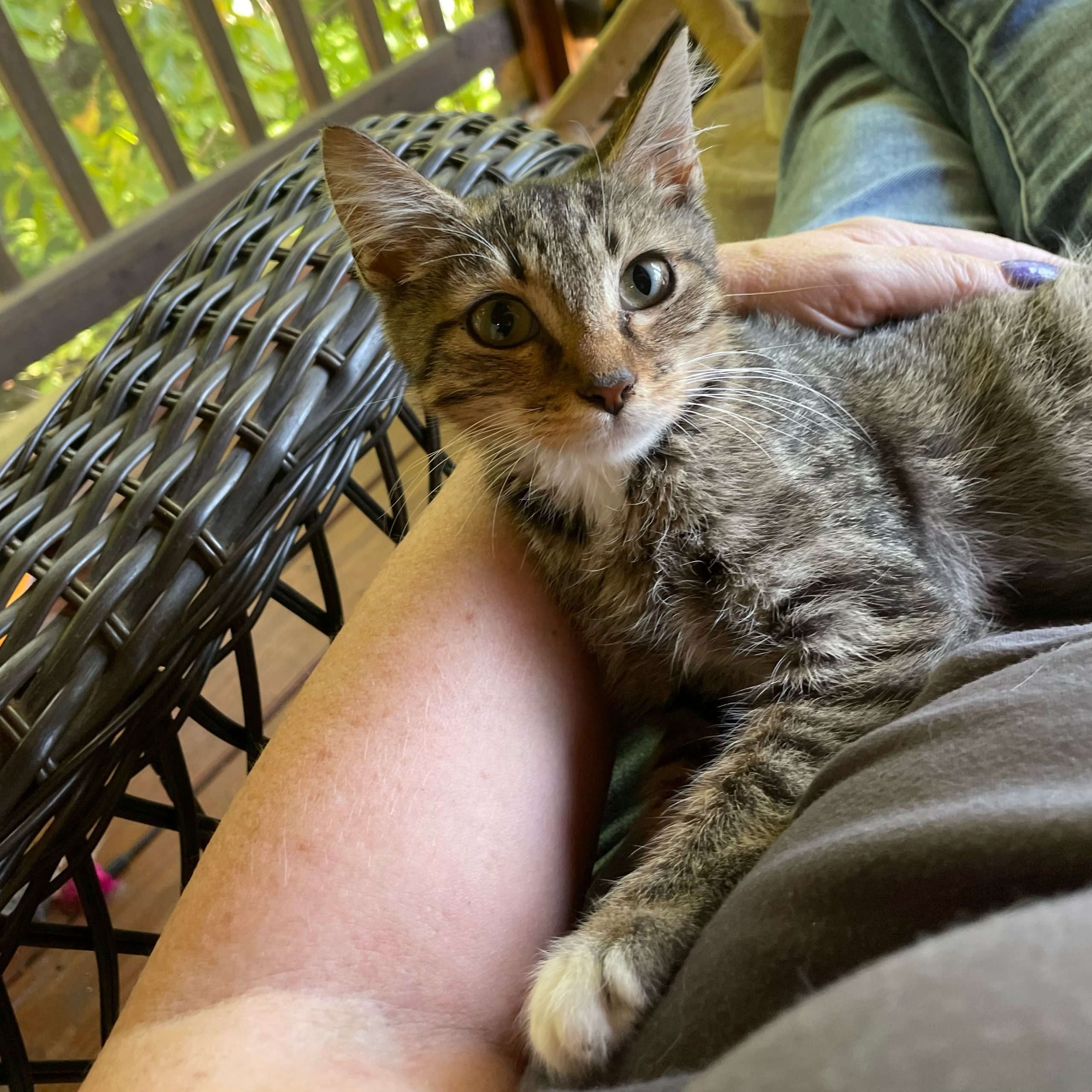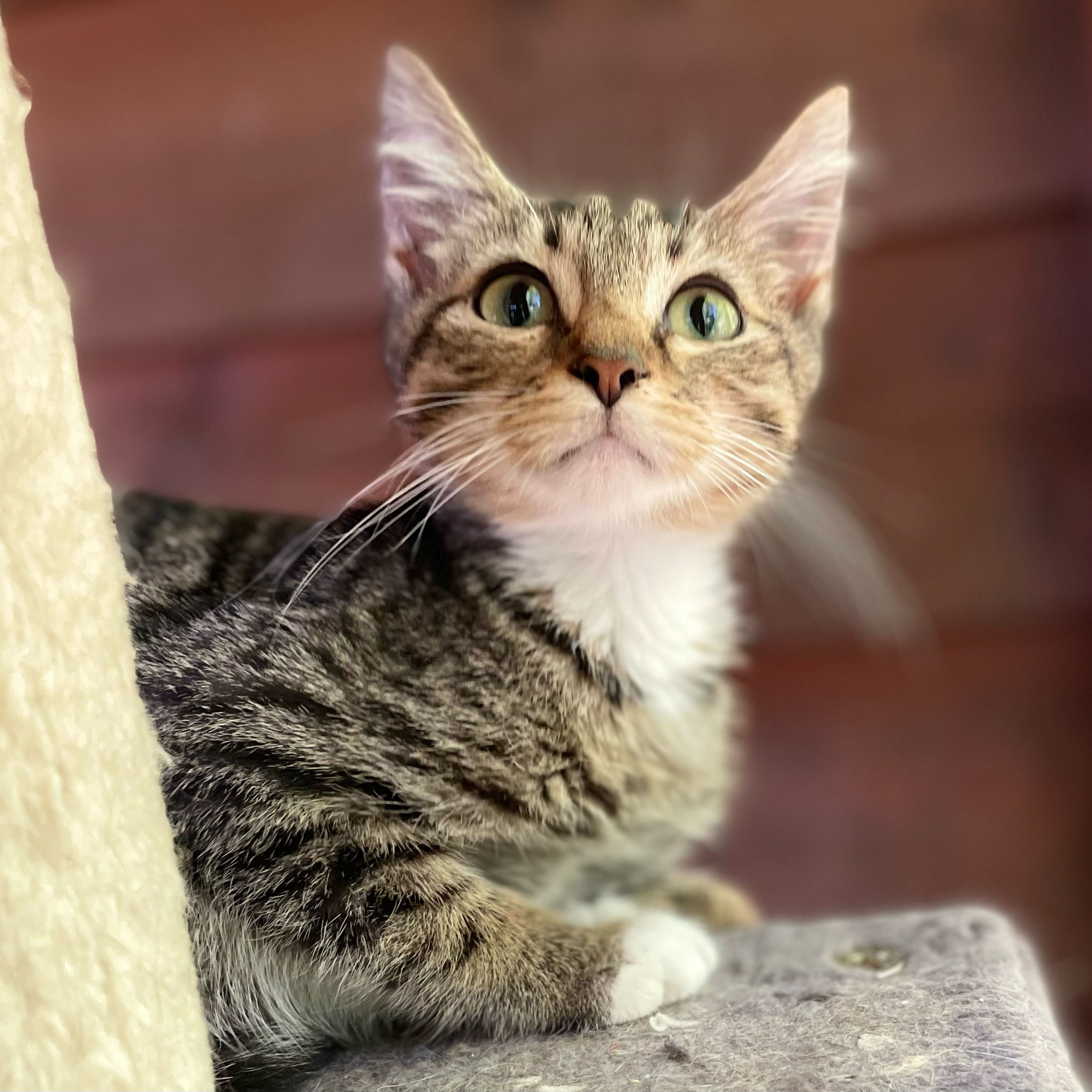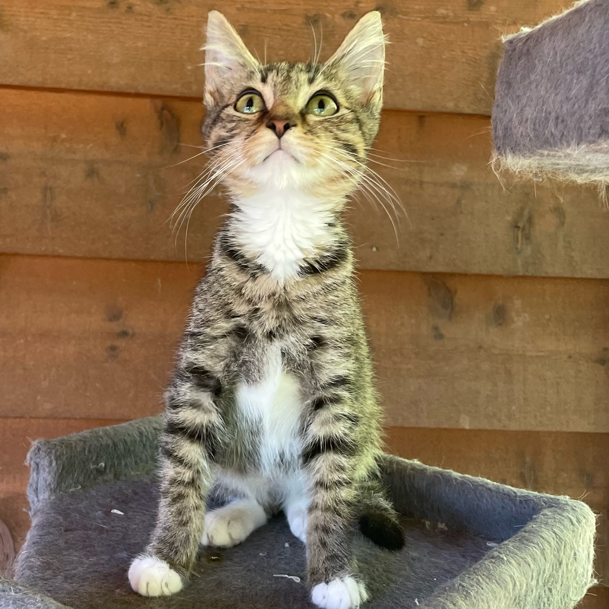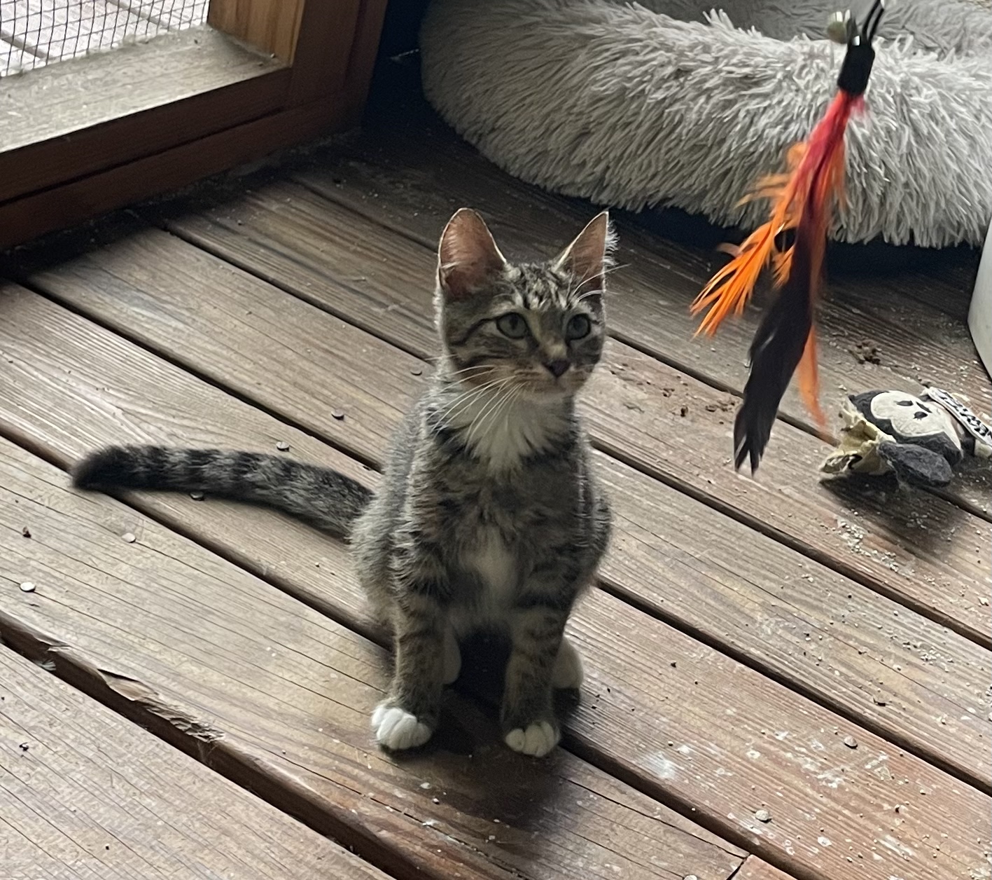 Hi, I'm Hotshot! Life started tough before I was rescued during a TNR event; I was outside, always hungry, and not feeling well because of worms. But I'm a brave kitten and I've kept my sweet, cuddly nature. I love snuggling up with anyone who has a warm lap and a gentle touch. I've learned a lot about love and trust here, and I dream of a forever home where I can share all the affection I have. If you're looking for a courageous companion who loves deeply, I'm your guy!