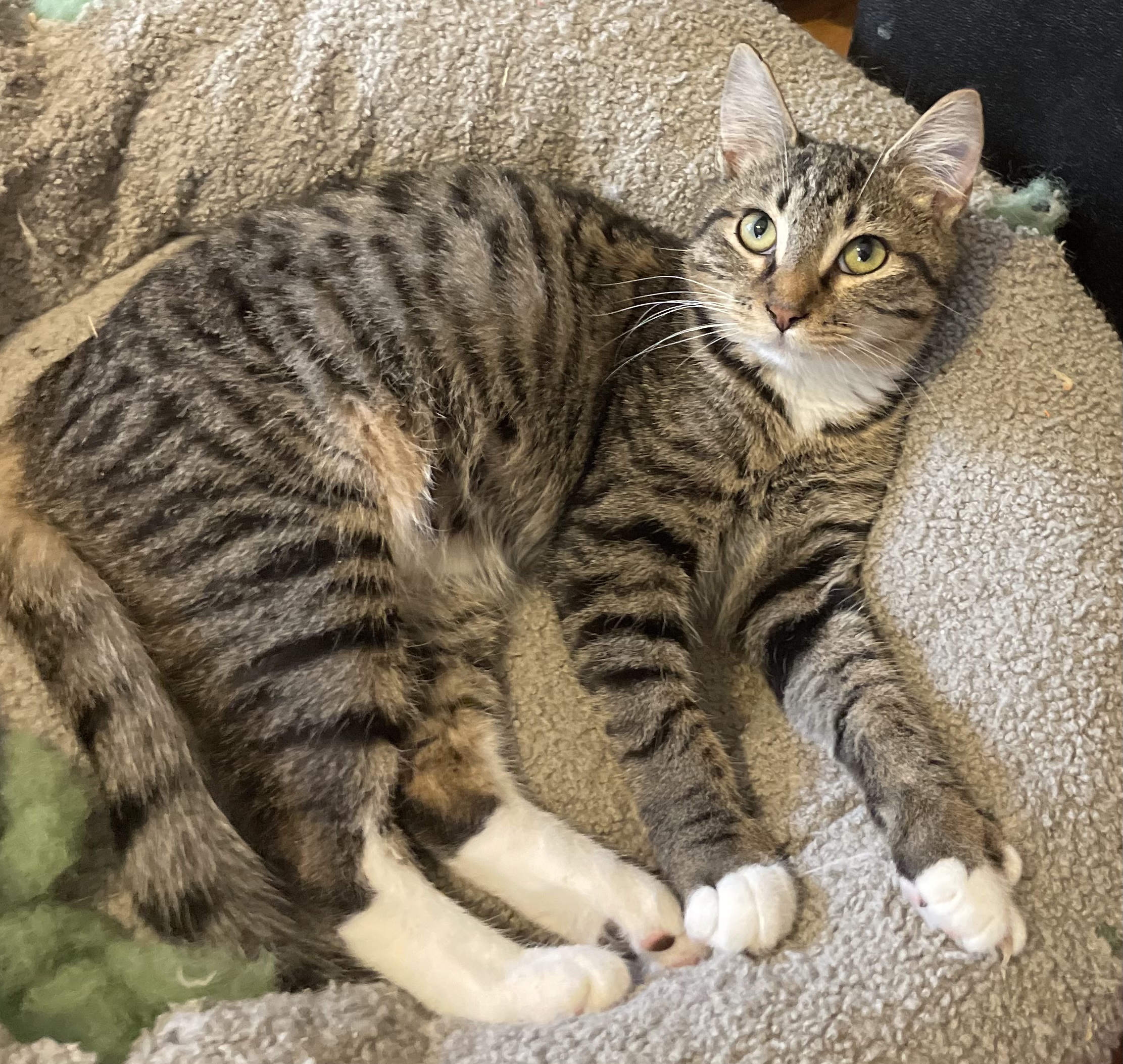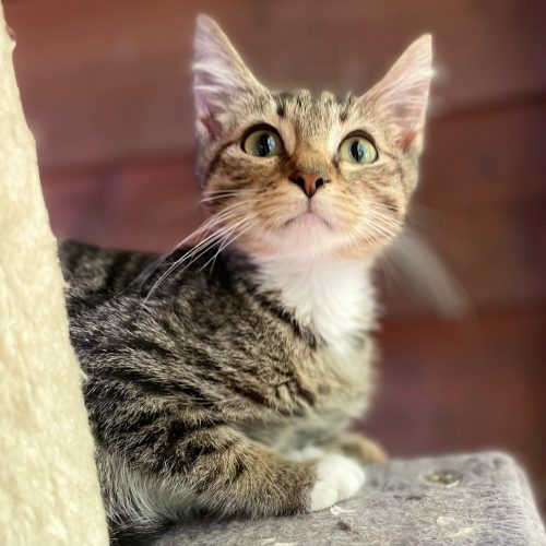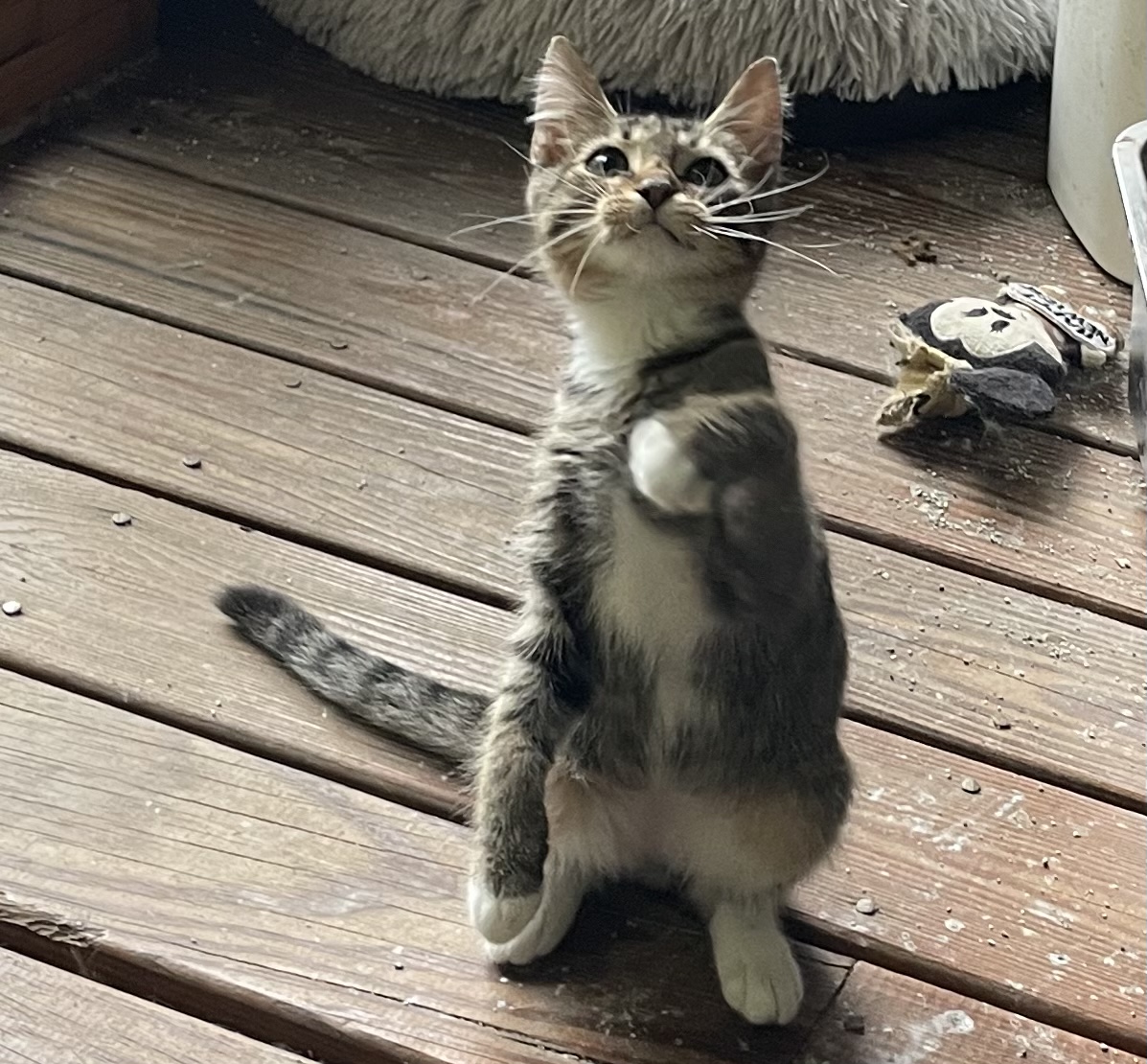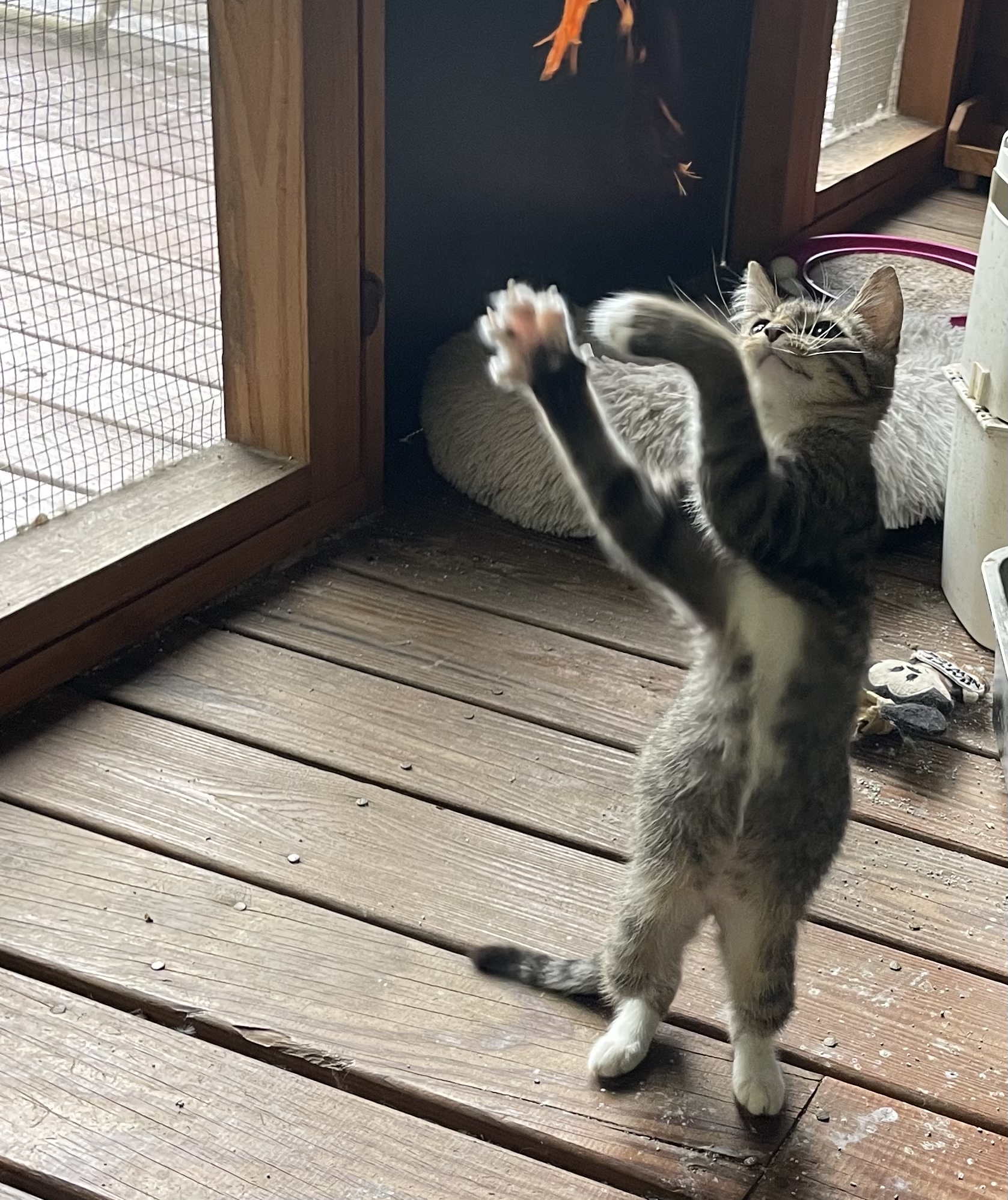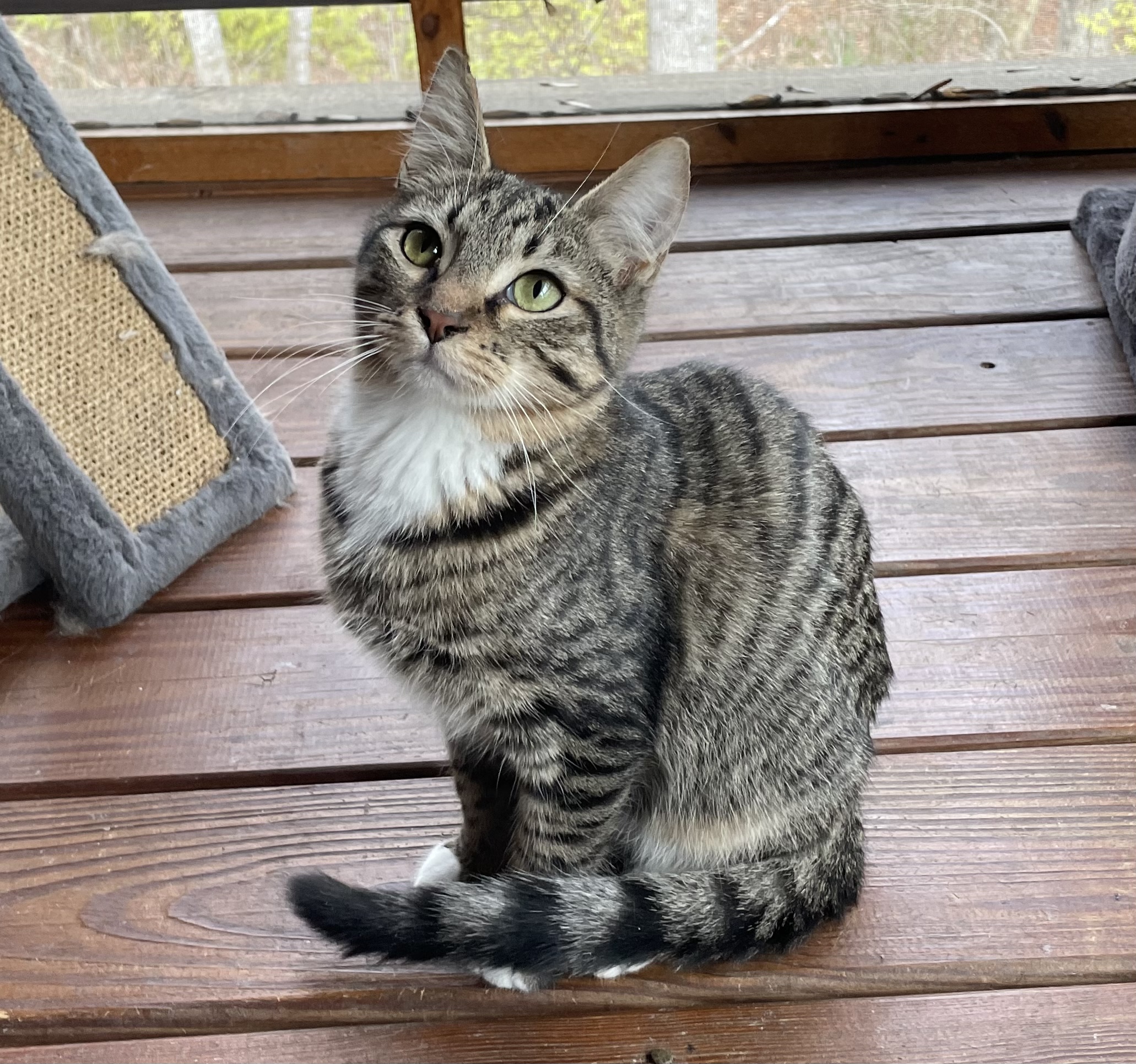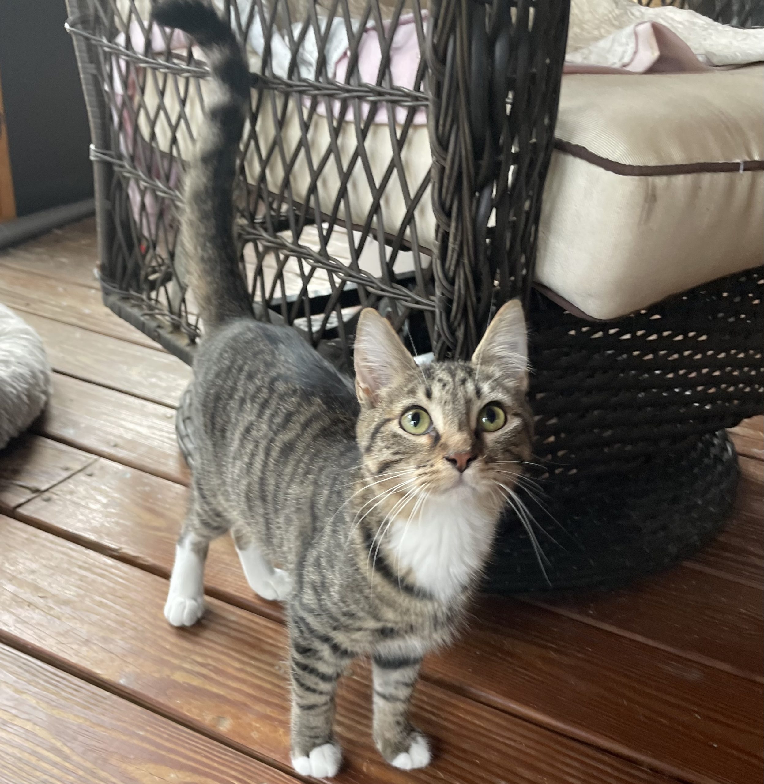 Hi, I'm Hotshot! Life started tough before I was rescued during a TNR event; I was outside, always hungry, and not feeling well because of worms. But I'm a brave kitten and I've kept my sweet, cuddly nature. I love snuggling up with anyone who has a warm lap and a gentle touch. I've learned a lot about love and trust here, and I dream of a forever home where I can share all the affection I have. If you're looking for a courageous companion who loves deeply, I'm your guy!