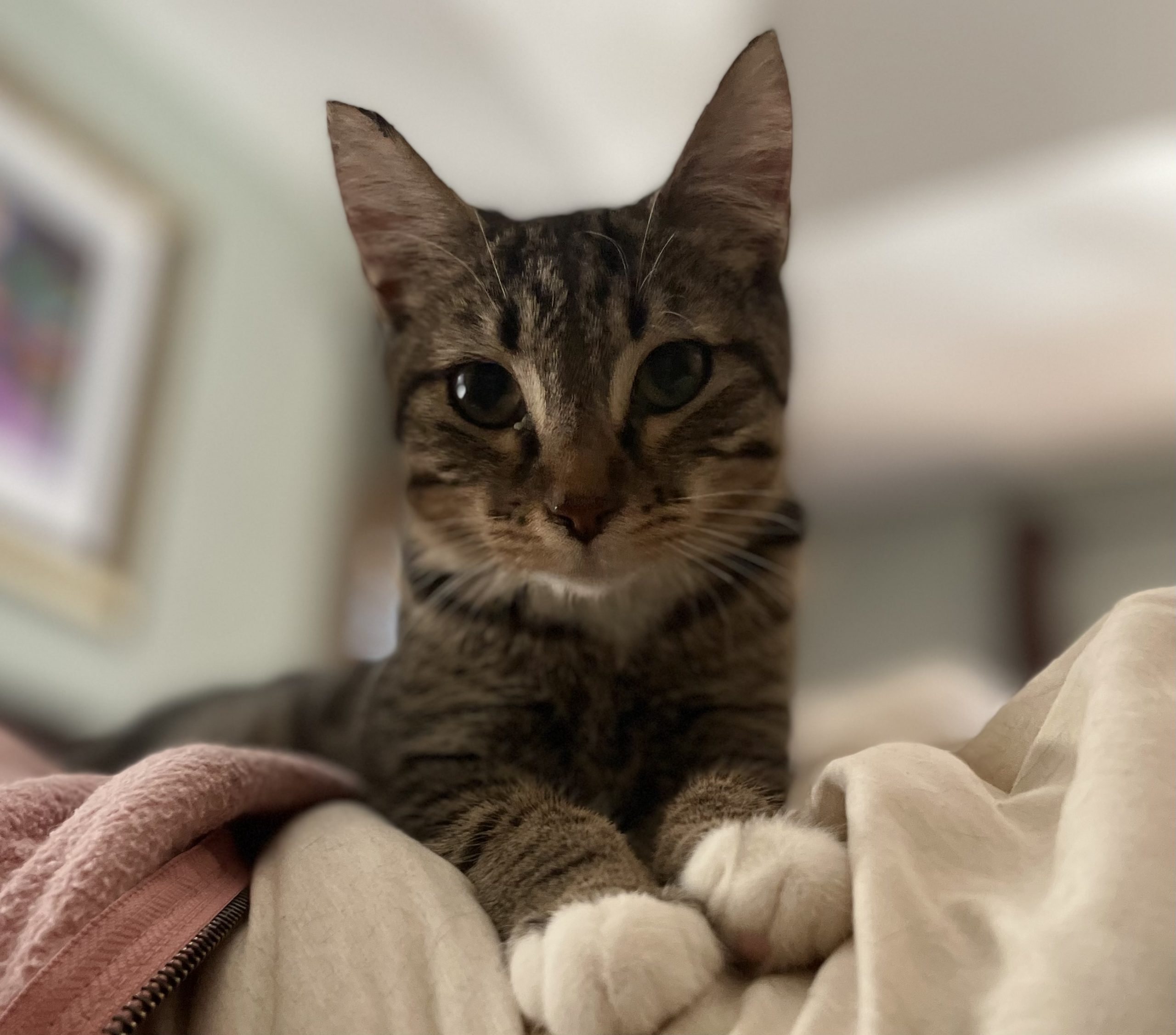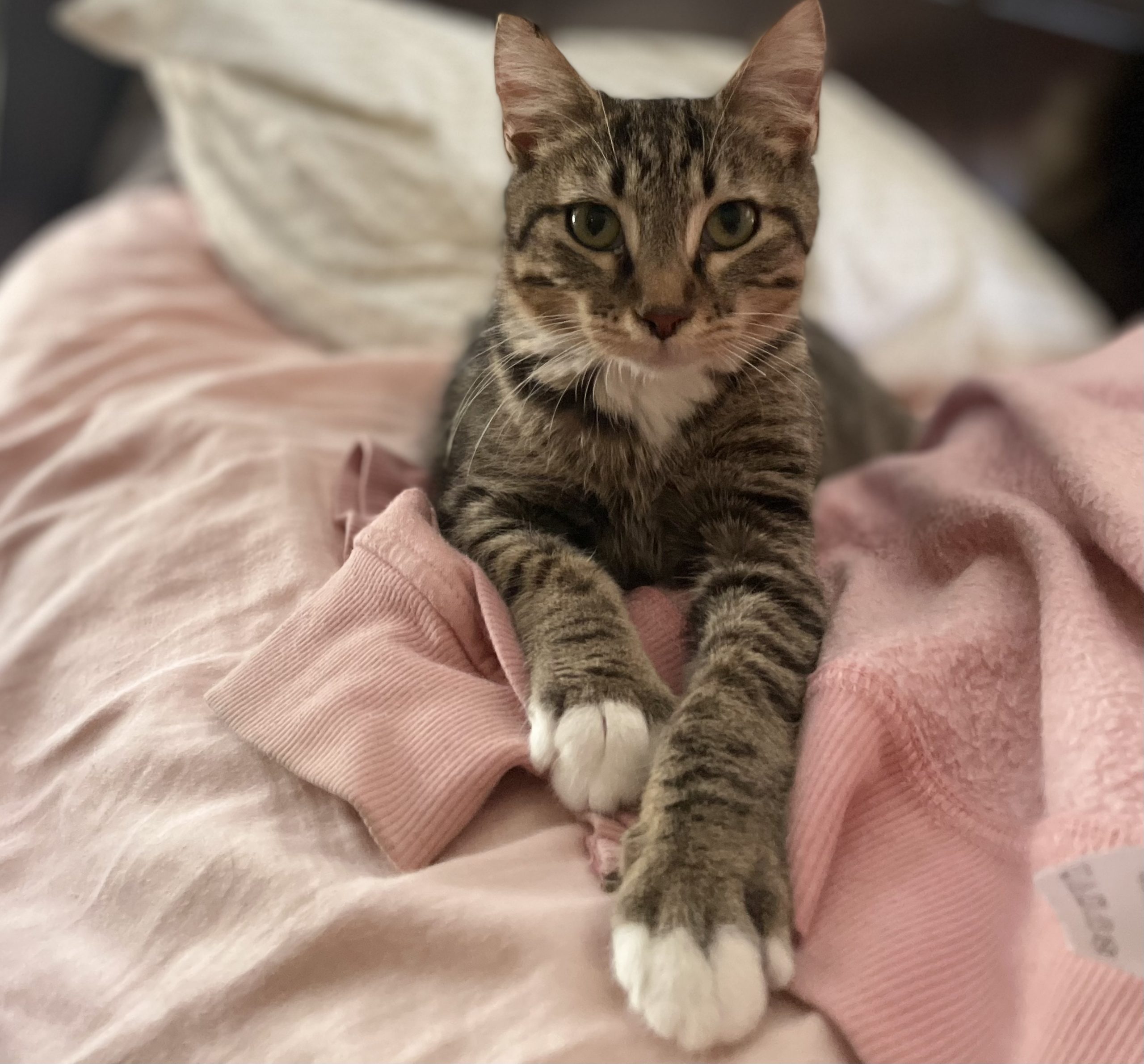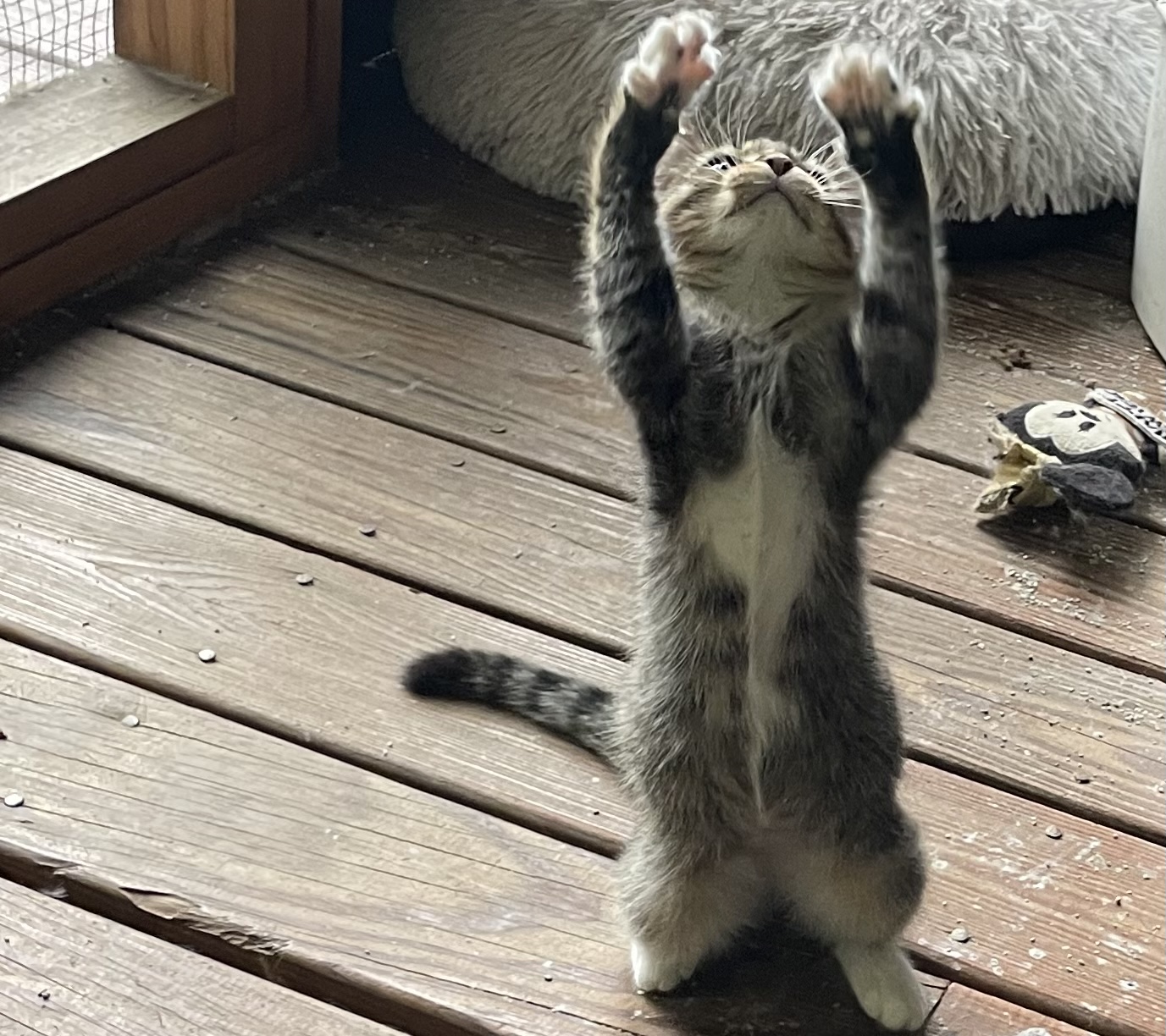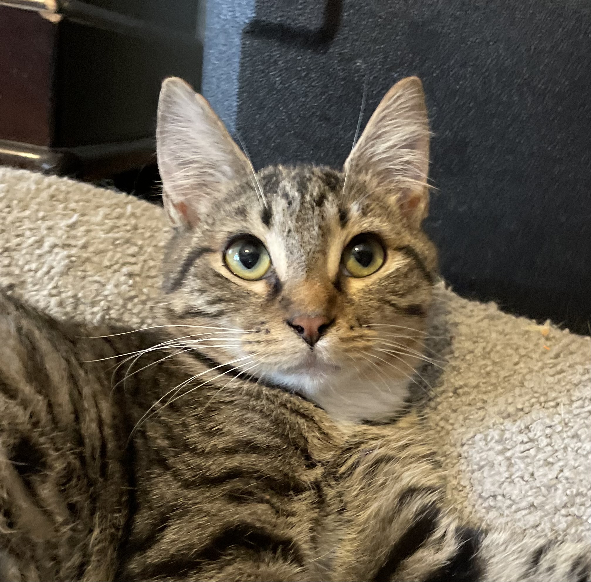 Hi, I'm Hotshot! Life started tough before I was rescued during a TNR event; I was outside, always hungry, and not feeling well because of worms. But I'm a brave kitten and I've kept my sweet, cuddly nature. I love snuggling up with anyone who has a warm lap and a gentle touch. I've learned a lot about love and trust here, and I dream of a forever home where I can share all the affection I have. If you're looking for a courageous companion who loves deeply, I'm your guy!