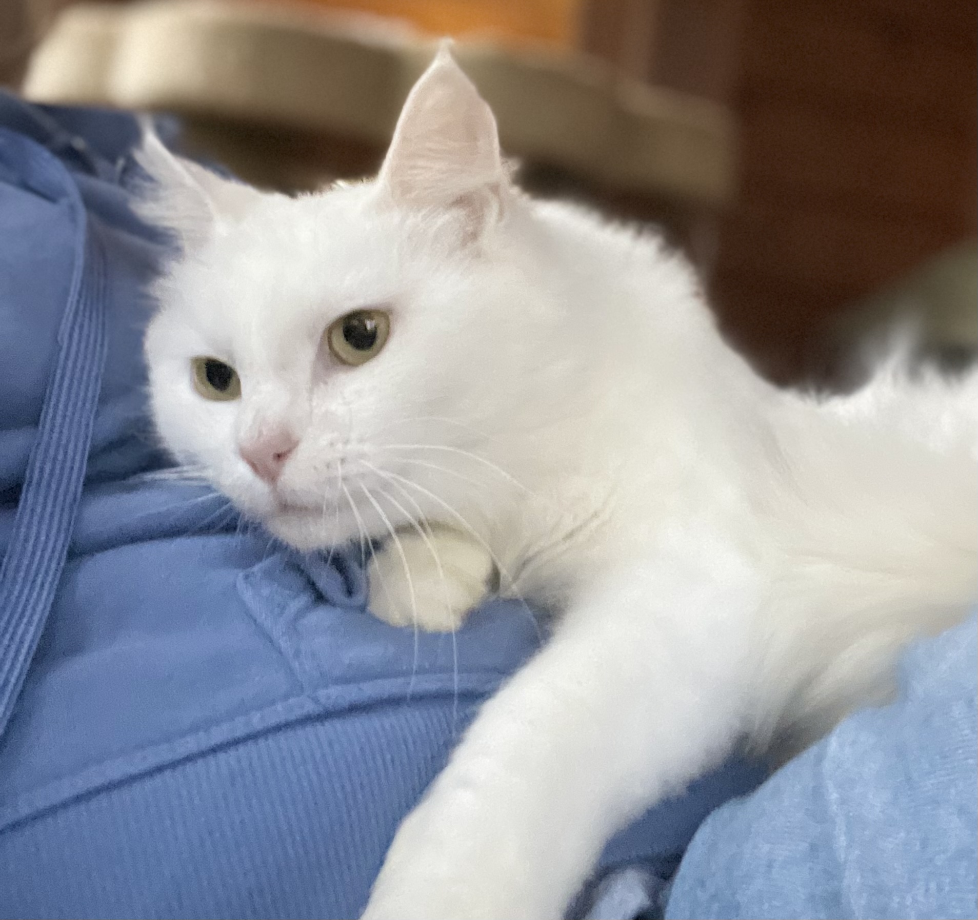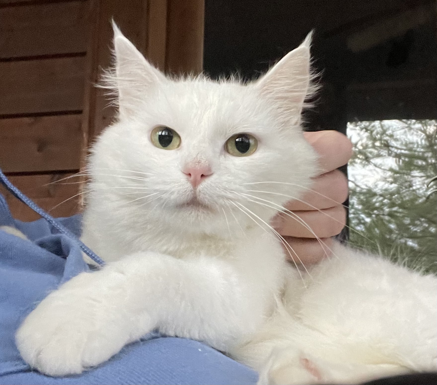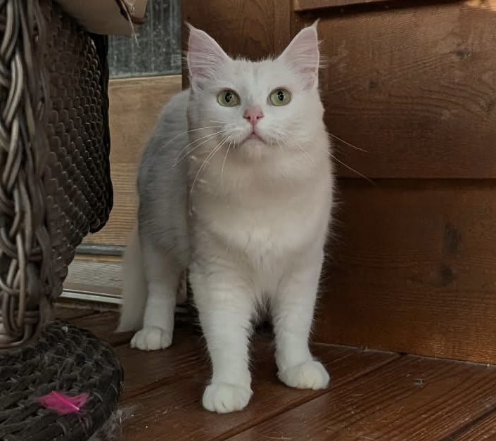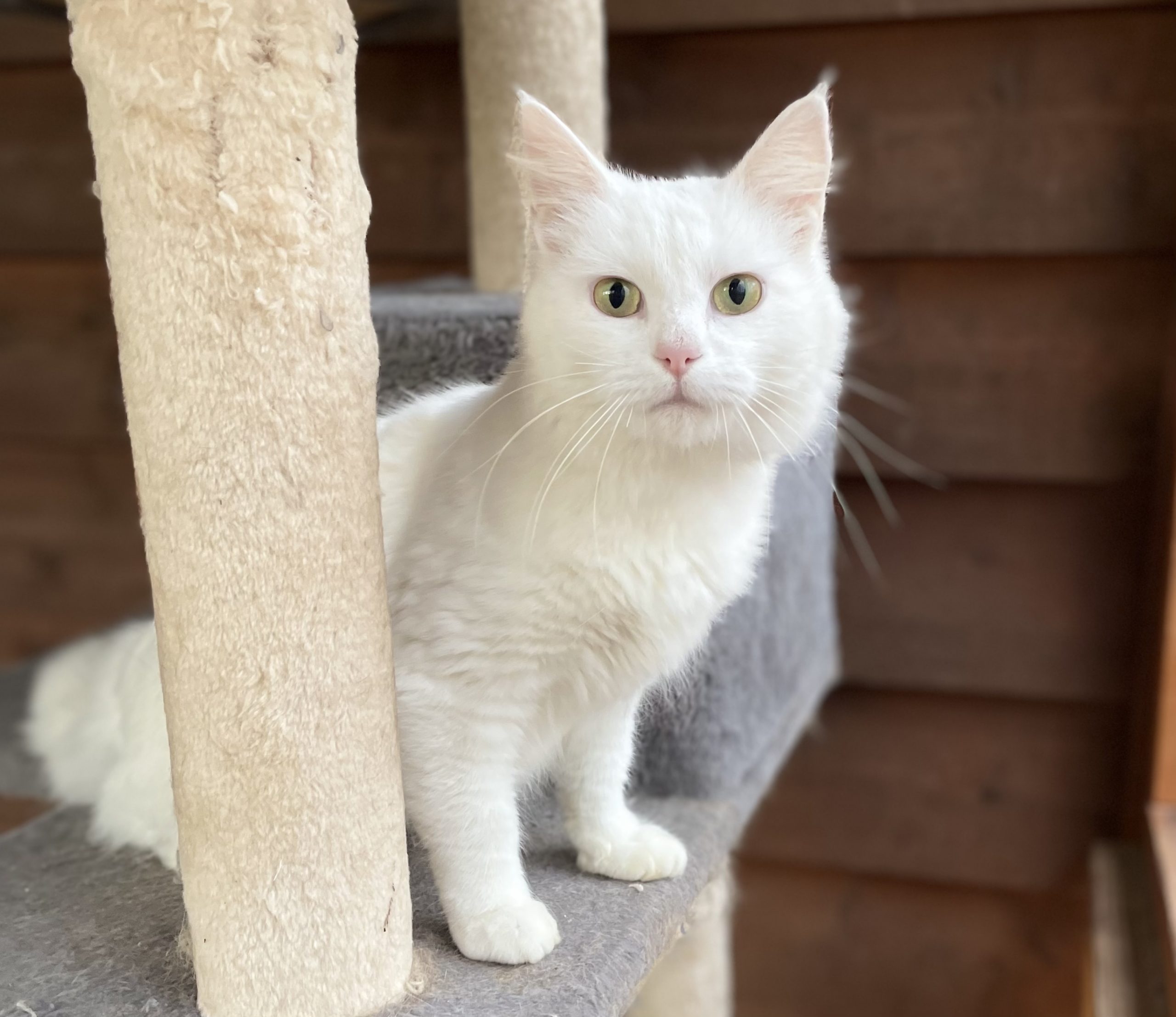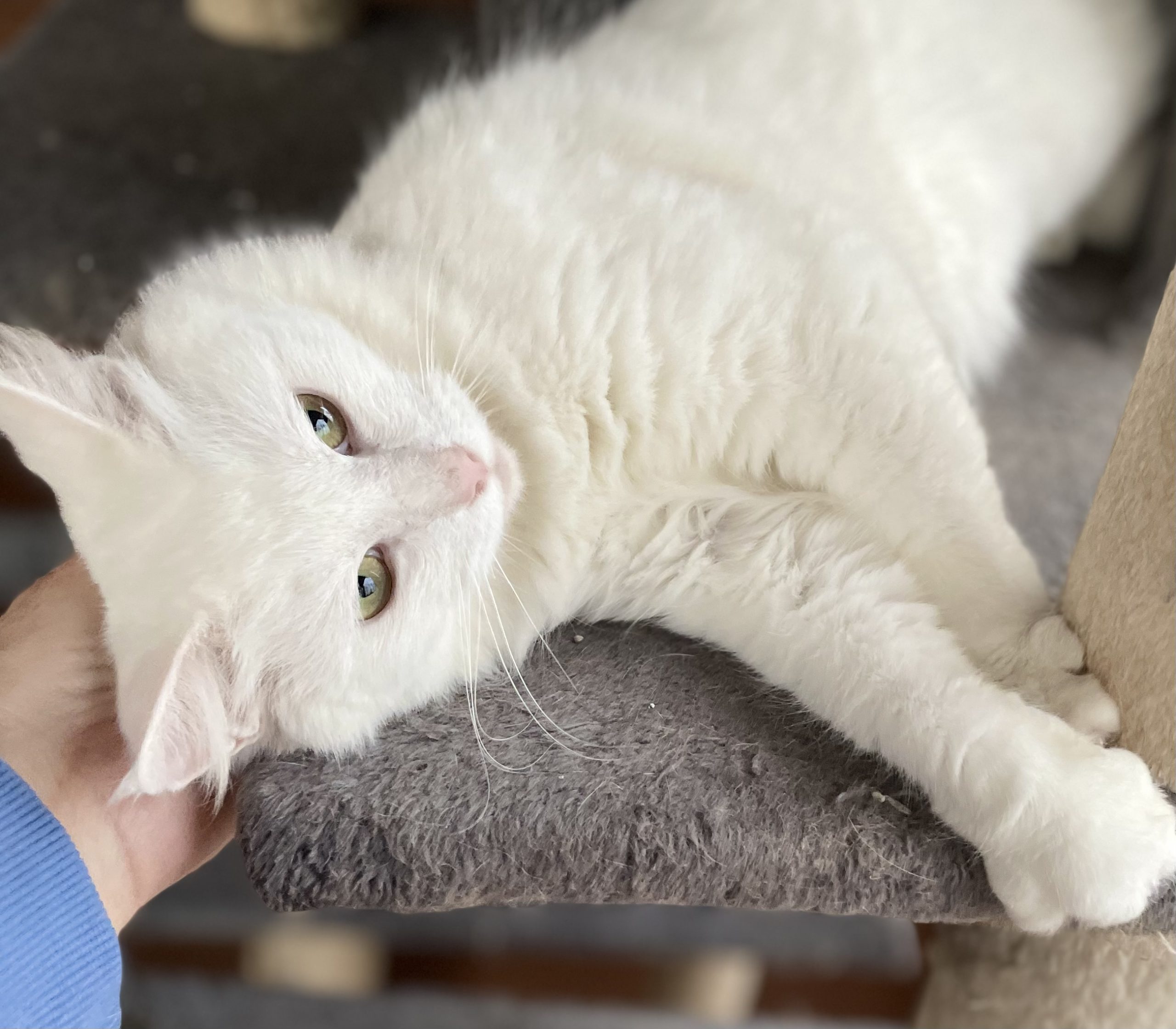 Because of my friendly personality, I was rescued from the colony to find a forever home. My foster mom says I’m very lucky; since I am all white, I was an easy target for predators, especially during the low-light hours when they hunt. I am so happy to be living safely indoors now!