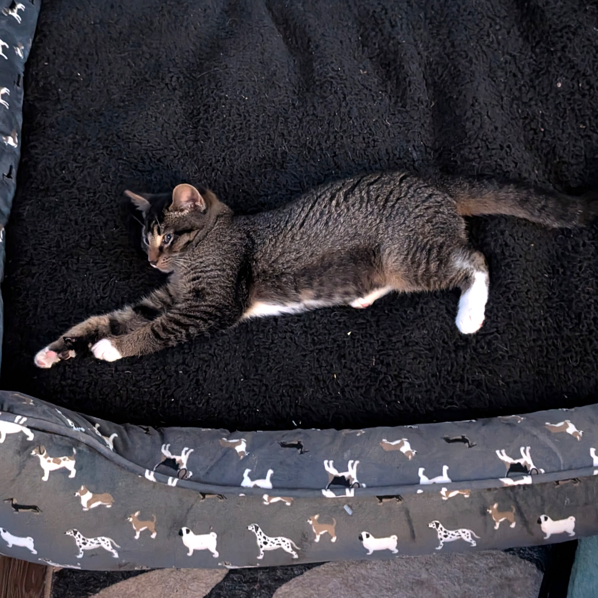 Jimmie is a sweet and friendly girl.  She likes to play with toys and nap with her big foster dog friend!  Her unique ticked tabby coat is so pretty!  She is a little sensitive to sudden loud noises, so a home without young children would probably be best.