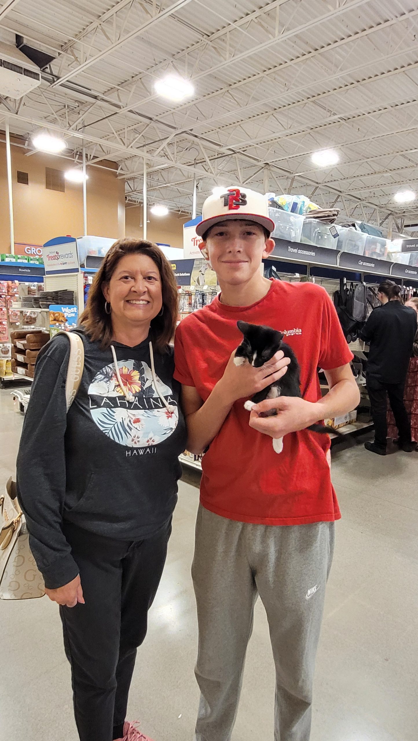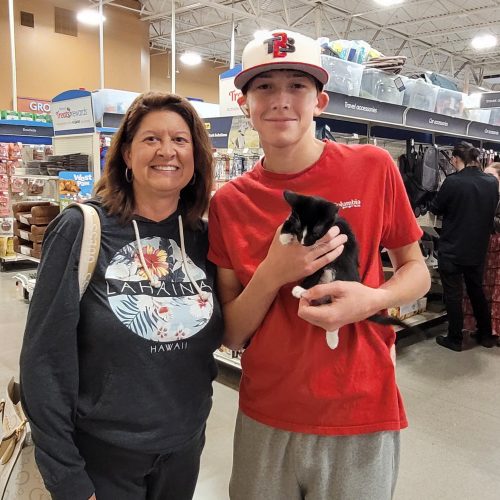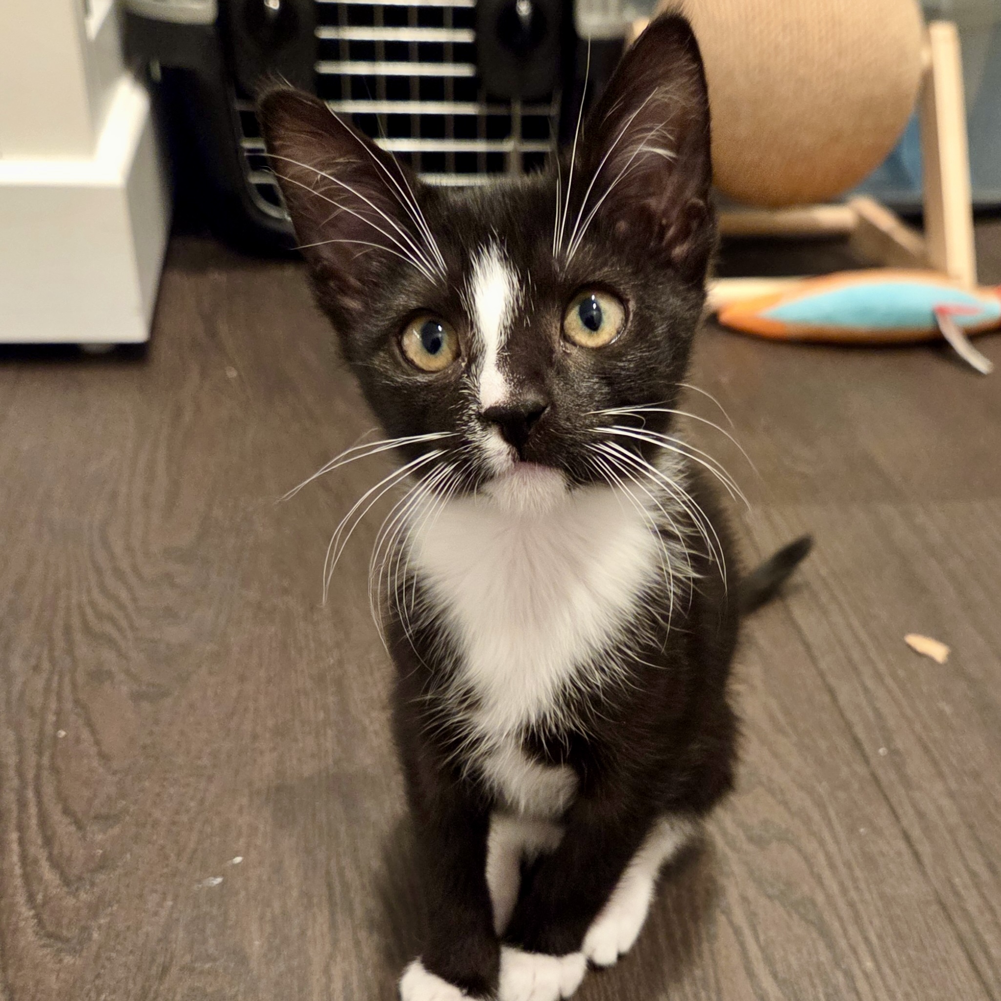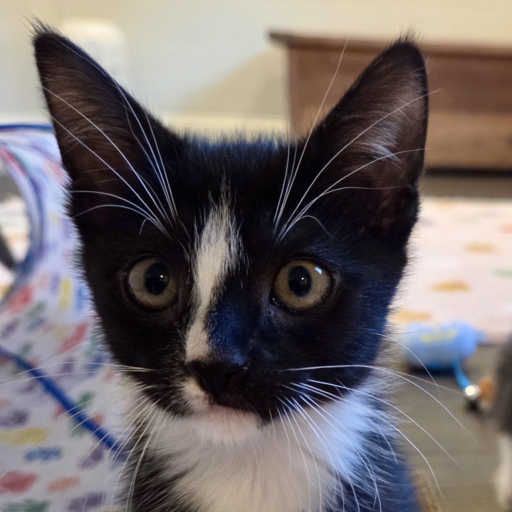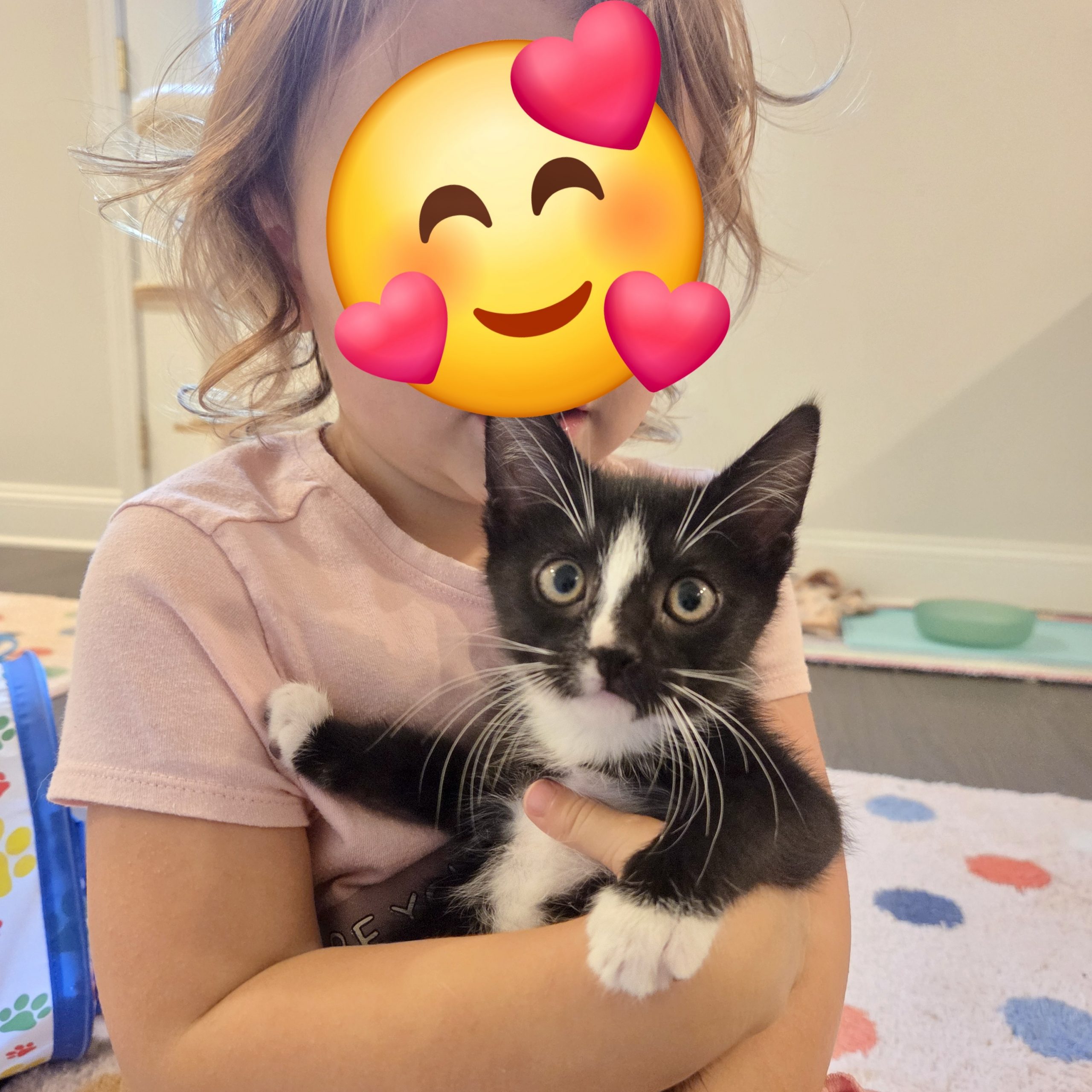 Kitty LePew is such a fun kitten, she loves to play and she is very smart. Once she is played out she will sit right beside you and start purring. Thats her sign that shes ready to snuggle. She has been around three senior dogs 20-65lbs and although they aren't very active she does well around them and even chases their wagging tails. She has also been around two children under six that she loves to play with and let's them hold her like a baby doll. She loves to swat and chase balls all throughout the house and will gladly chase after anything on a wand. She likes cats and does great with her foster moms resident cat. She'd do great with a buddy to keep her busy and out of trouble! If you want an active playful kitten this girl is for you!