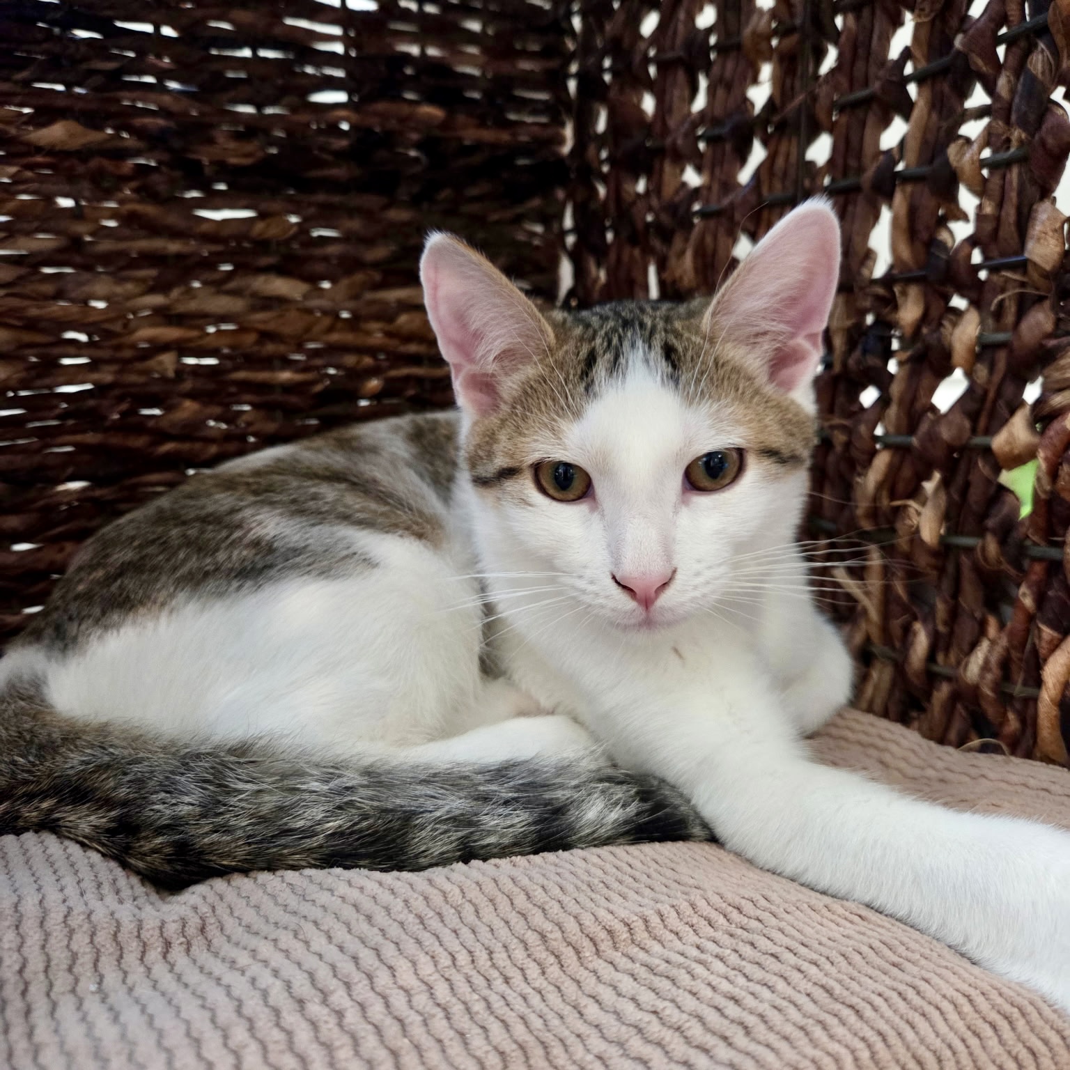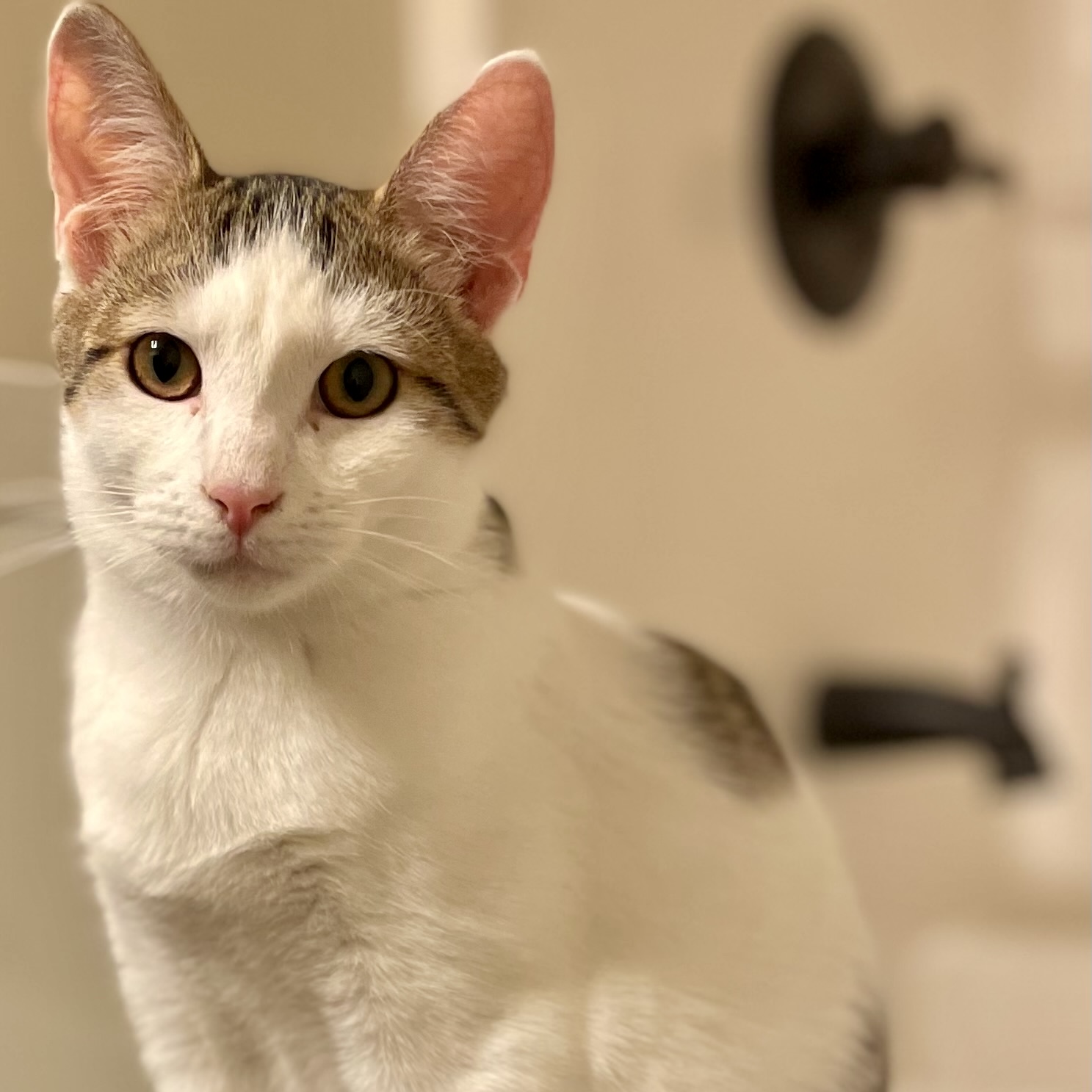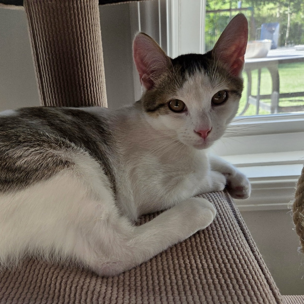 Krist is slowly coming out of his shell but he's still nervous. He absolutely loves to play with strings, which is fitting since he's named after Nirvanas bass player. He has been around kids of multiple ages, and they can be a little too busy for him unless they quietly sit with him on the couch. Older kids would be best! Krist tends to hide most of the time but loves his food and runs out when it’s mealtime. He’s definitely leaning to be brave from his brother Dave who comes out for purrs and pets. Krist will let you touch him but may jump away if he gets spooked. He’s never aggressive - only sweet!