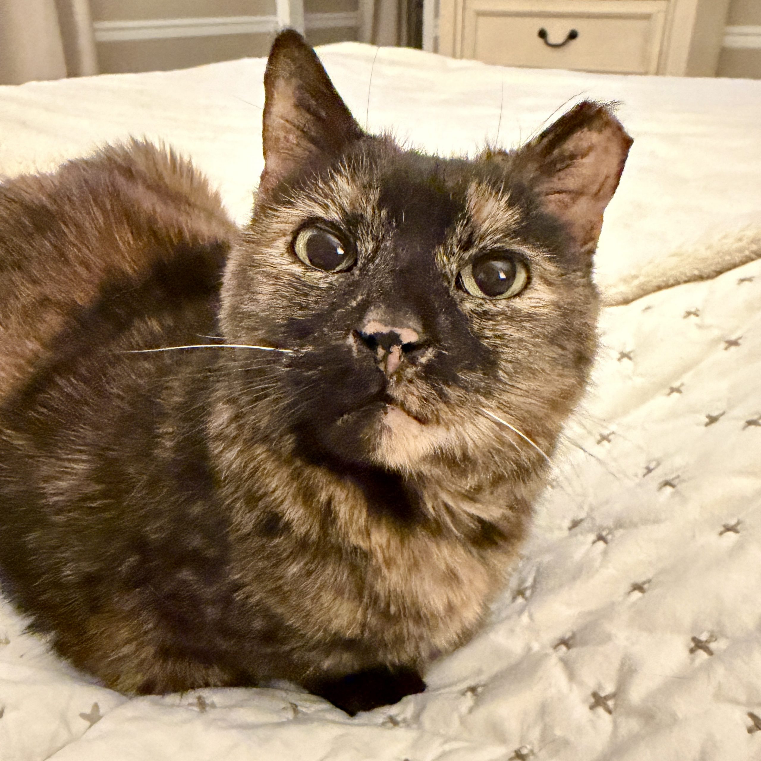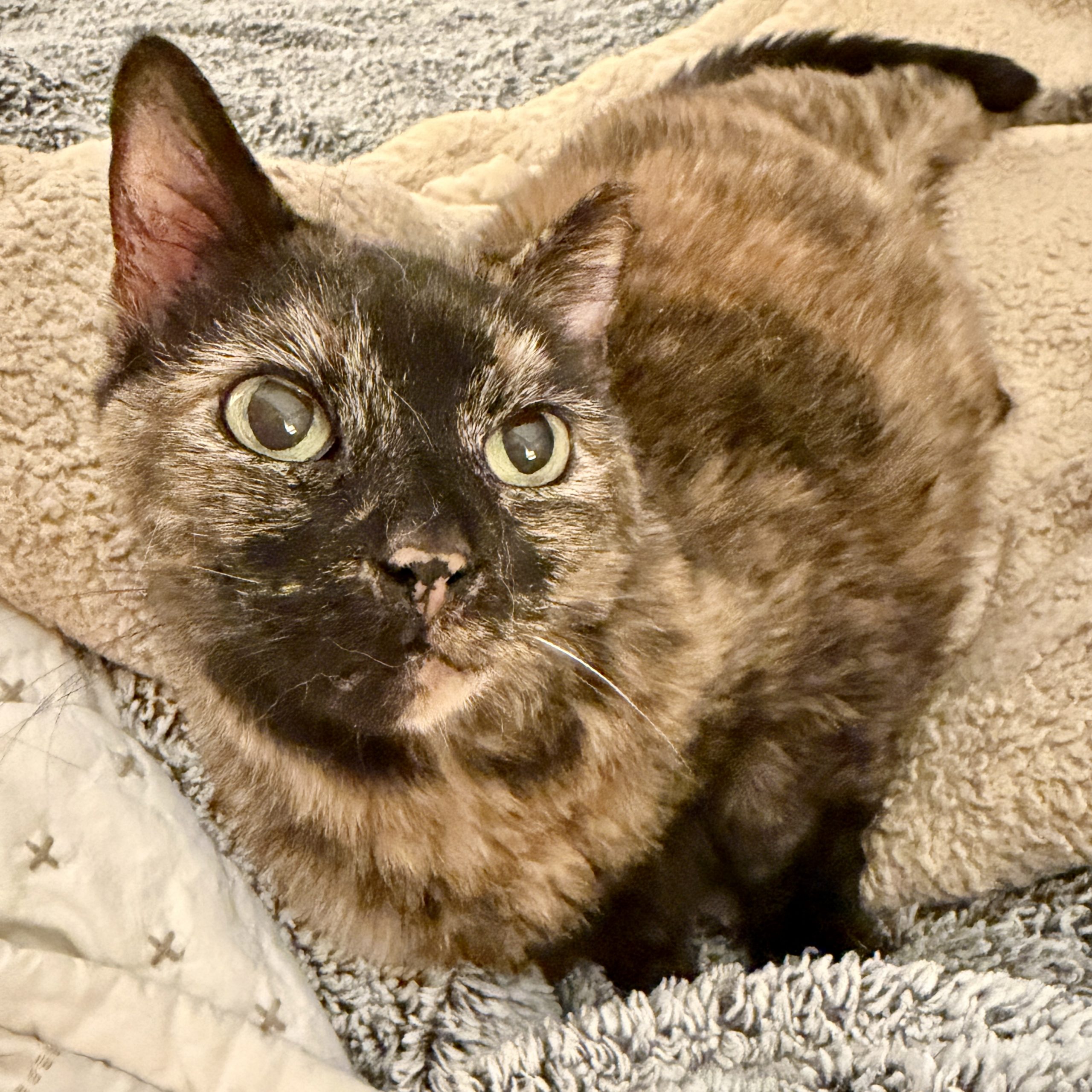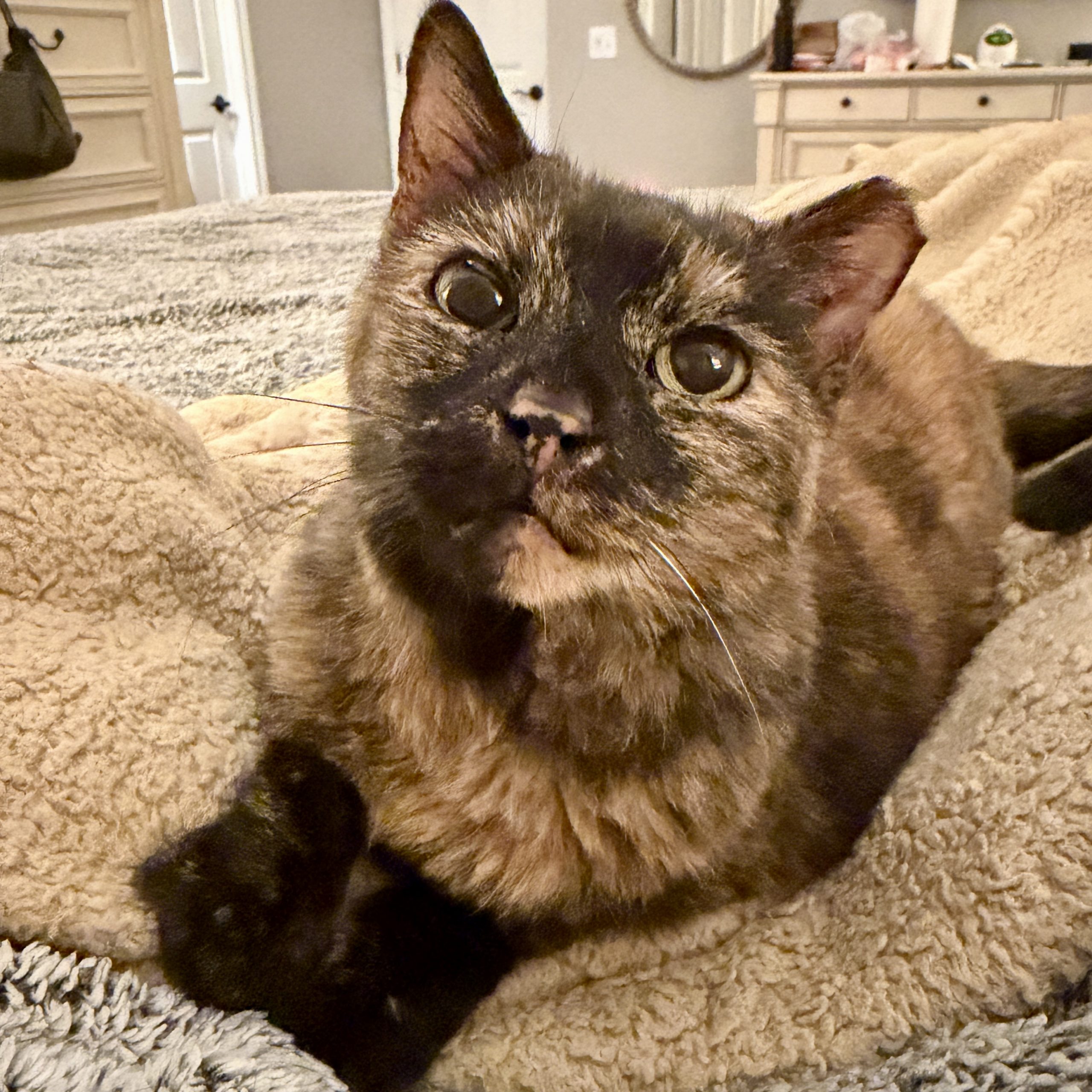 She will talk to you for attention, toddle her way over, and melt right into your arms. She absolutely adores her people—whether she’s curled up in her cozy cat bed or snuggled in yours, she just wants to be close. And while spa days aren’t her favorite, she sweetly tolerates brushing because she knows it makes her feel good.