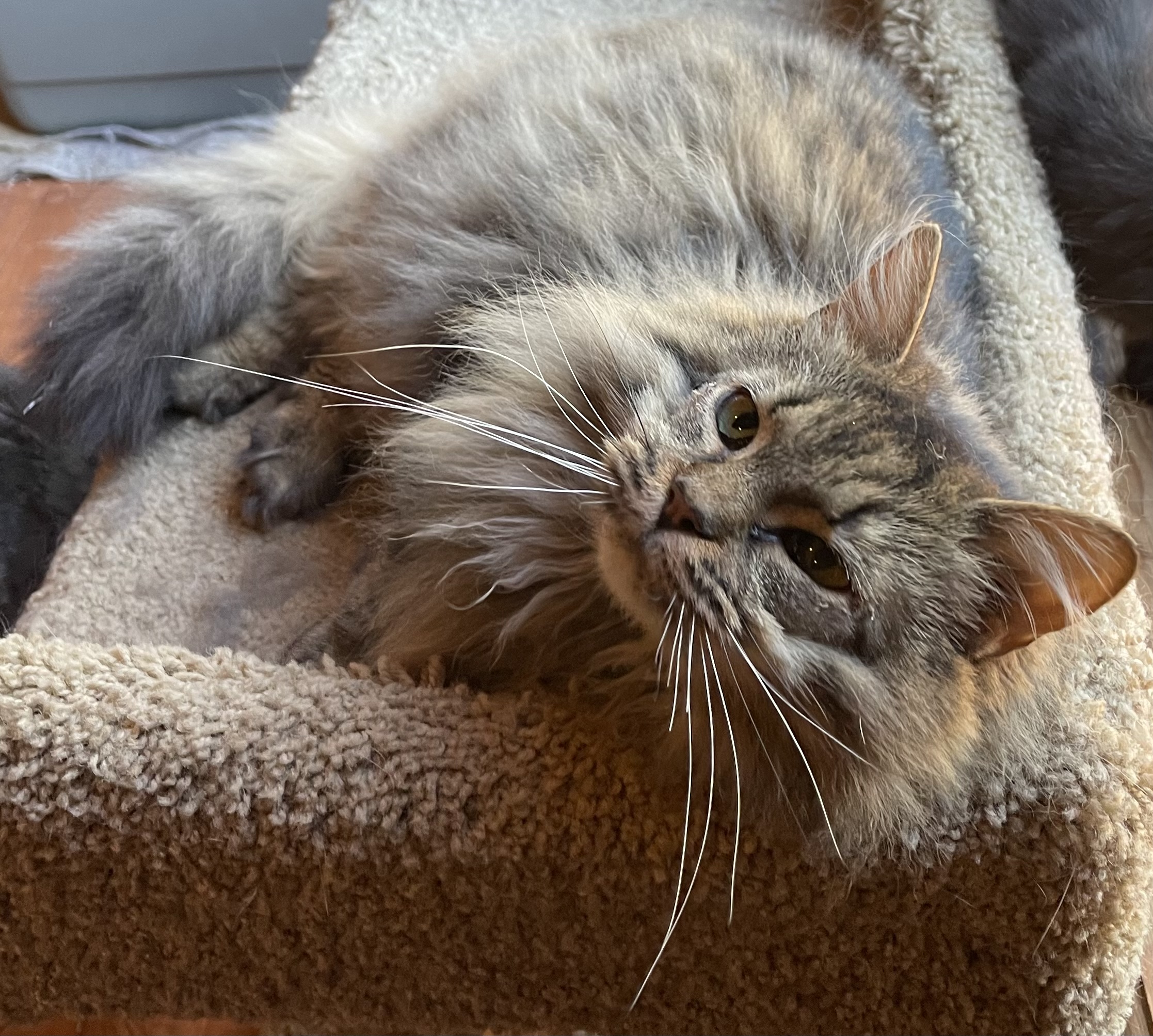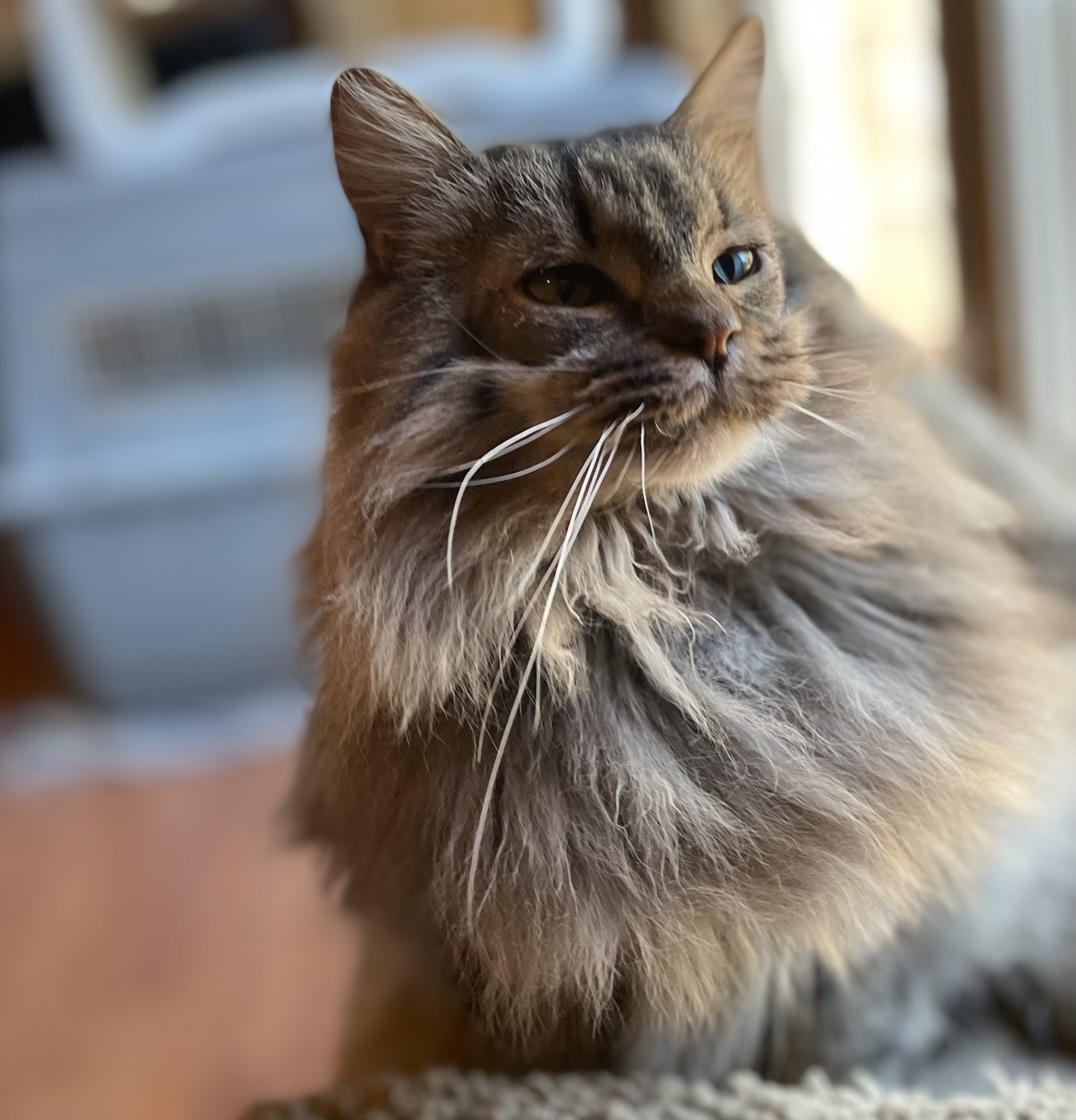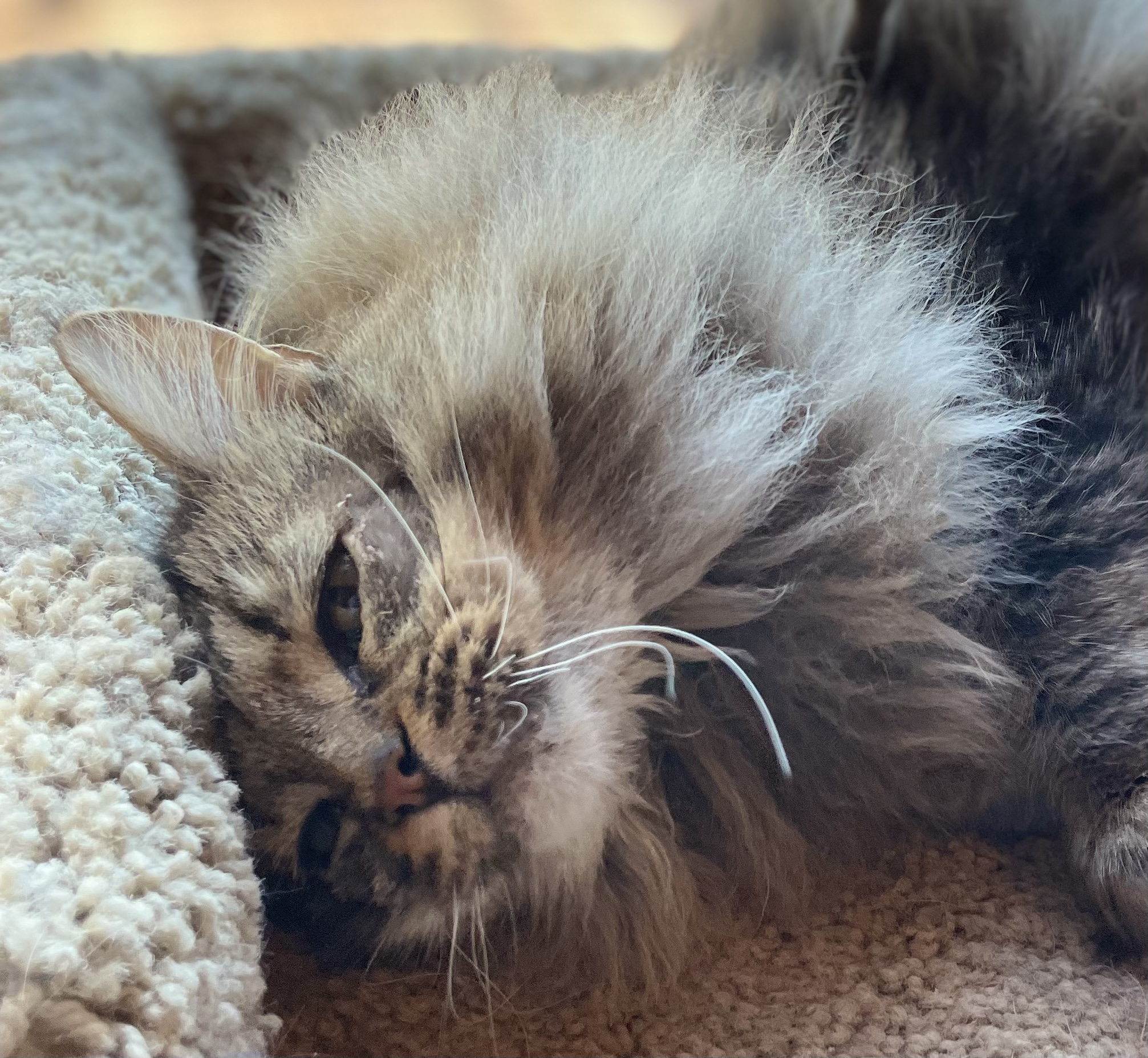 Miss Eureka has a permanent quizzical looking head tilt from her rough beginning which doesn't cause any issues and we think just makes her cuter. She is also FIV+ but we know there are no issues with her living with other cats who are not.