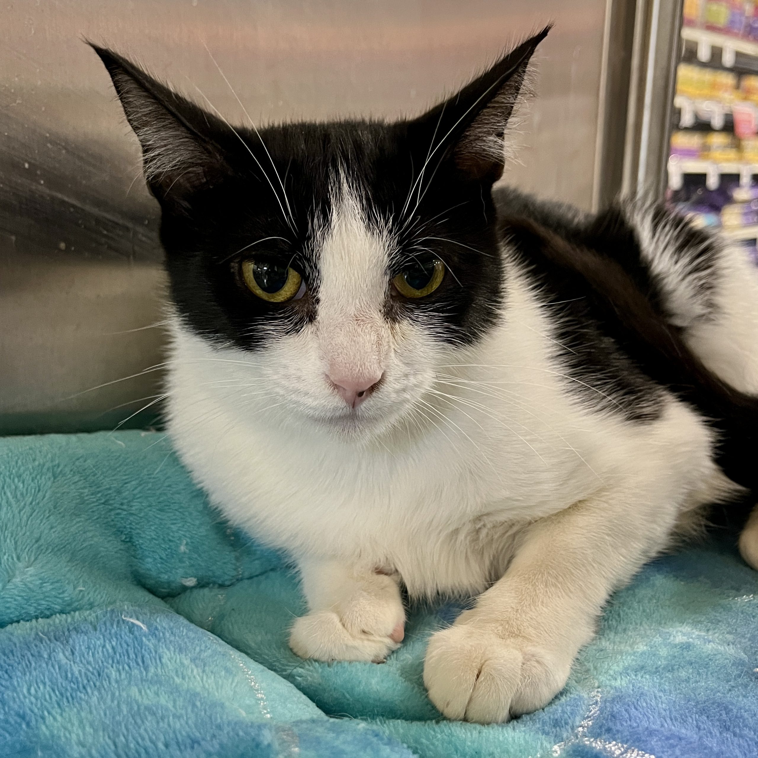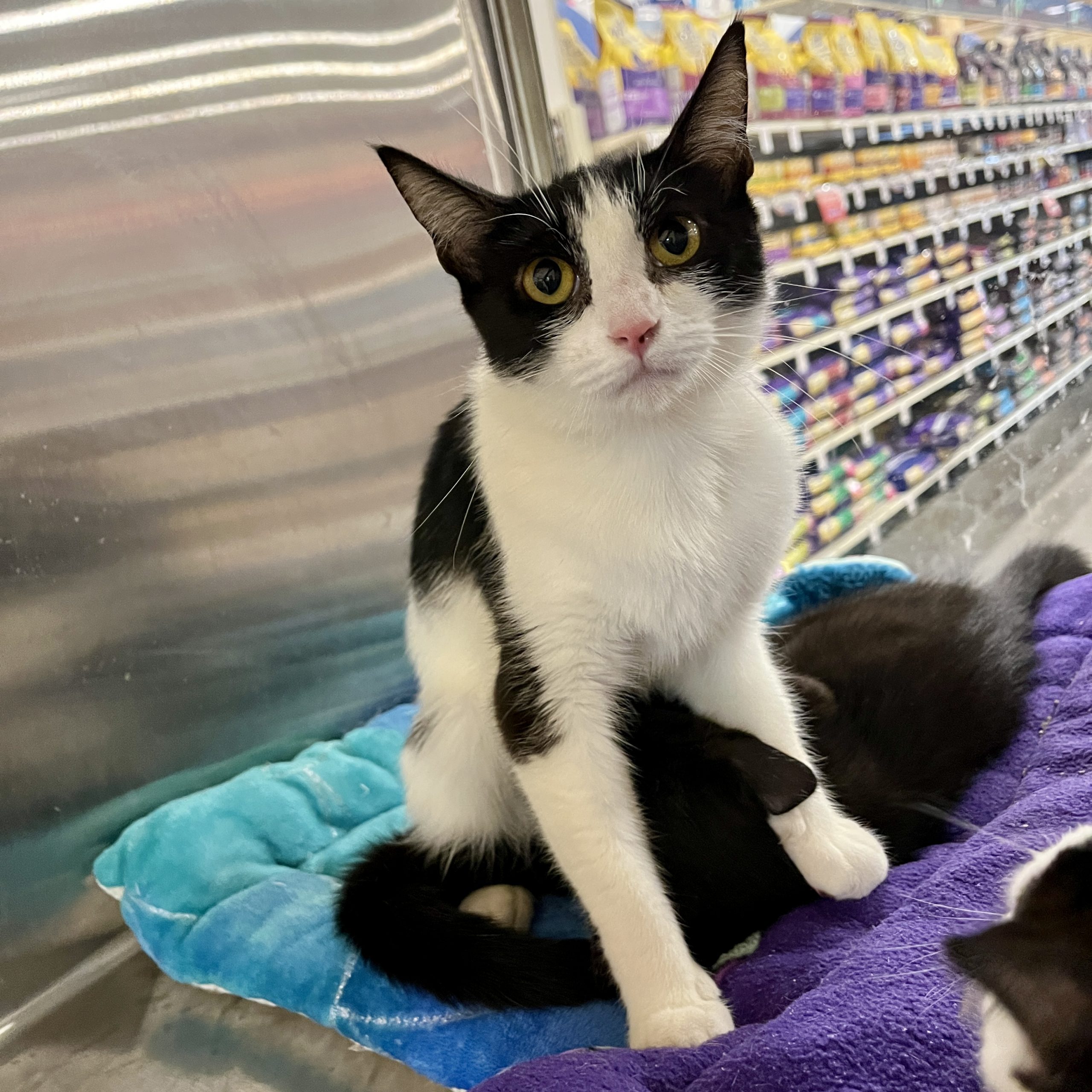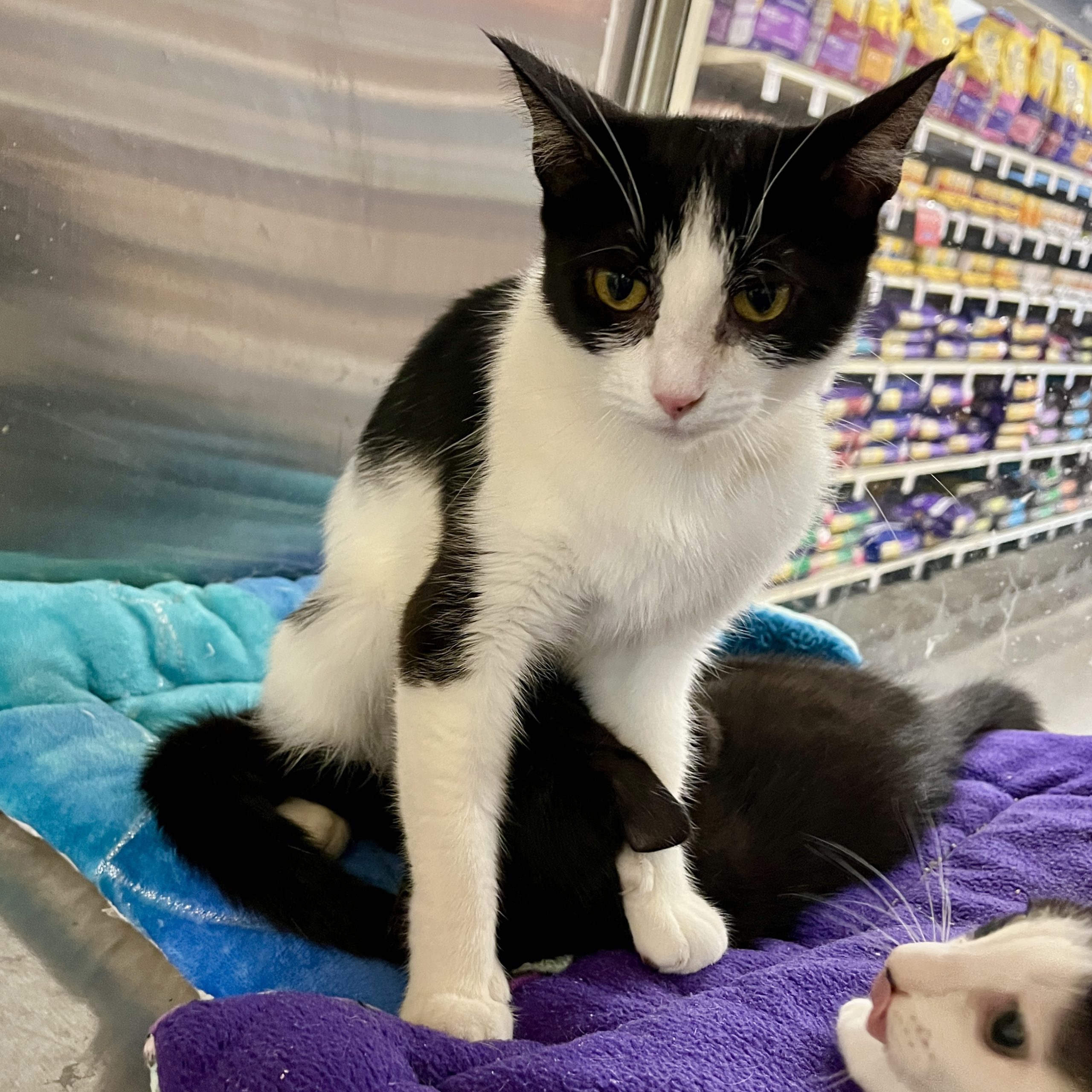 Hi, I'm Momma Spot! I was a very young mom-cat, but now I'm ready to find a forever family. Because I am still just a kitten myself, I love exploring every nook and cranny, chasing toys with endless energy, and when I'm all tuckered out, I'm the best cuddle buddy you could wish for. Gentle and sweet, I make friends easily and can't wait to shower my new family with affection. Adopt me and let's start our adventure together, filled with love, play, and lots of purring!