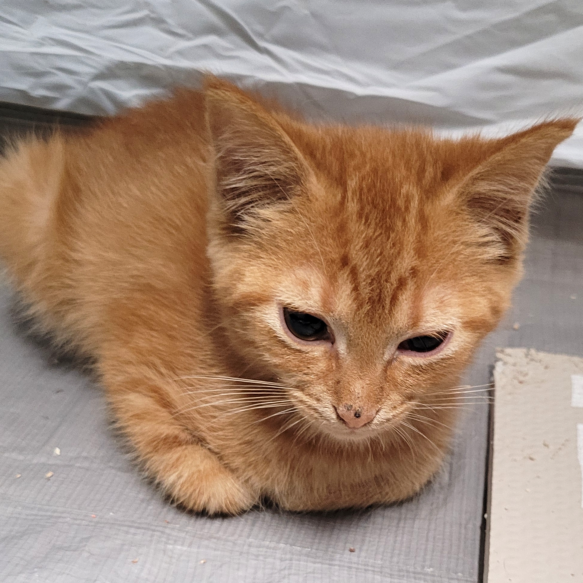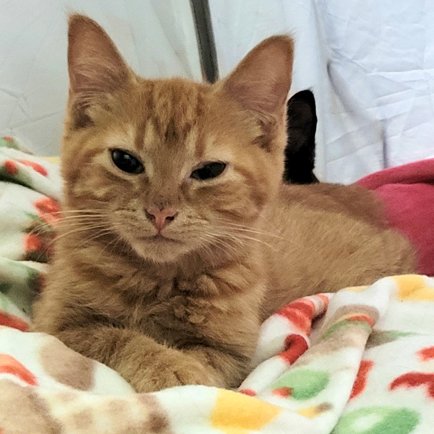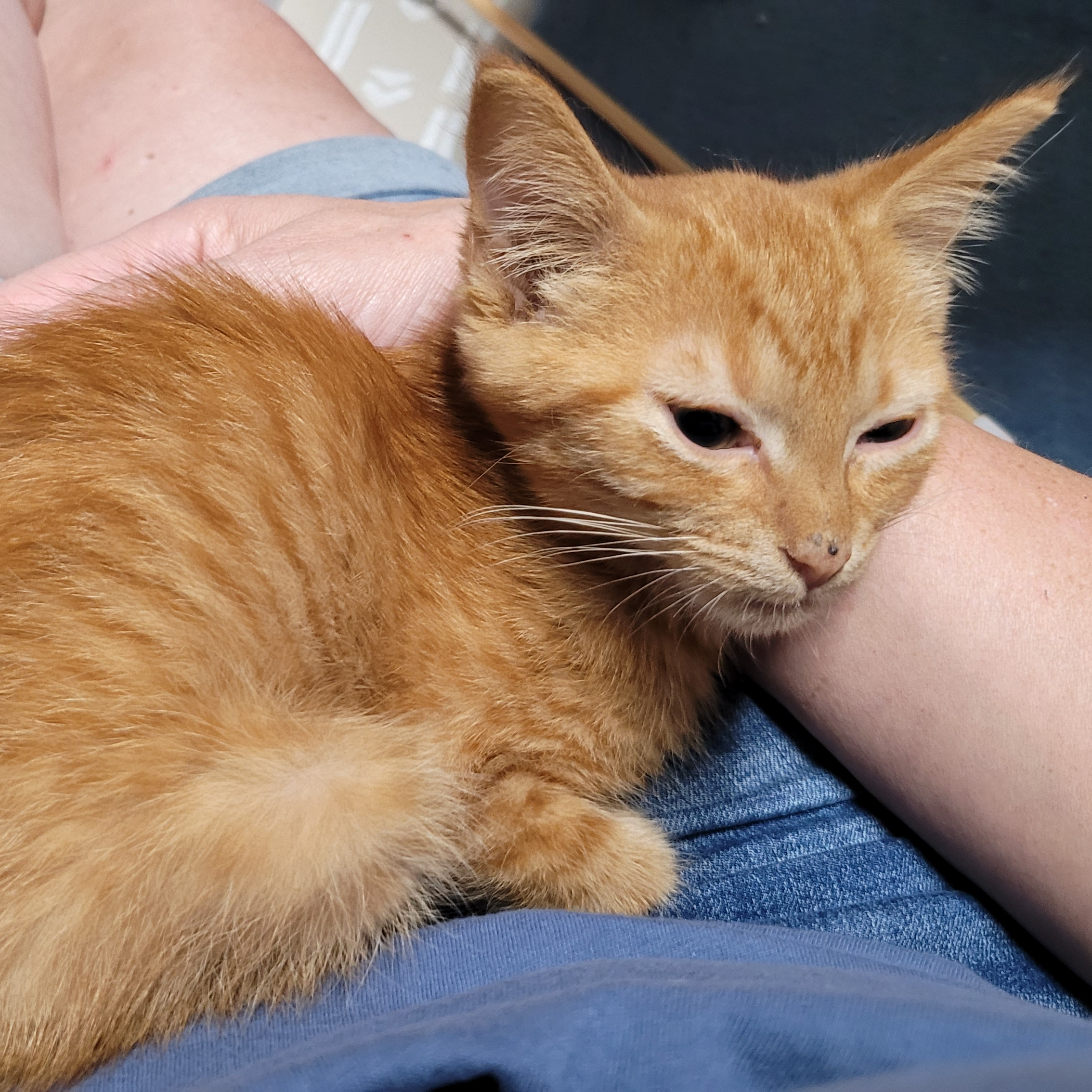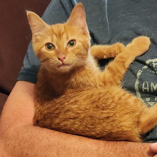 Nubs is a sweet orange tabby with a "rumpy riser" manx tail, meaning he basically has one vertebrae in his tail. We think it really suits him. He likes to play and is curious about toys. Most of the time he is a calm and quiet boy, unless you take him away from his friends... Nubs LOVES other cats and must be in a home with at least one cat. He is looking forward to getting to know his new family and spending evenings on the couch.