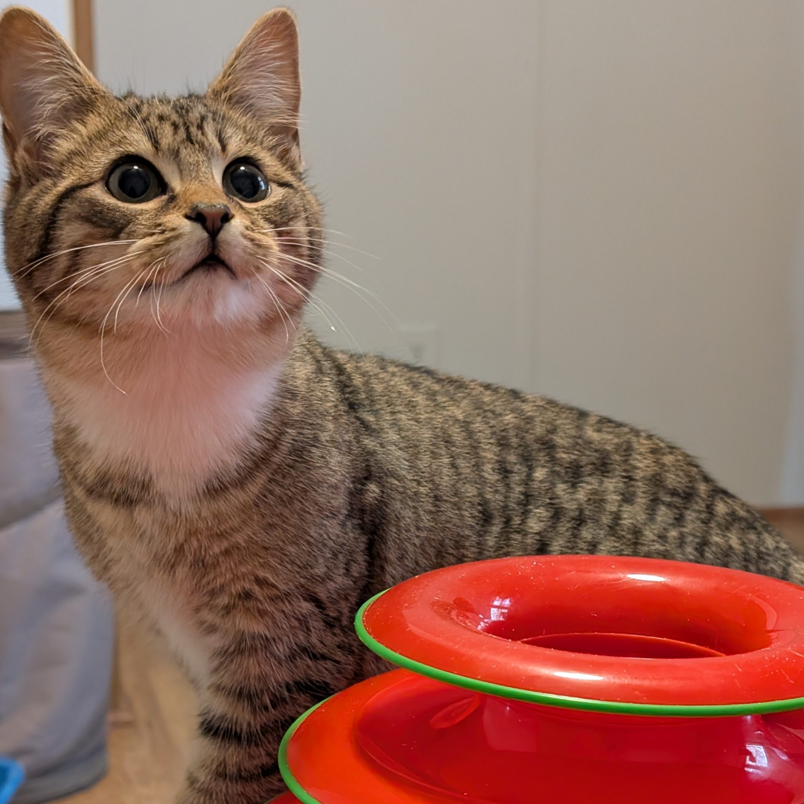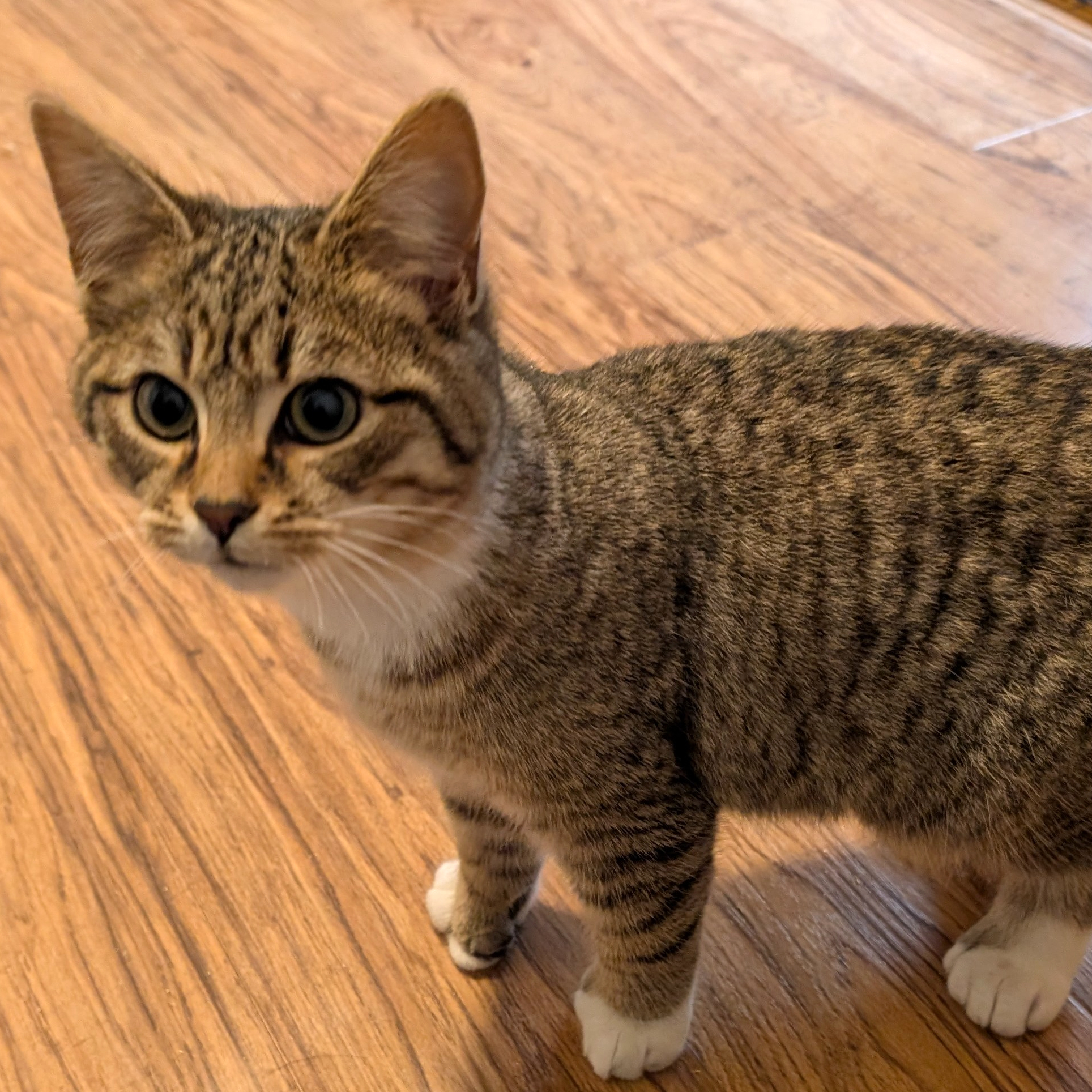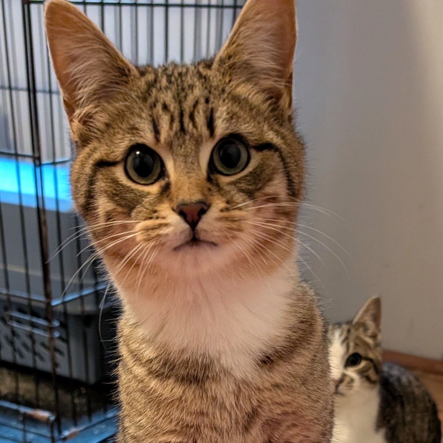 I was born in September, to a young mom that had me and my brother, Ronnie, in a shed at a nice man's home. We spent our days running in the brush behind the fence and playing on the deck. Finally, we were trapped and moved inside. We love playing with our cat toys and eating. Our fur is so soft and we purr loudly.