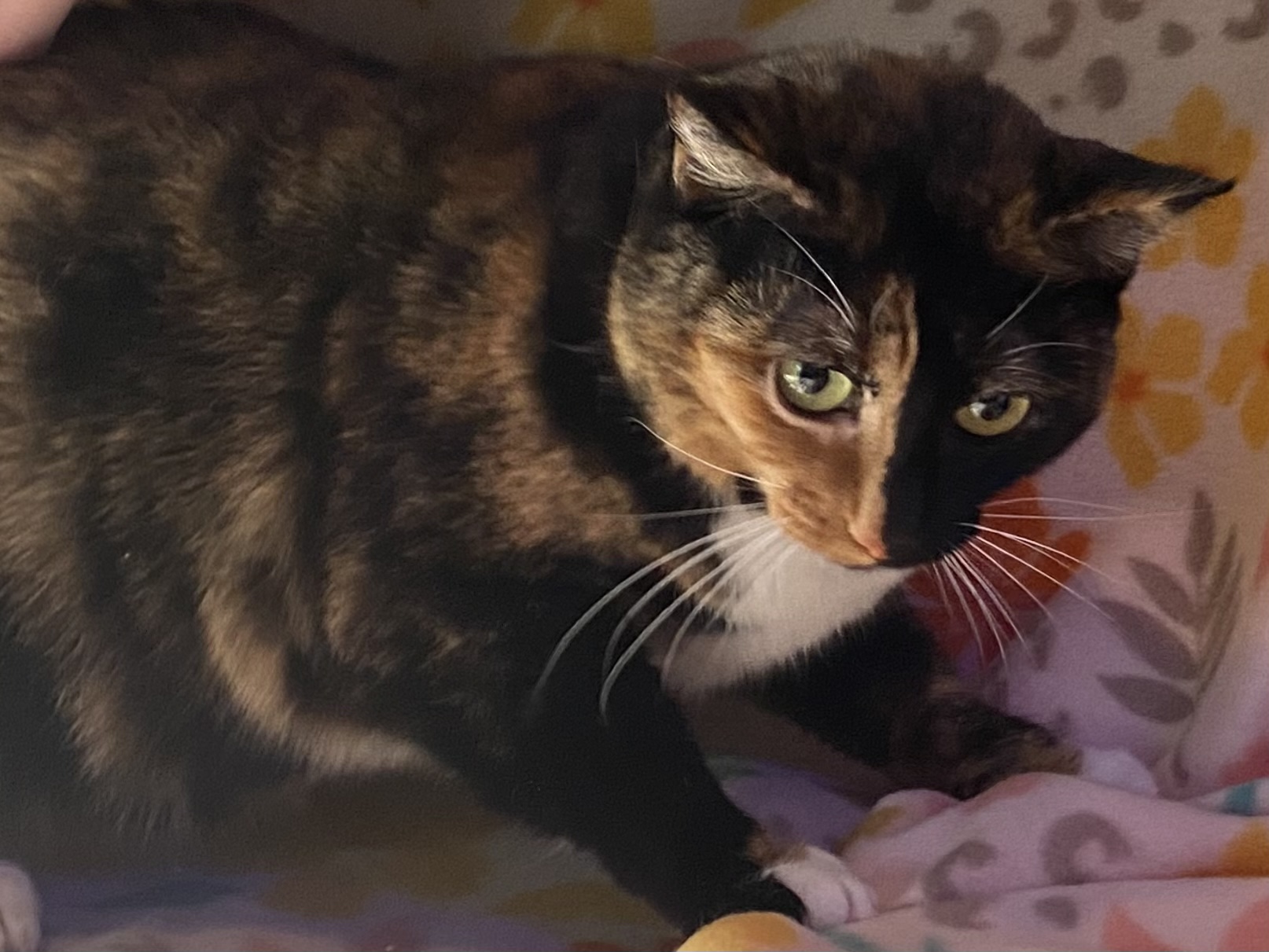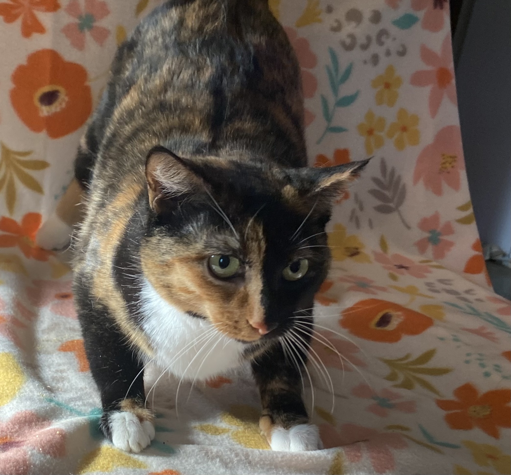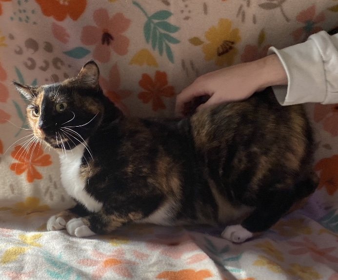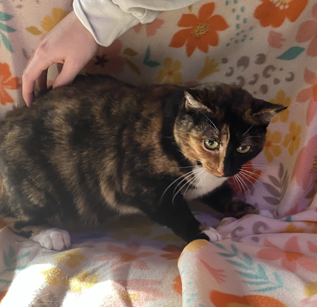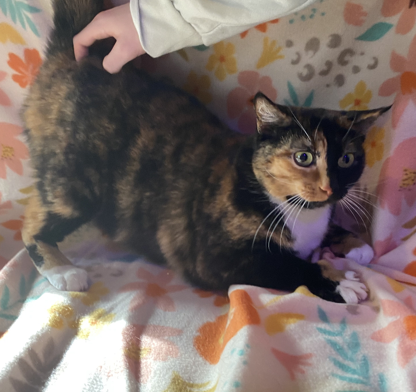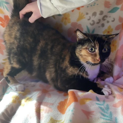 Patches is a sweet, two-year-old tortie rescued during a TNR project. While she is a true tortie, she has none of the typical "tortitude!" She takes a little time to warm up to new people, but once she does, she is incredibly friendly. Patches loves playing with toy mice and chasing balls, and her favorite pastime is snuggling into a soft blanket in a sunny spot for a cozy nap.