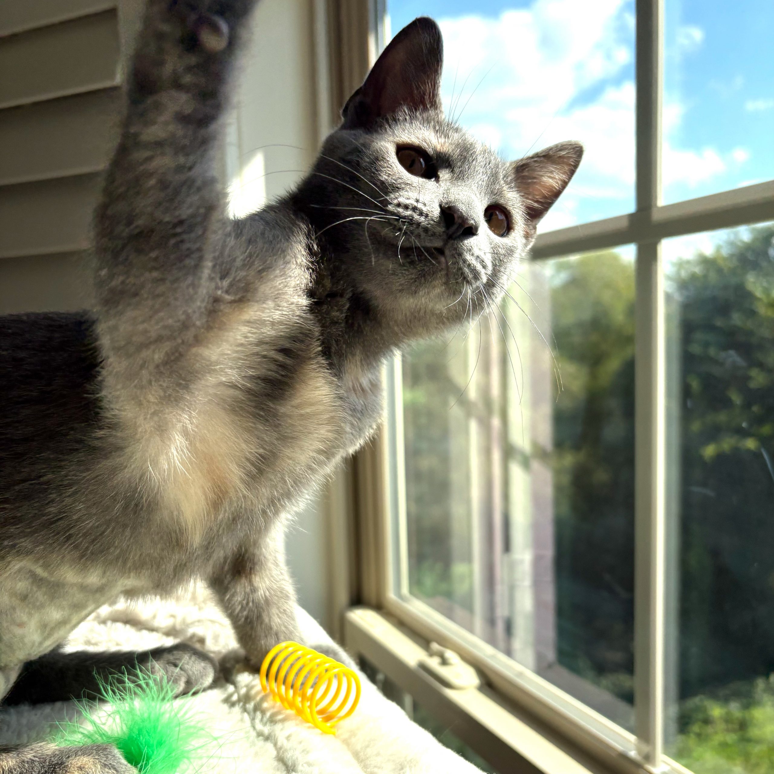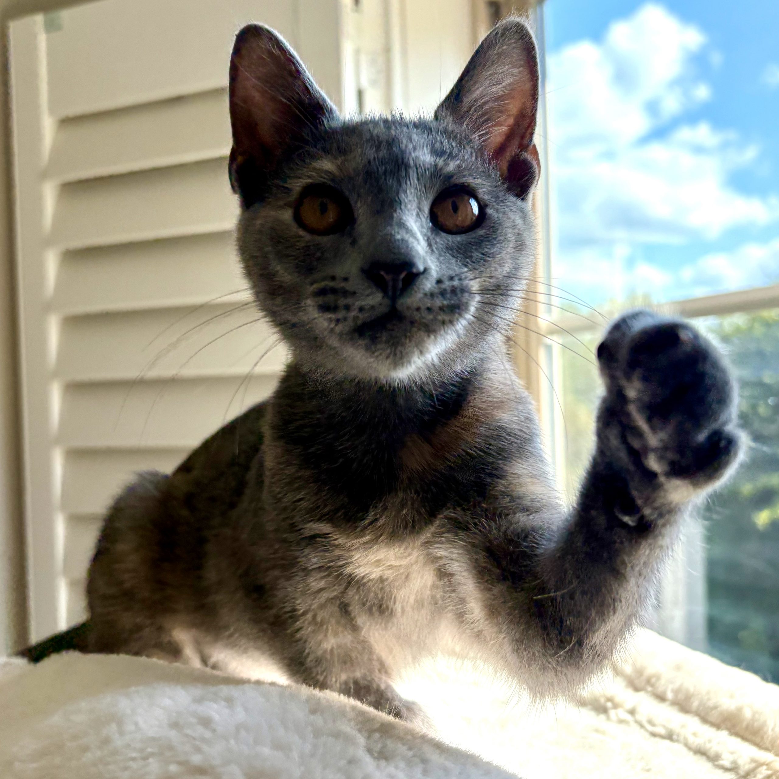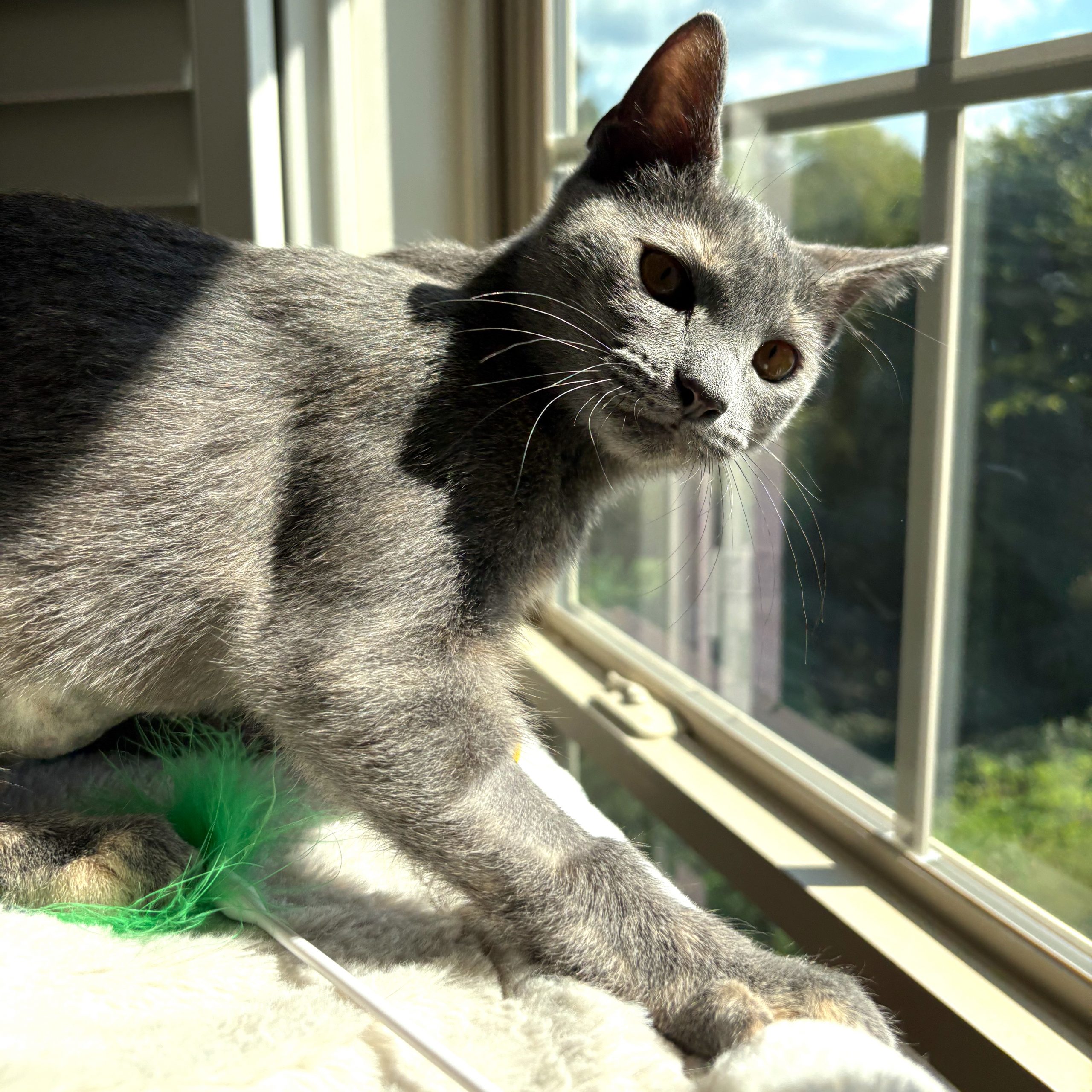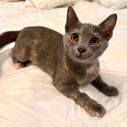 Hi, I'm Peggy! Don't you love my beautiful fur! The peach patches really stand out against the gorgeous gray! I love to play. Actually, I LOVE to play. A LOT. Like ALL the time. I'd love to be adopted with another kitten or to a home with a younger cat who also shares my passion for all things play. If you feed me wet food, I'll be your bestie for life and I'll purr every time I see you. I'm super sweet and want nothing more than your love and attention. Can't wait to meet you!