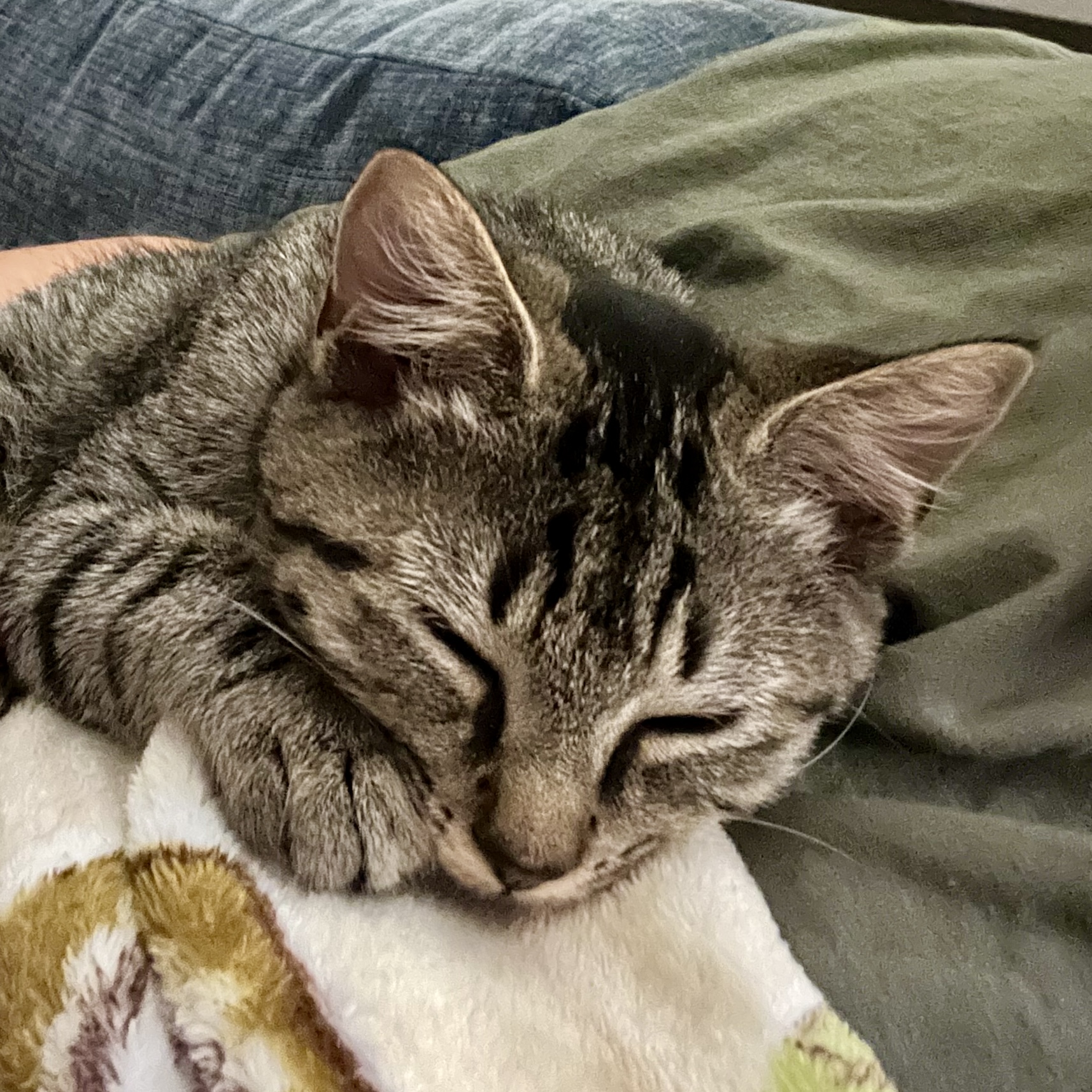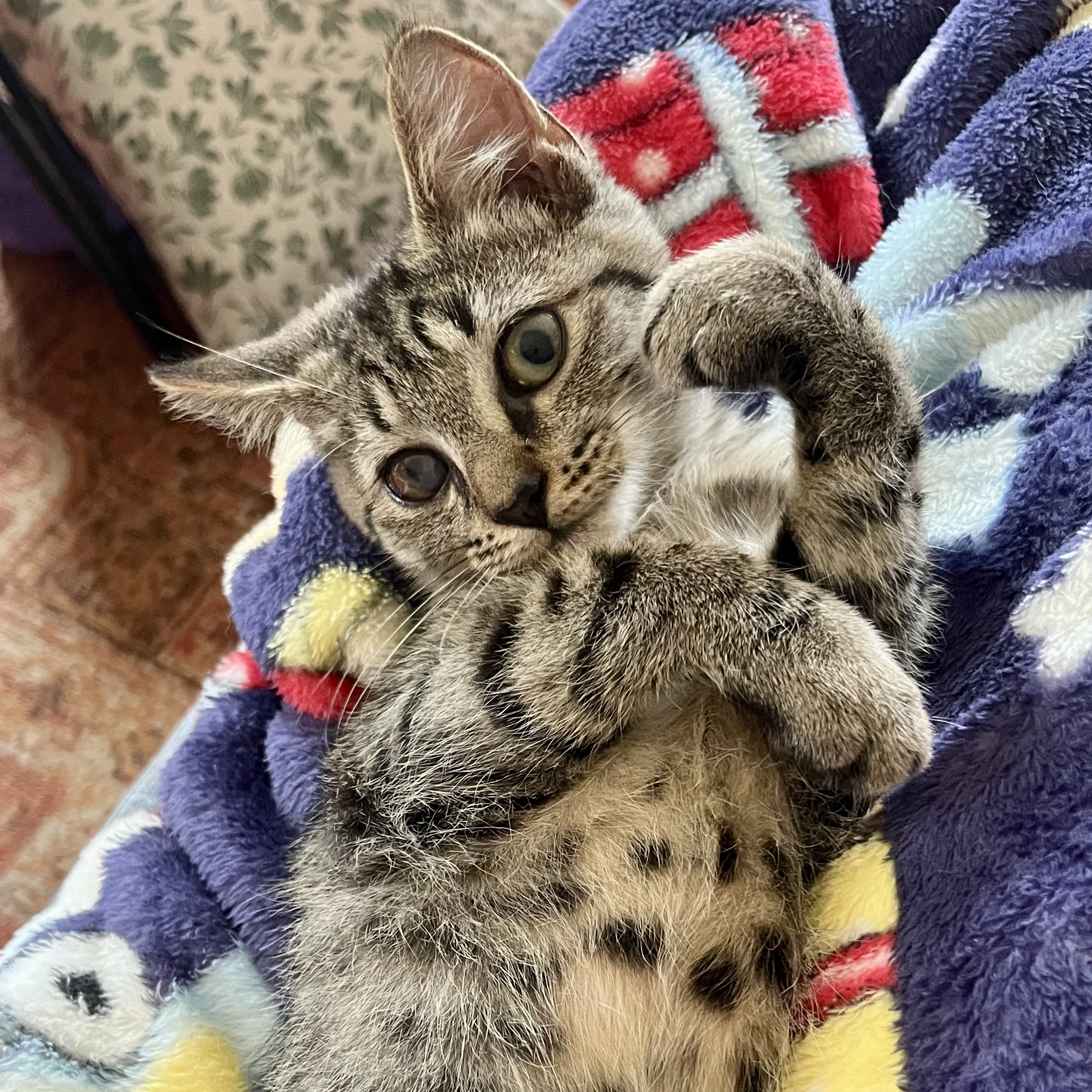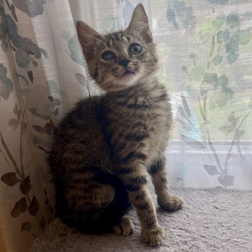 I am full of kitten energy but I am always ready to cuddle! My eye was pretty gross when they found me, but my foster momma gave me meds and I’m all better now. My eye will always be a little cloudy but it doesn’t slow me down! I grew up in a house full of activity, so I’m used to other cats, kids and dogs too.