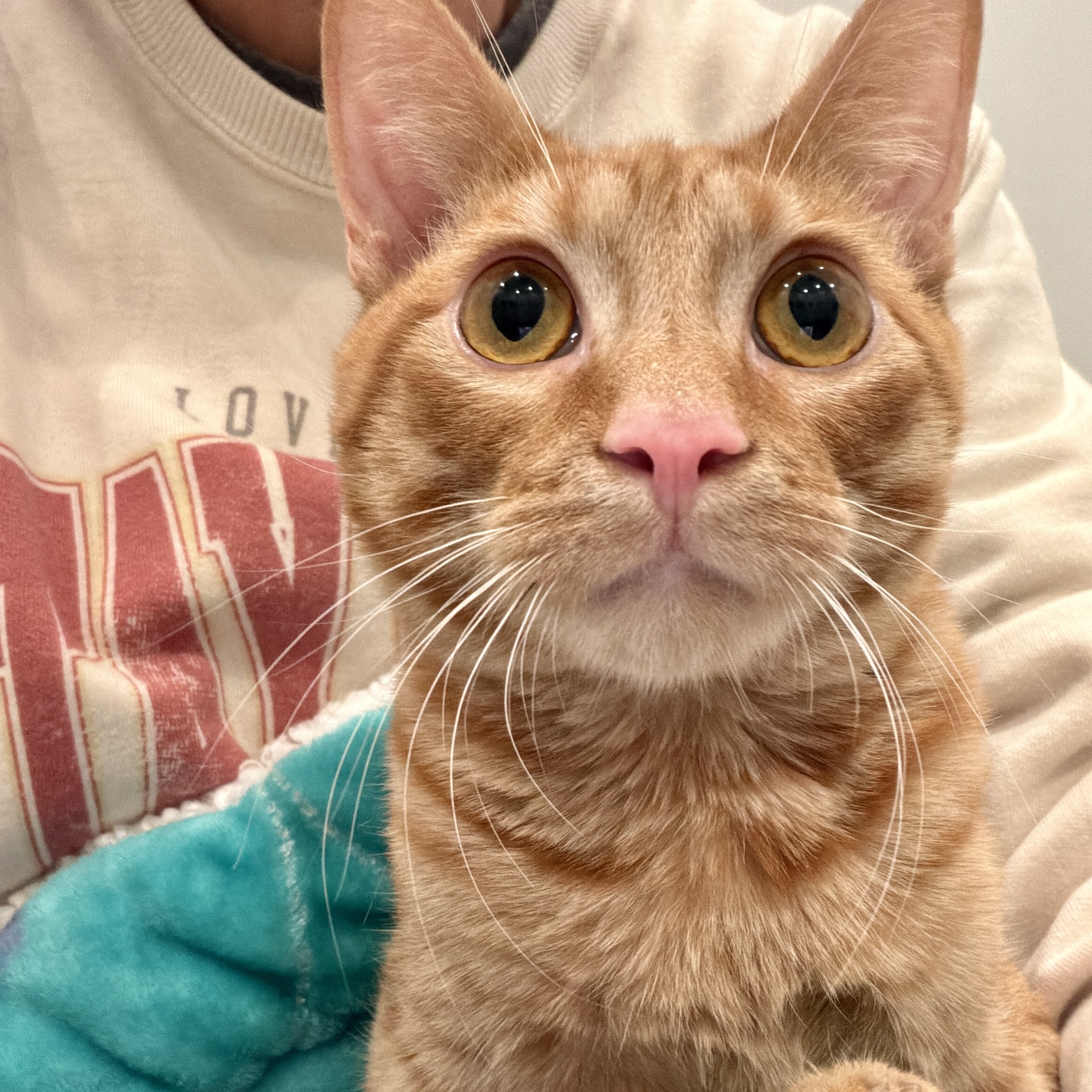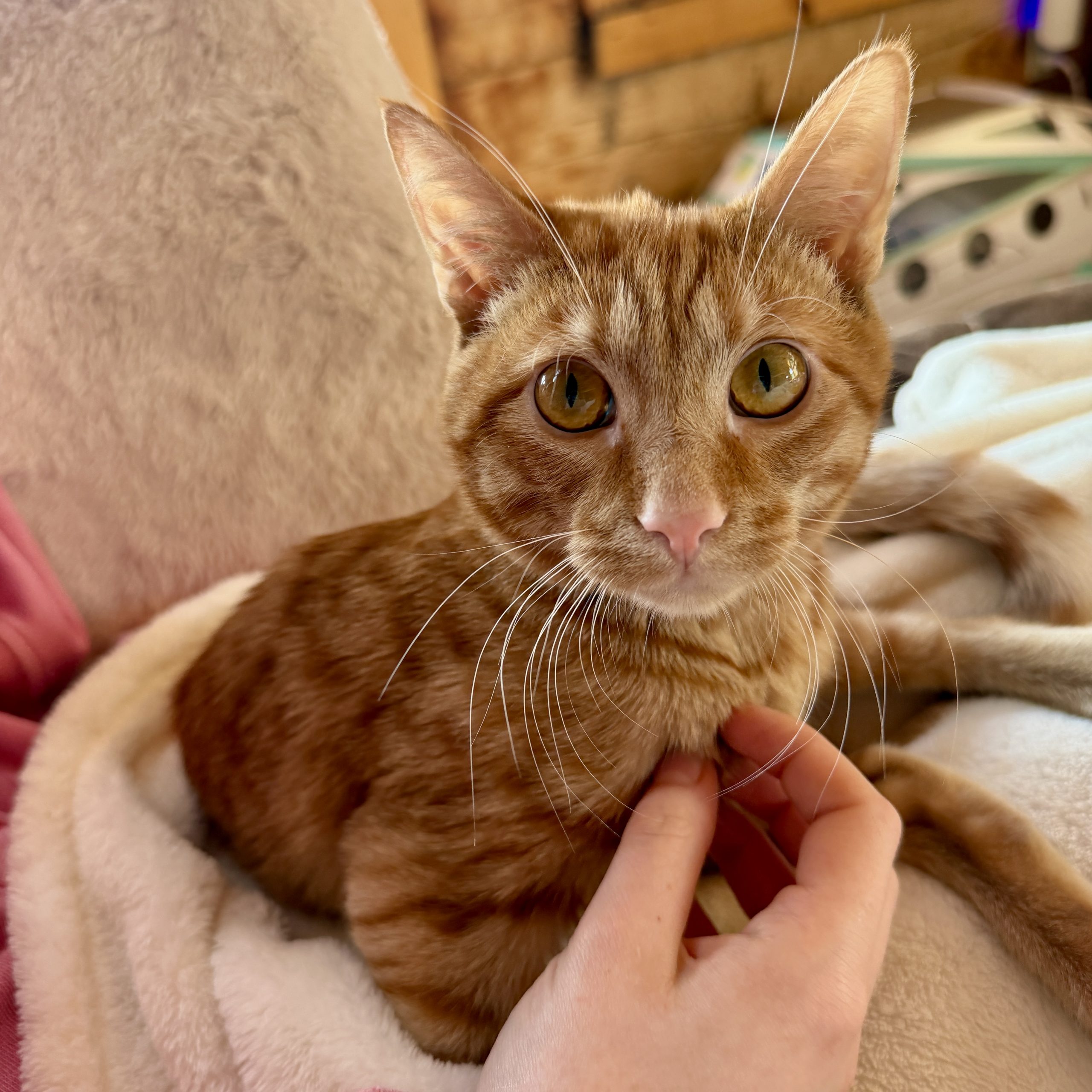 Scooch was rescued as a two-week-old kitten whose momma had just been hit by a car while carrying him across the street. He had a nasty wound from the accident, and it left him paralyzed from his mid-back down. Because of this, he… well… scooches! Admittedly Scooch isn’t super mobile, but that doesn’t stop him from motoring (in his own way) towards the wet food. He’s also VERY passionate about being petted and held. Scooch would spend 23 hours a day in someone’s lap if you’d let him! On a recent vacation, Scooch’s paws barely touched the floor because he was passed from human to human. The major downside to his paralysis is that Scooch can’t control when he goes to the bathroom, so he needs to be expressed. He’s on a three-times-a-day schedule now (7-8am, 5-6pm, and 10-11pm), and he goes very easily with expressing. But the positive note - no litter box to clean! Seriously, though, if you have a dog, they have to be let out multiple times a day, and Scooch is no different… kind of. His foster momma has met few cats as sweet and friendly as Scooch, and we know his sparkling personality will make his forever family fall in love with him. Interested in learning more about Scooch? Send us a message!