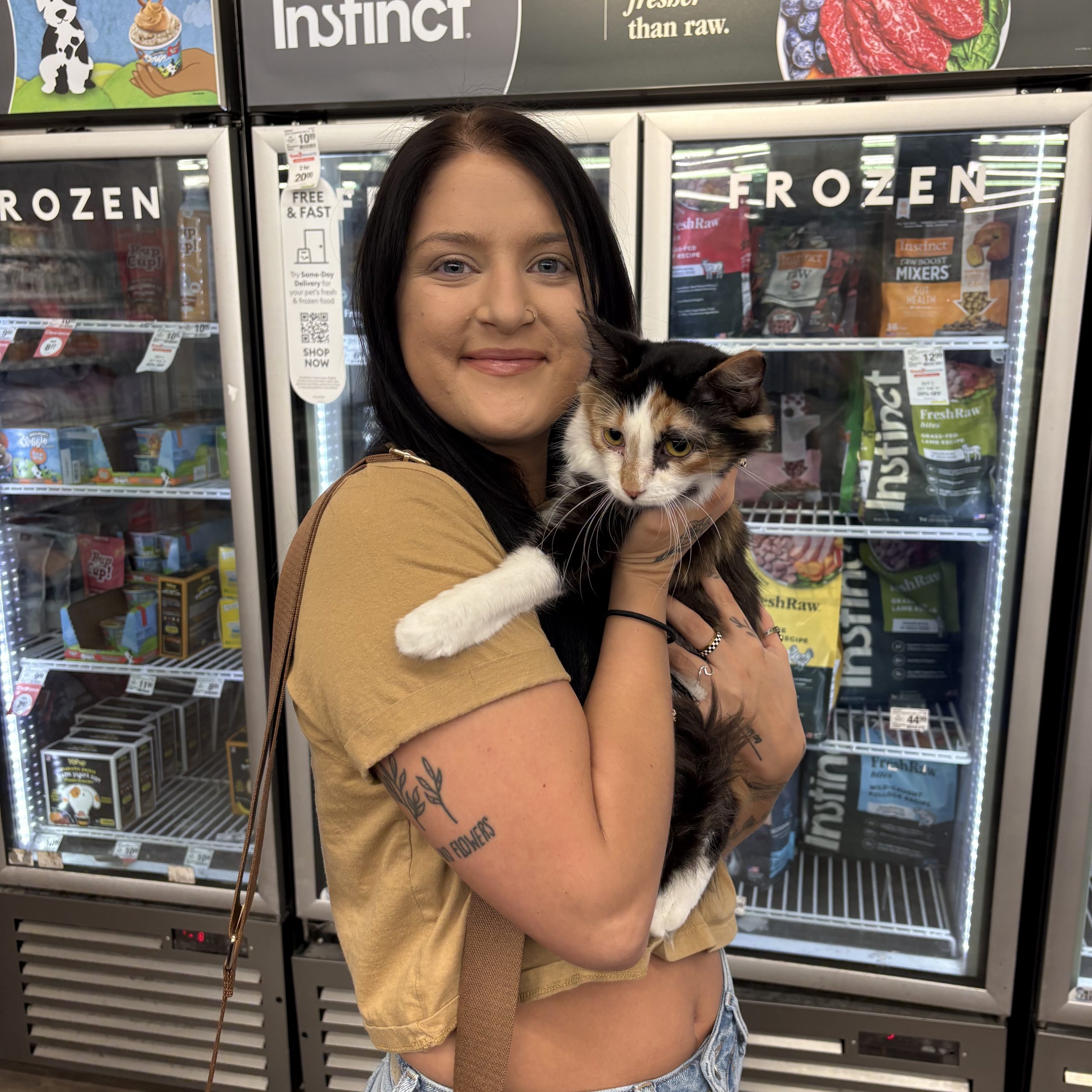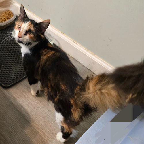 Gorgeous Shania is shy at first, she will probably hide in a corner checking things out for a few days before she comes out to get pets. She loves food though! Once she opens up, she generally keeps to herself most of the day, content to snooze in a comfy armchair or high at the top of the cat tree. She can also be a bit playful, as she is still young. She enjoys running all around with the other foster kitties in her space. She would do really well with another kitty who could show her the ropes, and we have noticed that she is braver with other cats around to show her it's okay as well.