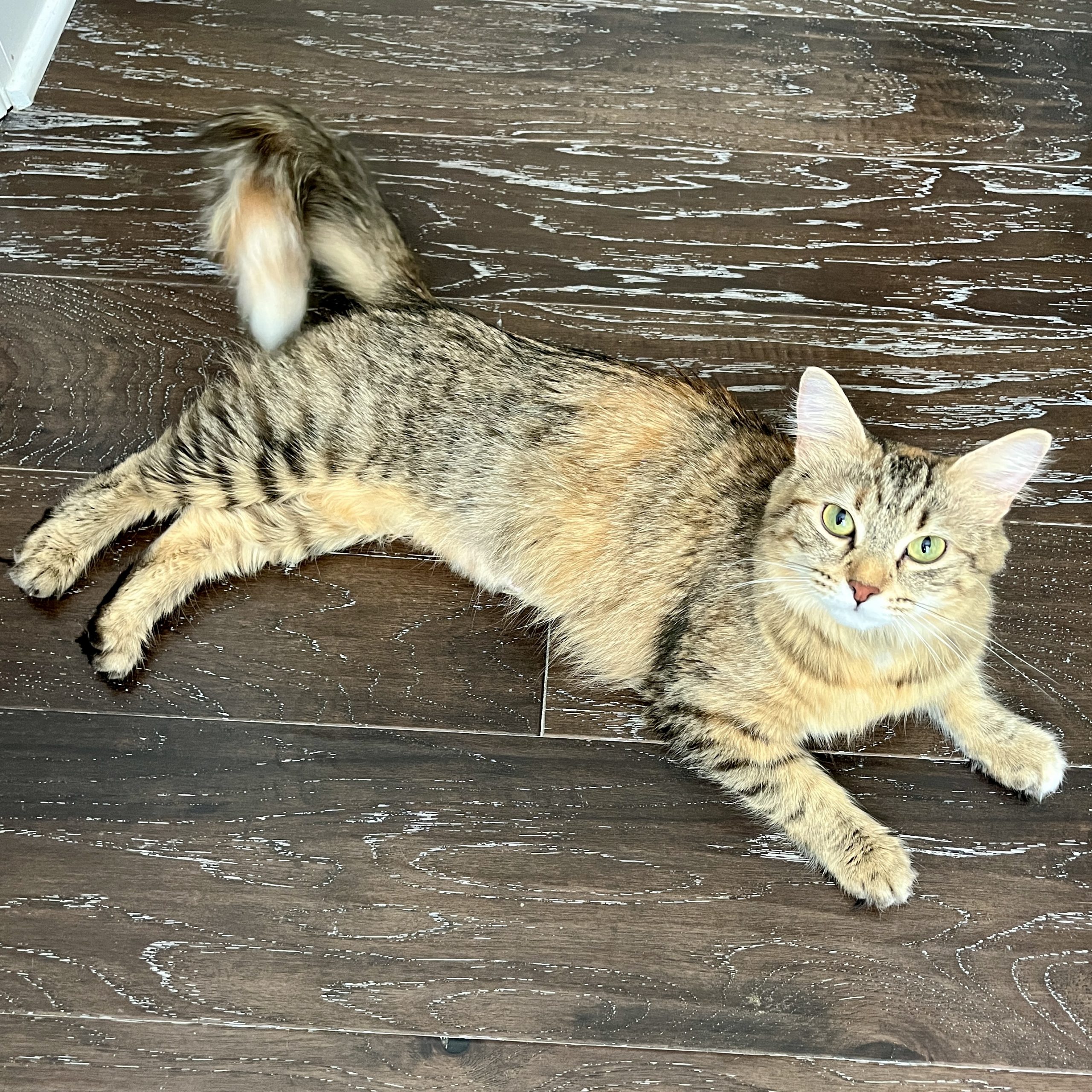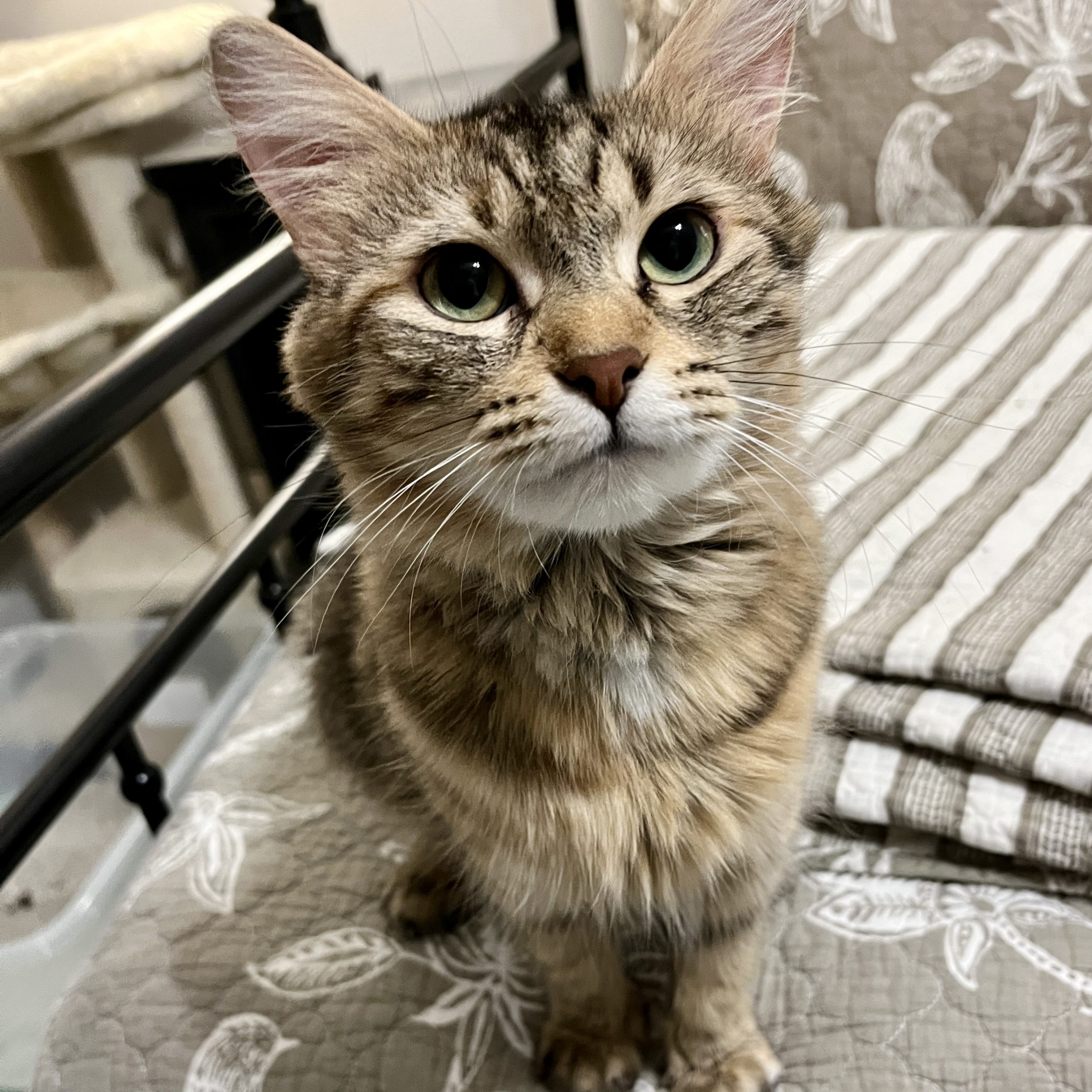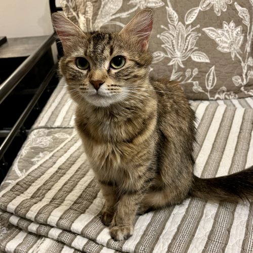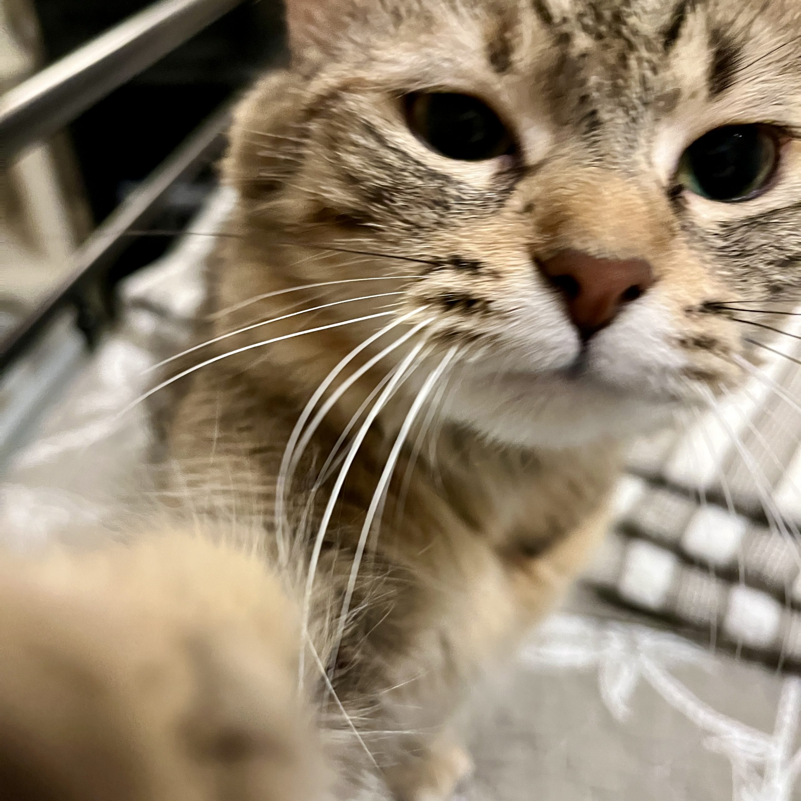 Skunki Nevada came to us after another rescue reached out for assistance. It turns out they gave us a true gem of a feline. Skunki is one of the sweetest, friendliest cats ever. She loves attention from her humans and will put both paws on your shoulders and rub her face all over hers when she greets you! Skunki has spent her time in foster care raising her kittens, but she’s finally ready to let them go and land in the perfect home for her.