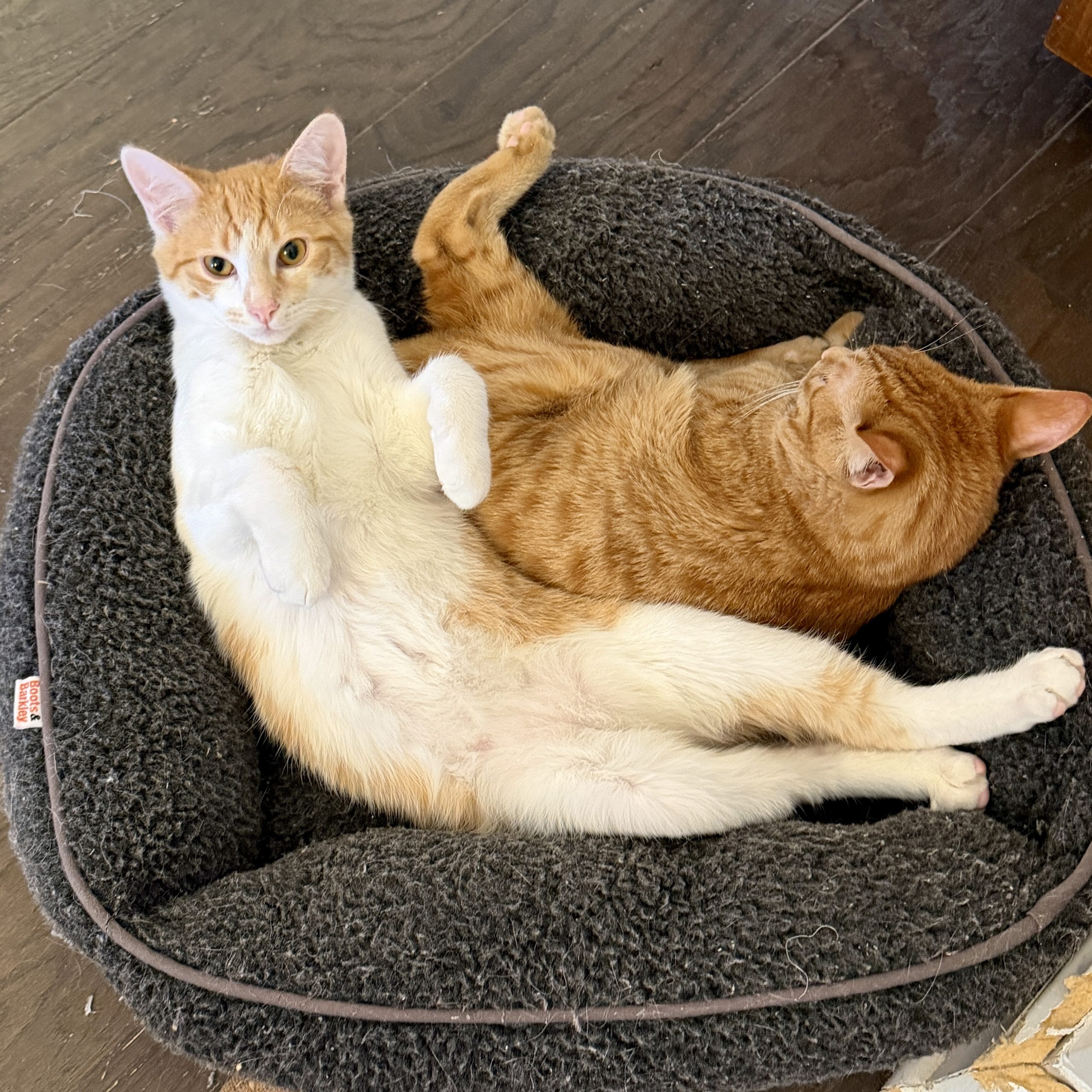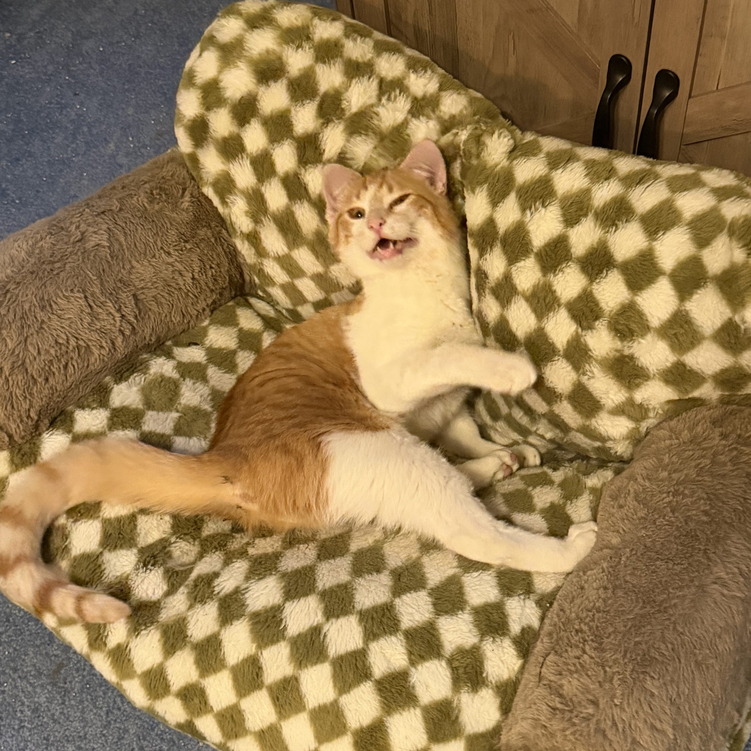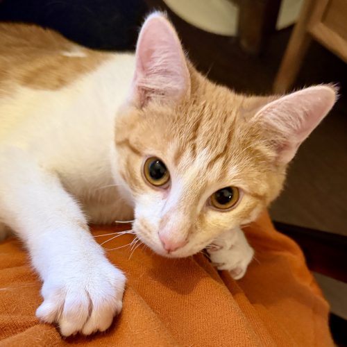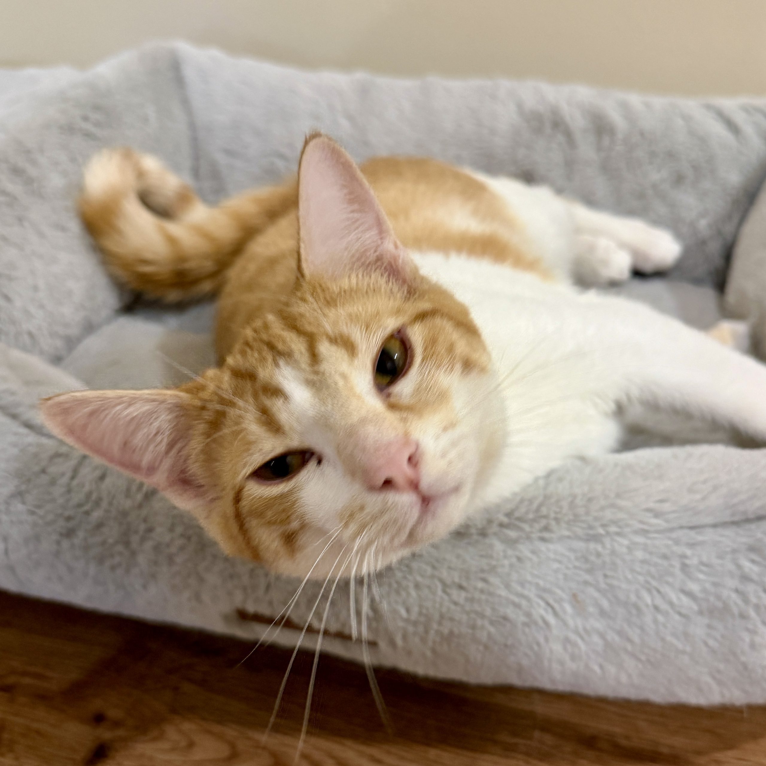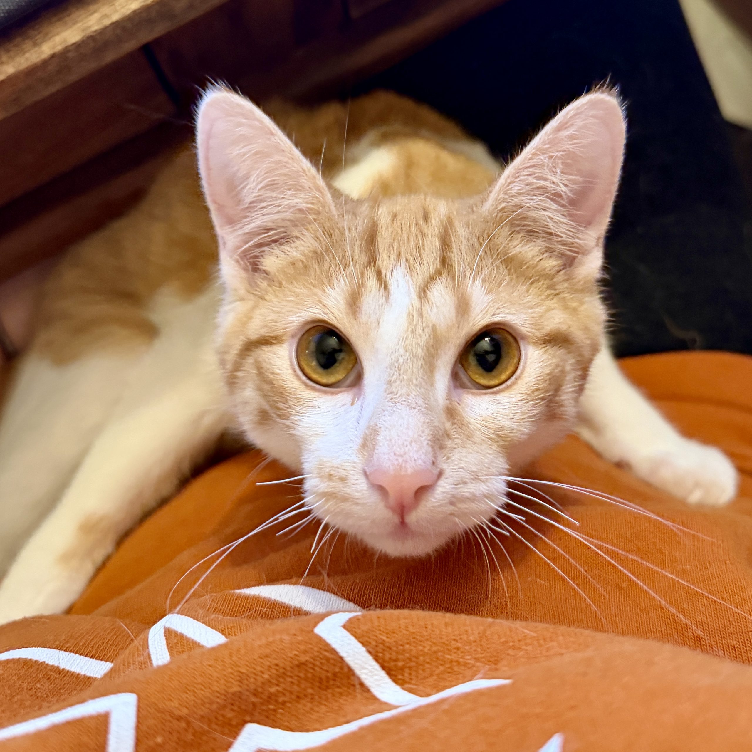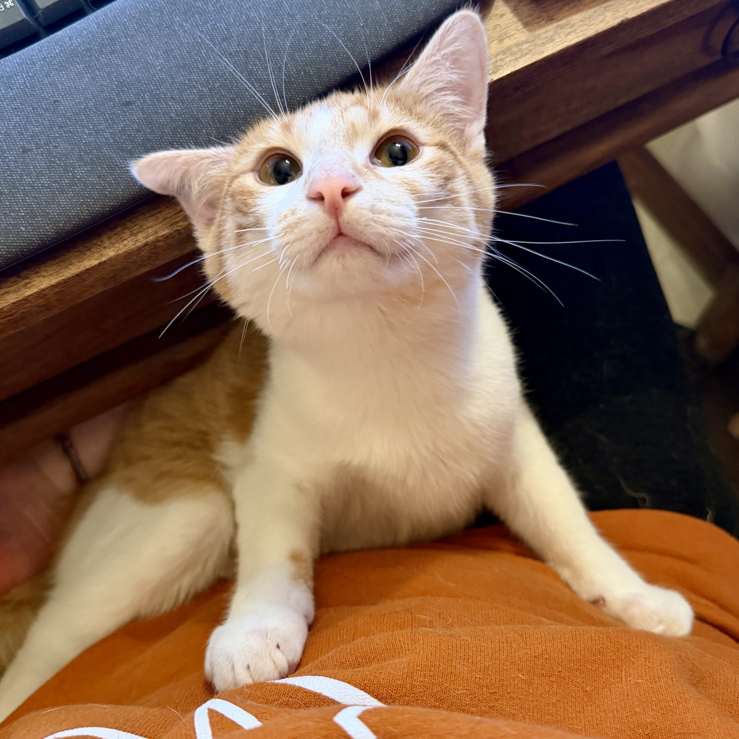 Sparks is one of our most special and sweet kittens! He has a condition called cerebellar hypoplasia (CH), or wobbly cat syndrome. CH is a rare neurological disorder that affects a cat's balance and coordination. It occurs when the cerebellum, the part of the brain that controls these functions, doesn't develop properly. He is a totally normal kitten… except he wobbles! Sparks LOVES other cats, especially wrestling with them. It might take him a minute to buddy up with them, but it usually doesn’t take long for him to realize they’re friend material. He’ll fling himself across the room to get to the nearest cat and have a play date. Sparks also does well with cat-savvy dogs, but it’s really important to make sure the canine will be good with sudden, jerky movements. Sparks loves his people most of all. He’ll scream at you for attention, slamming into your shins for pats. He has THE BIGGEST purrs and will show them off when you pet him or pick him up. Sparks is trained to use large washable pee pads, although he has an 80% success rate. He’ll try to cover up his mess too just like a normal cat - he’s so smart! Because of his CH, Sparks needs to be in a one-story home or be kept away from stairs.
