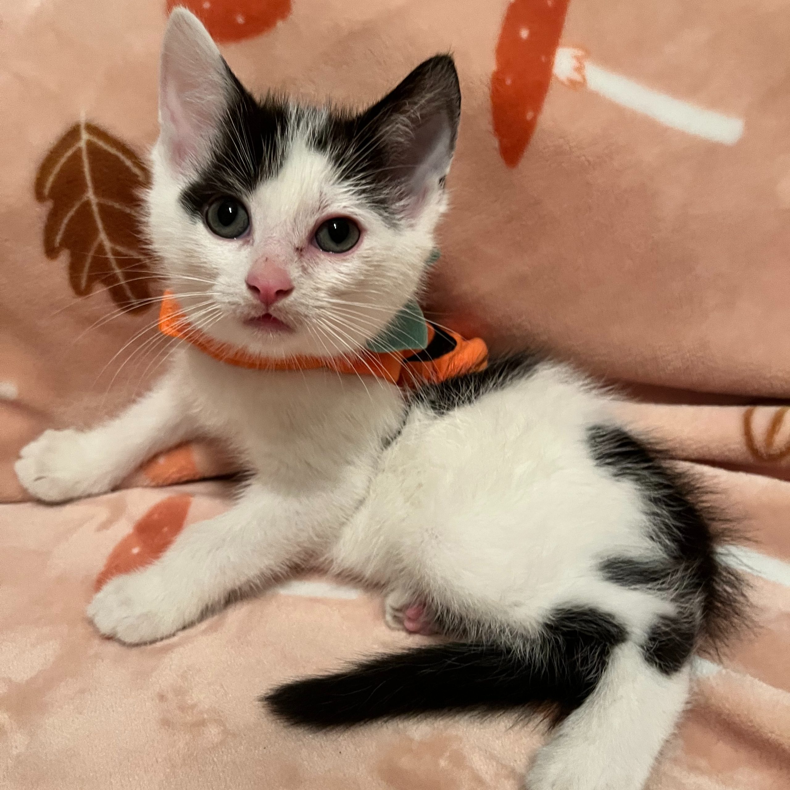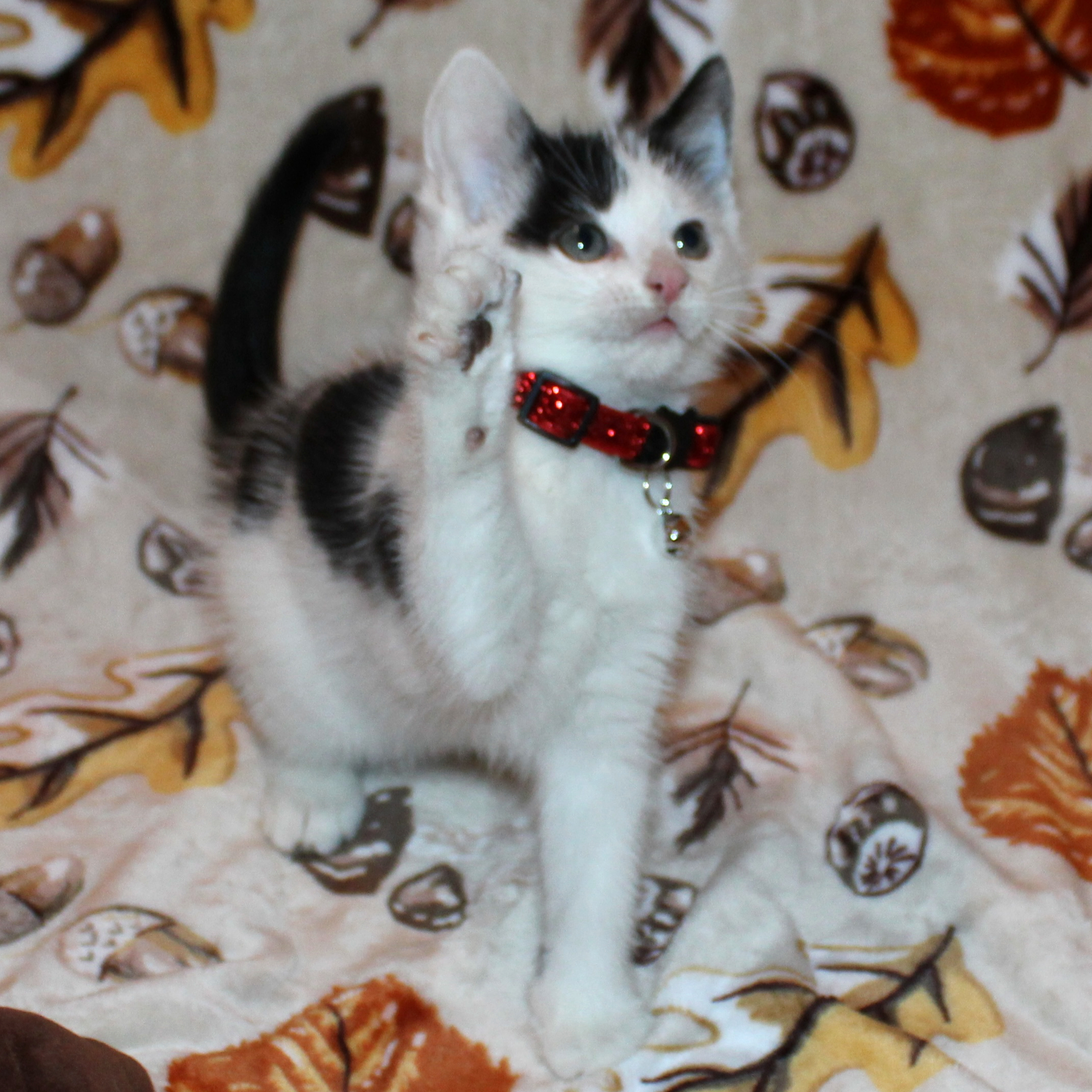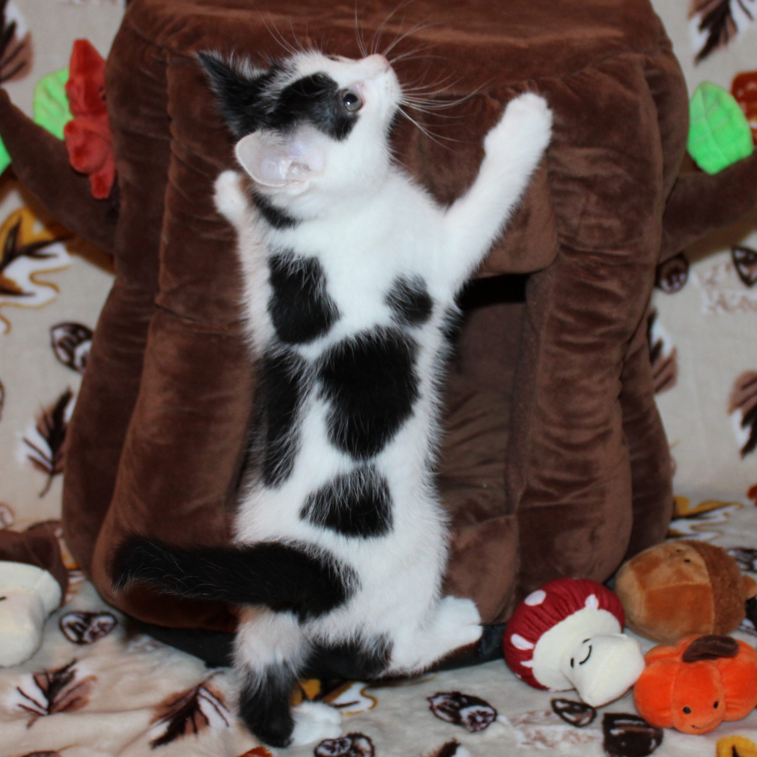 His energy level is high and his curiosity is unmatched. He would do best with another cat or kitten that can help keep him entertained. He’s big on routine so he’ll be the first to remind you when it’s time to eat. He gets so excited, he’ll even leave you little food paw prints as a present.