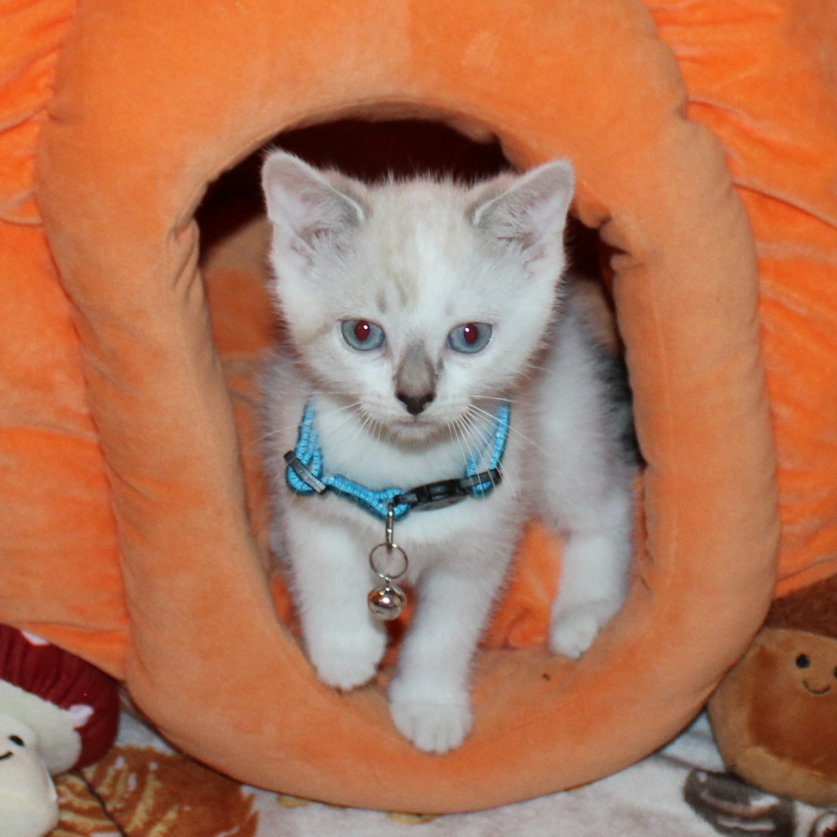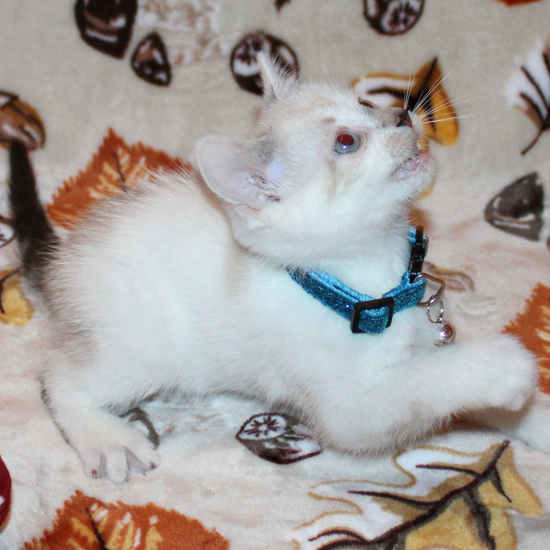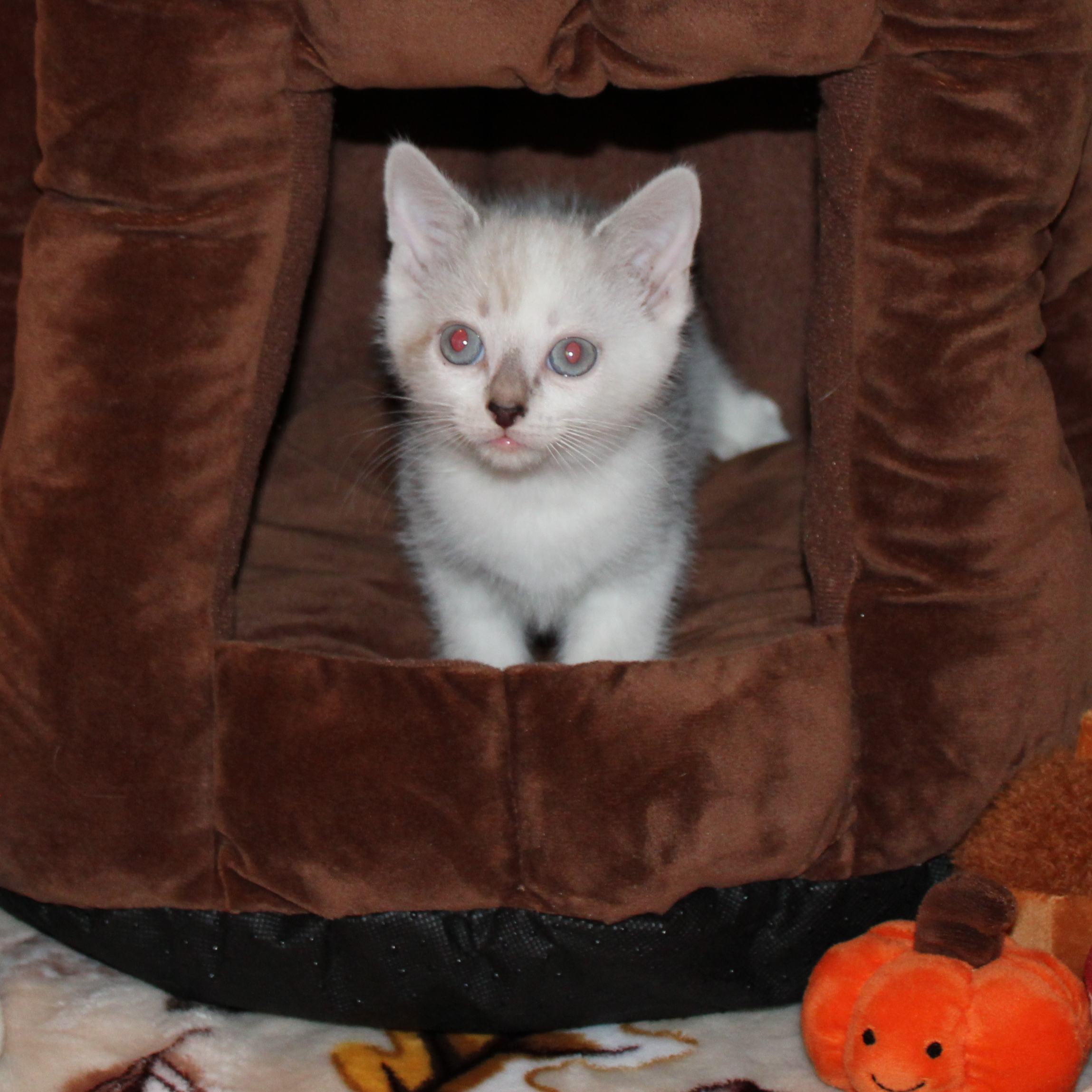 He is vocal and will mew for your attention. He will follow you around and beg for pets. Sometimes he’ll sploot for pets. He LOVES chasing stick toys that have feathers and bells. Springs are also up on the favorite toys list.