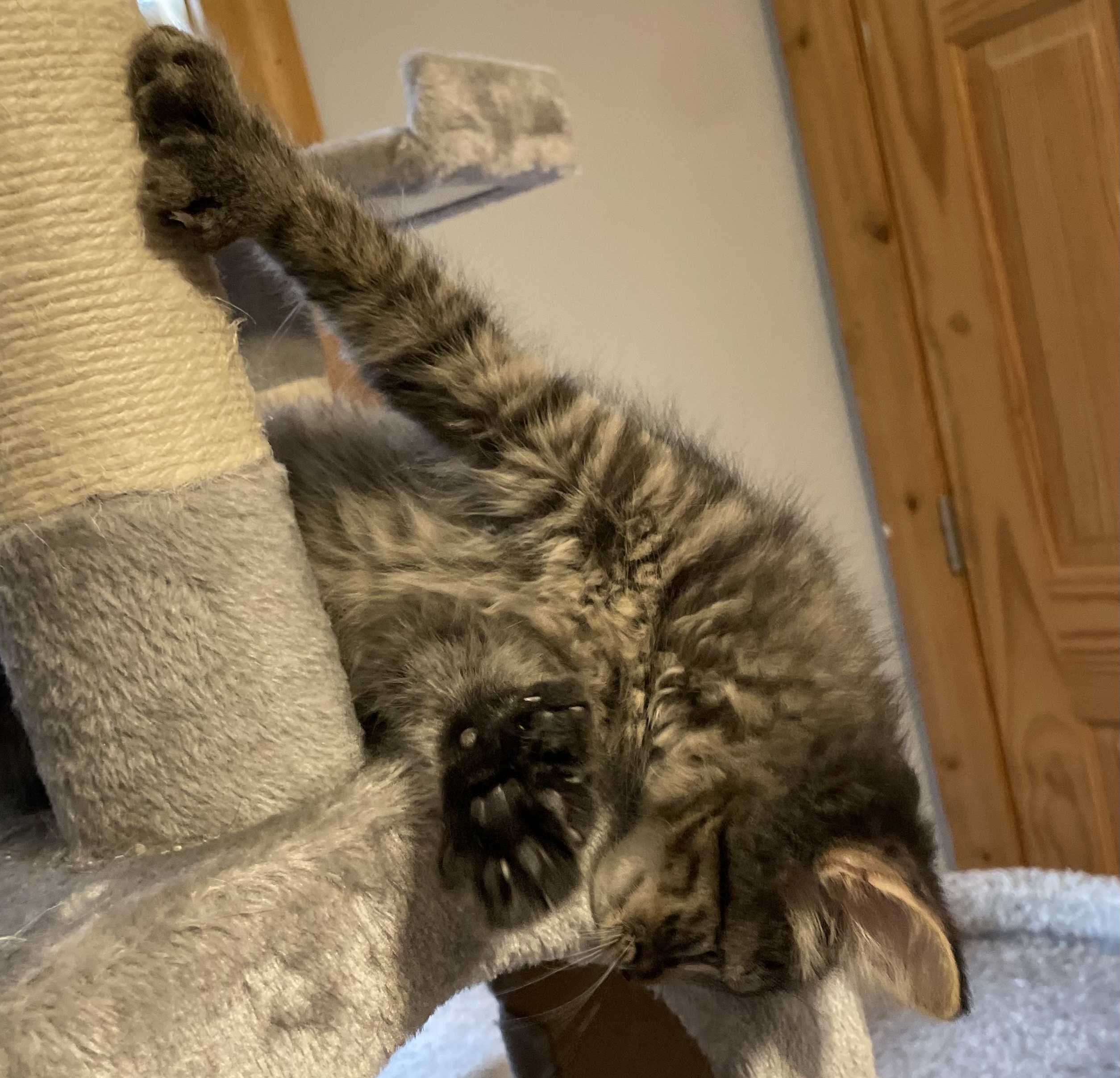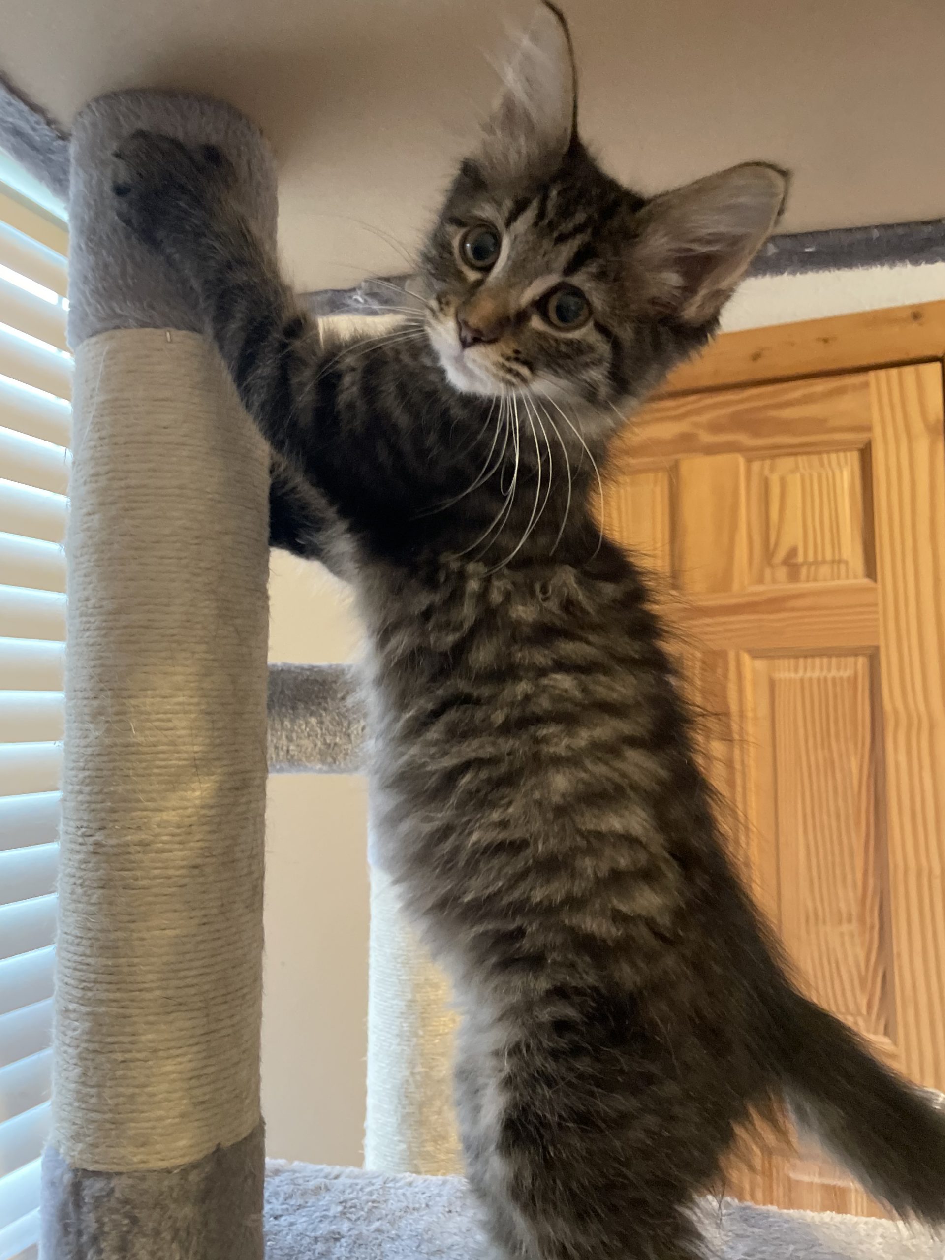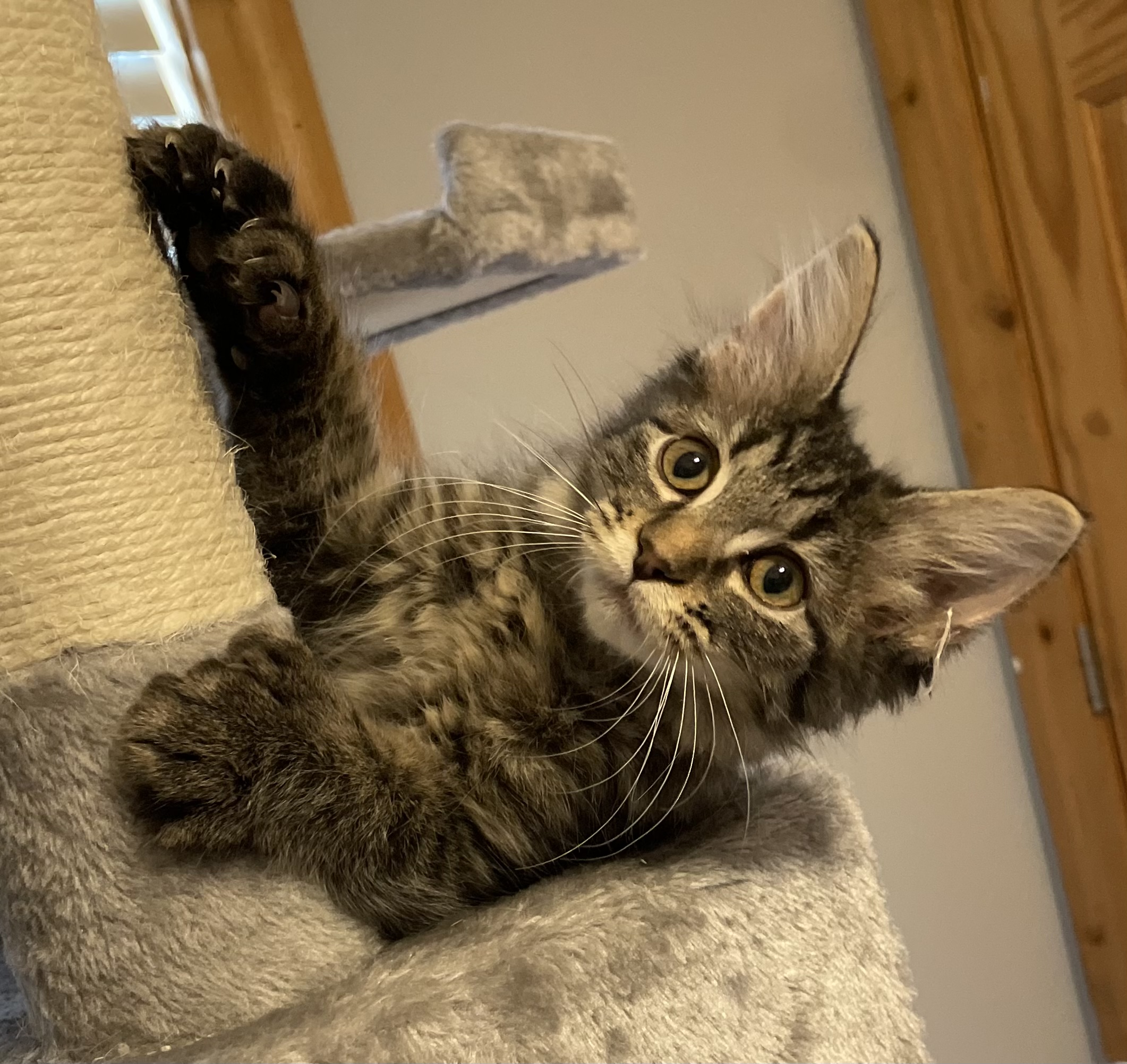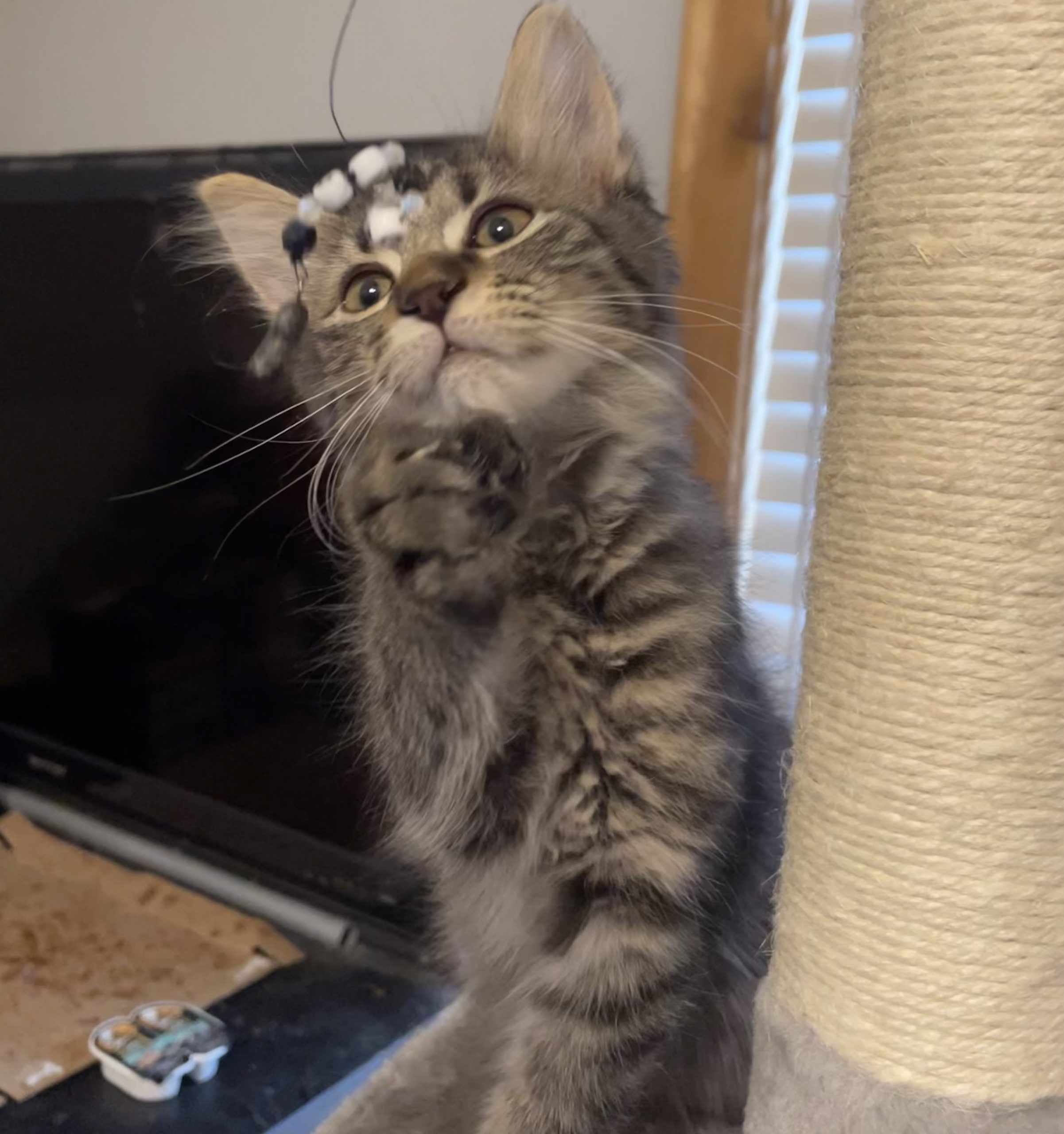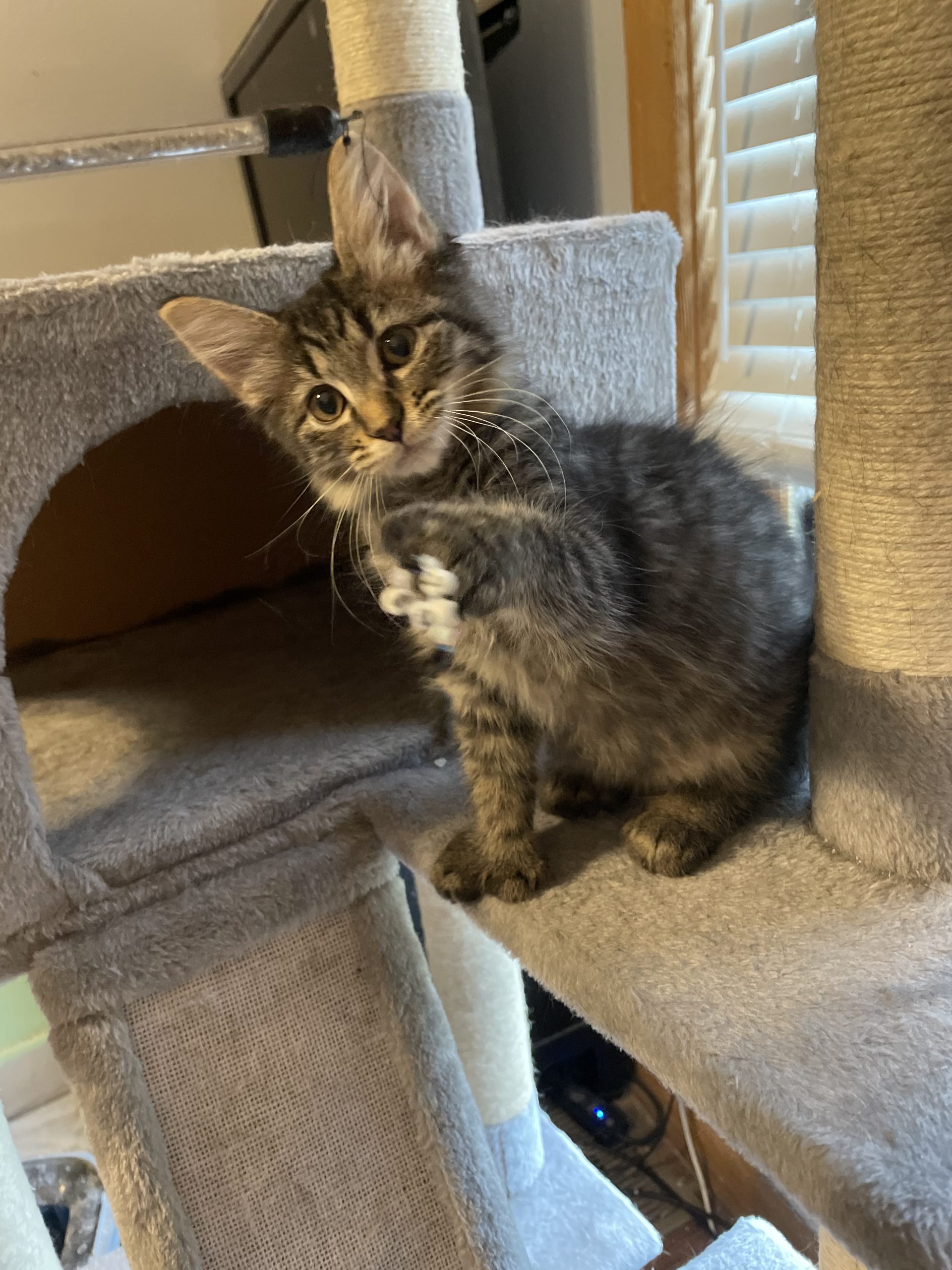 Sweet two-month old Thumbelina was born with extra toes! Cats generally have 18 toes (five on each front paw and four on each back paw). Thumbelina has seven front toes and five back toes for a grand total of 24 total toe beans! This adorable polydactyl girl was rescued during a TNR operation and loves cuddles and wand toys.