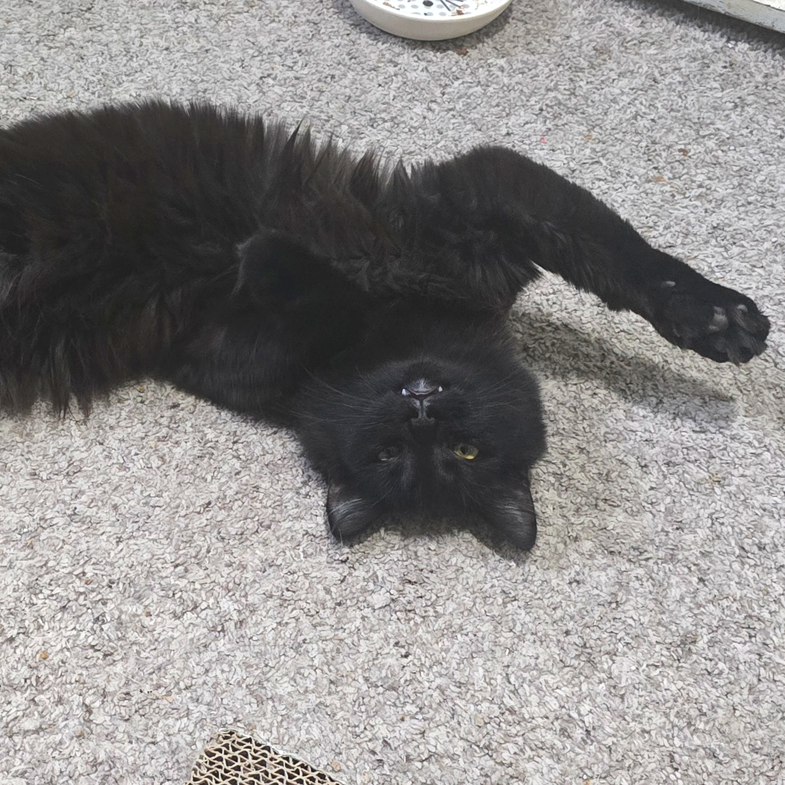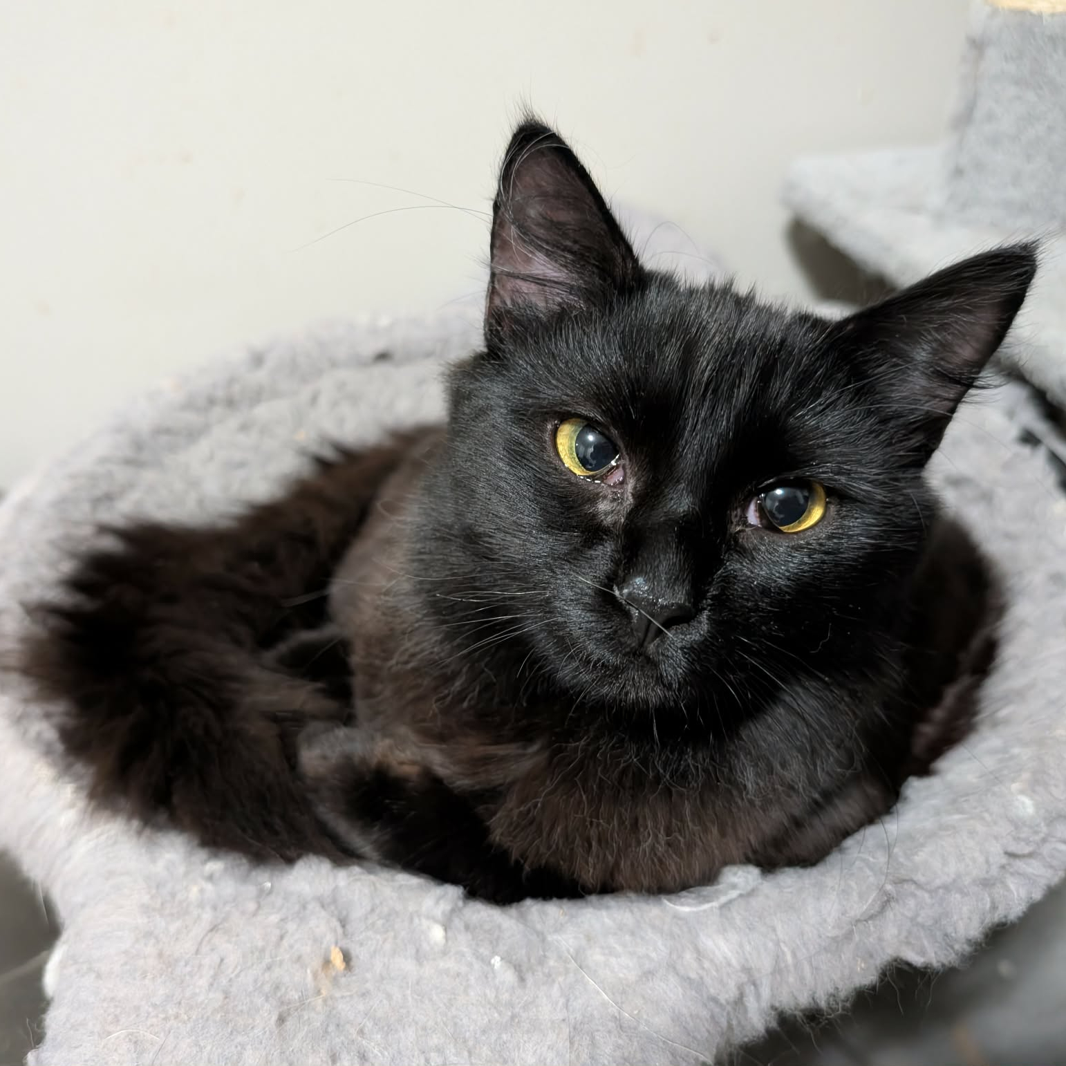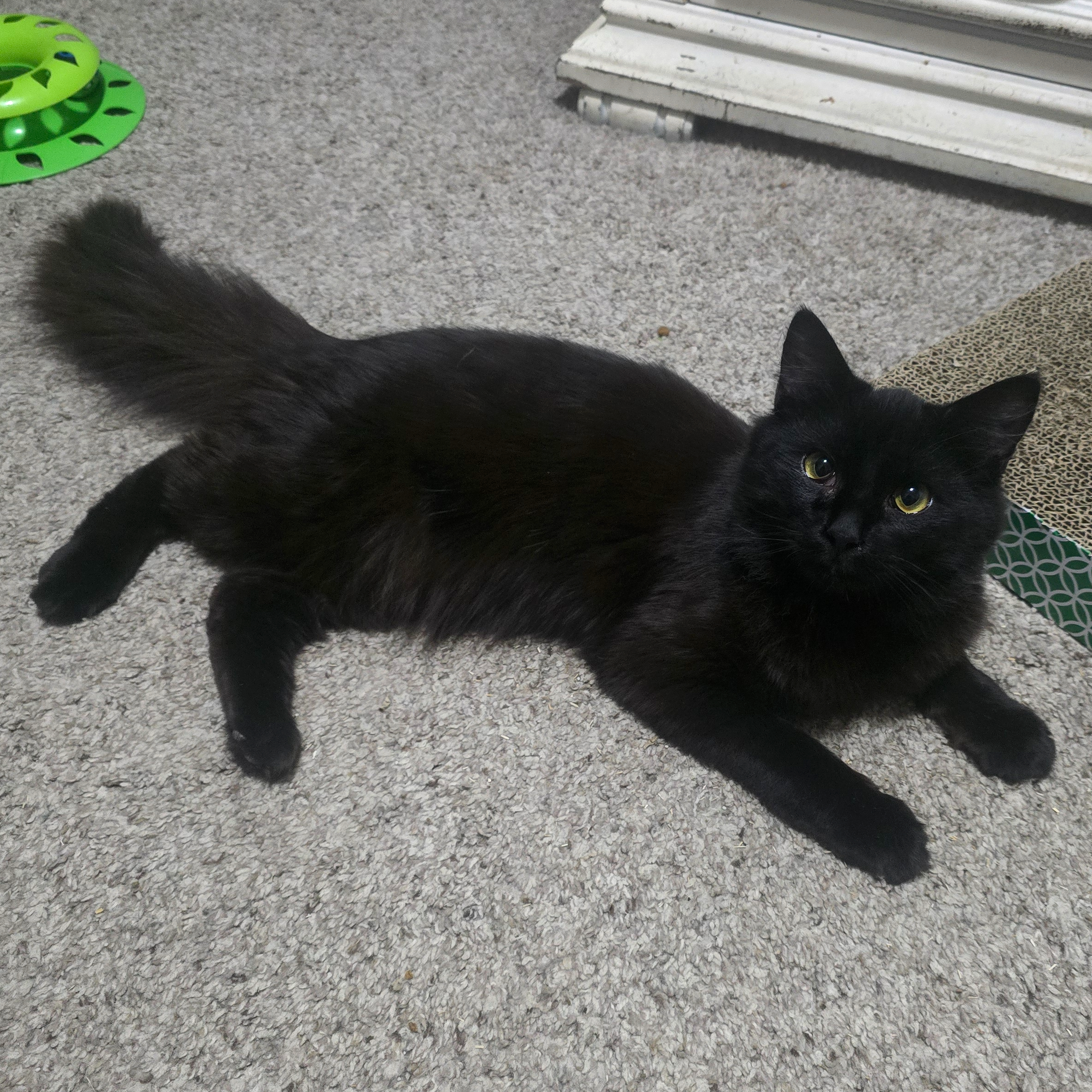 Trace is a handsome man with no thoughts upstairs, if you know what we mean. He is such a sweet boy, and his eyes cross sometimes, which we find absolutely darling. Trace is always up for pets and love. He will roll around on the ground and show you is fabulous long hair and feather duster tail to convince you to pet him. He is also young and playful. He will play with the other kittens that are in foster with him. They chase all around the room, high and low. He also enjoys the ball tower toy.
