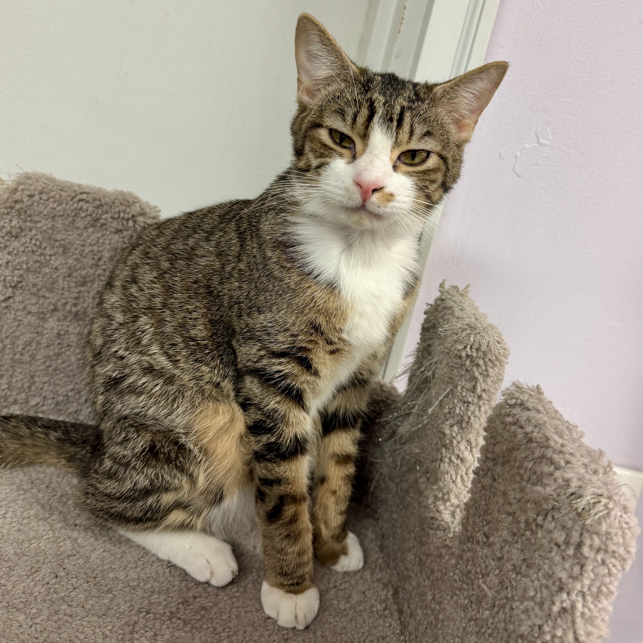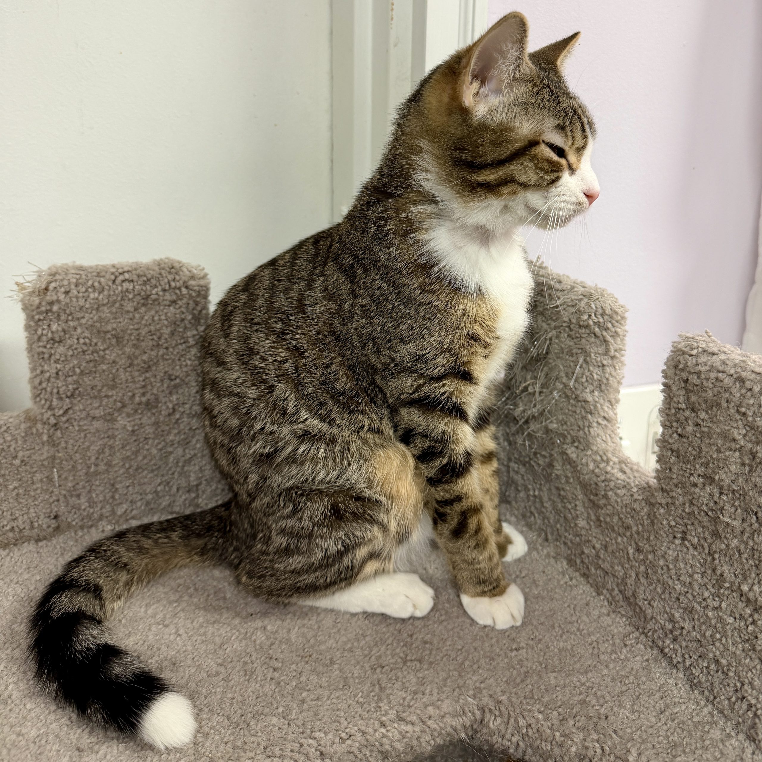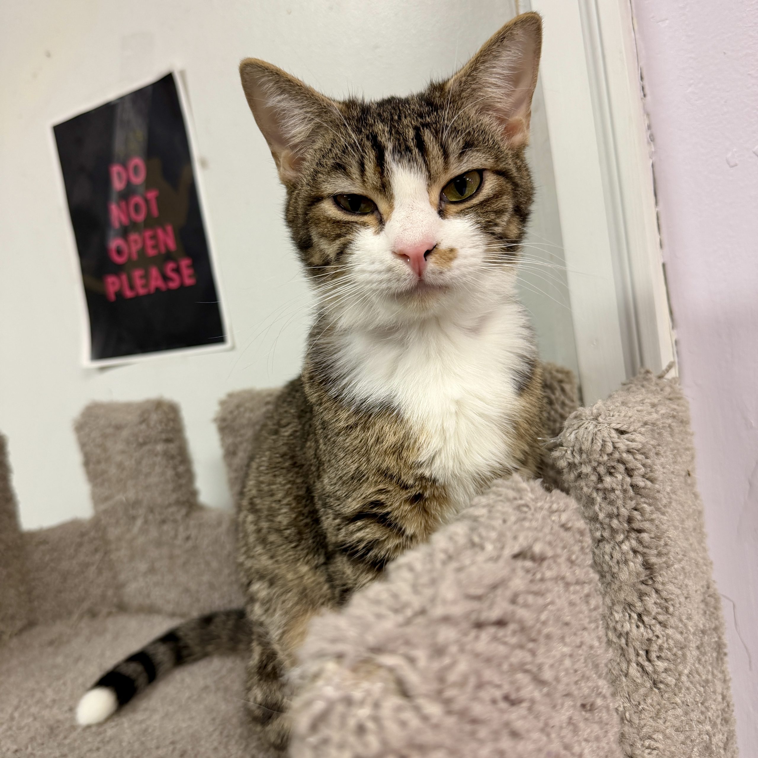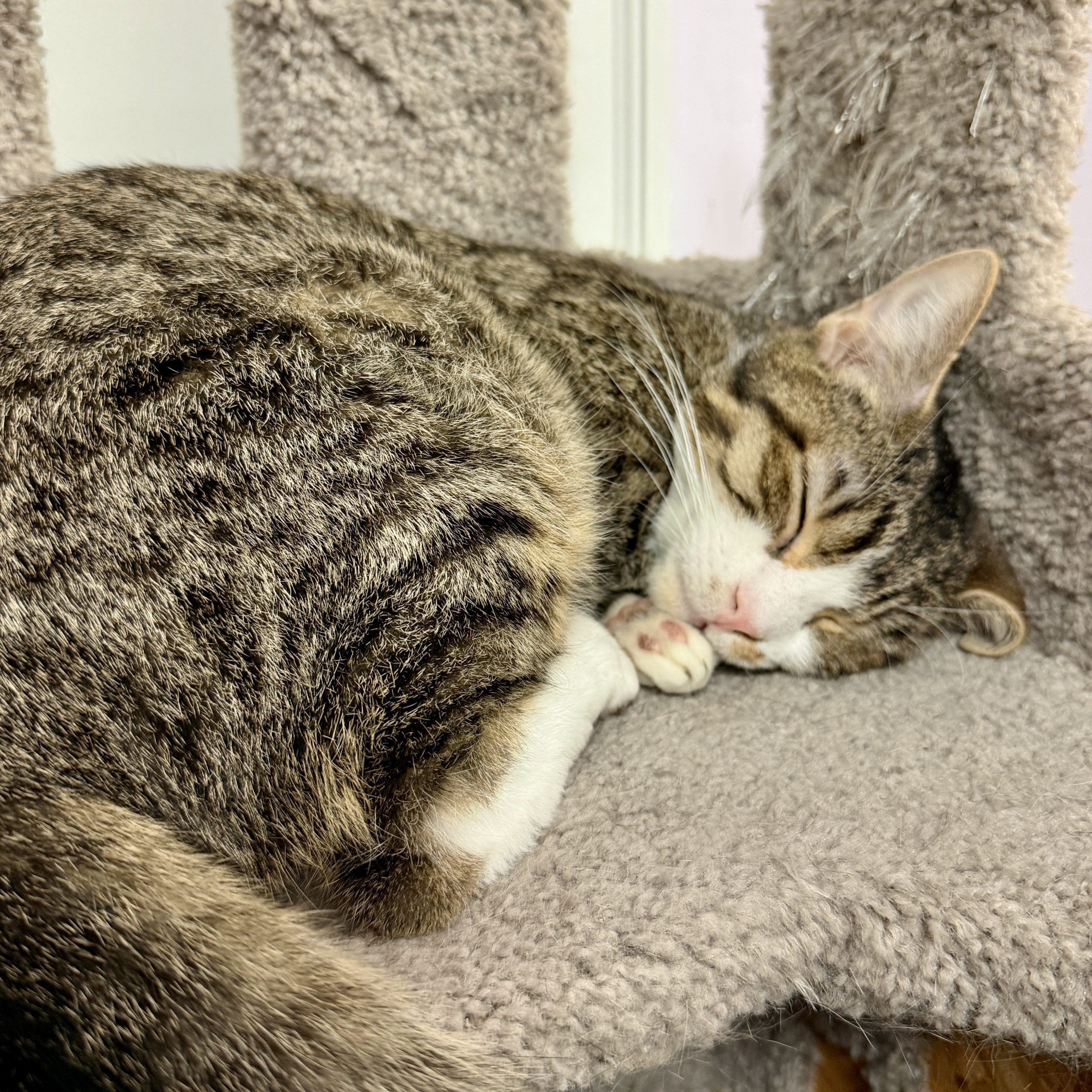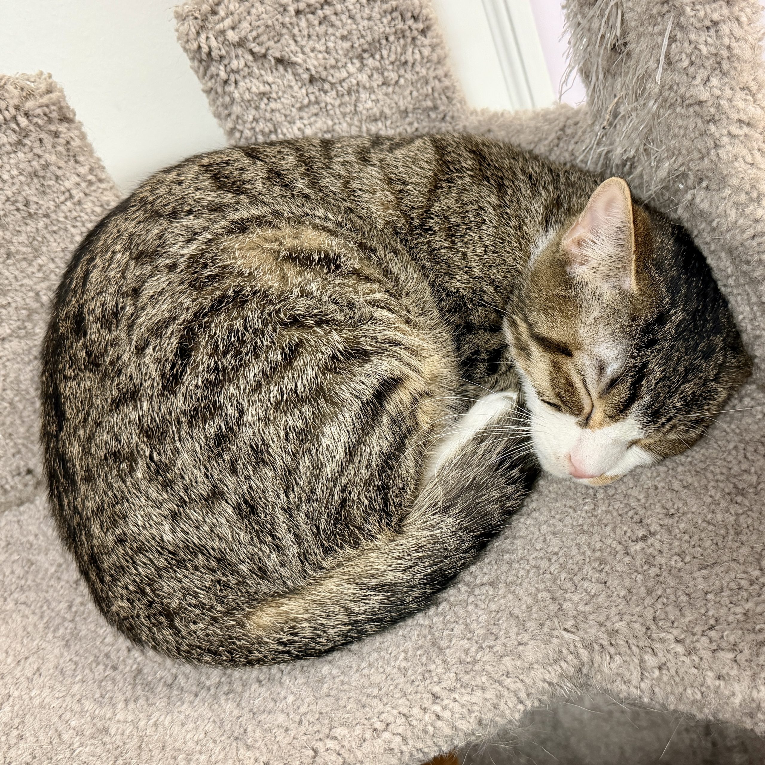He’s the kind of kitten who turns anything into a toy, zooms through the room like he’s training for the Olympics, and then—just as suddenly—retires to his royal quarters (aka the cat tower “castle”) for a well-earned nap. Naturally, he sleeps like a tiny king. Because in his mind… he is one.