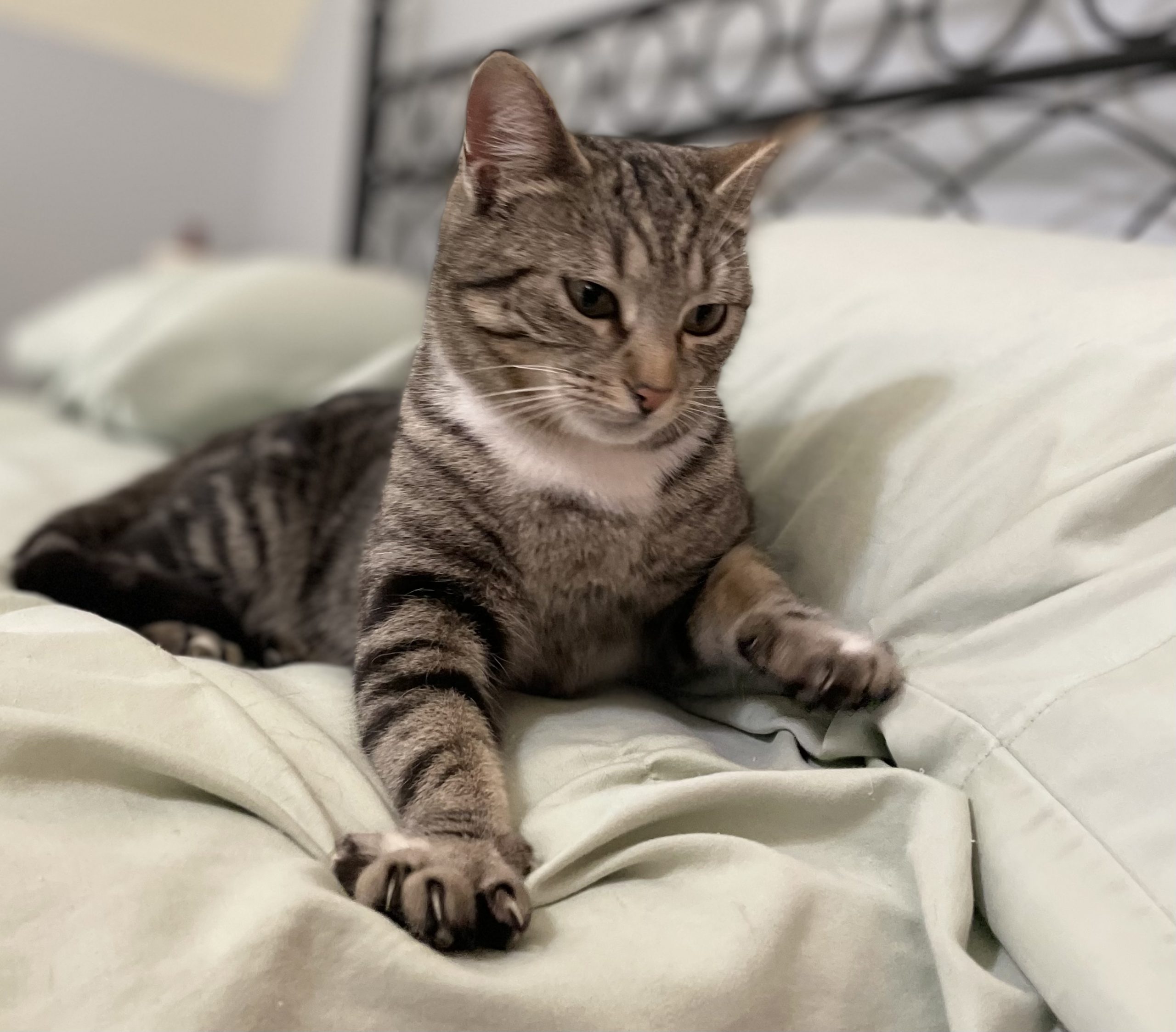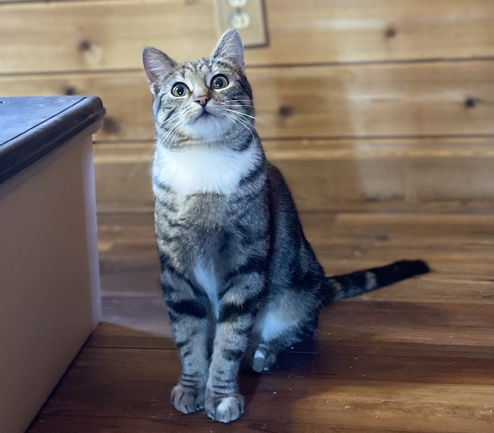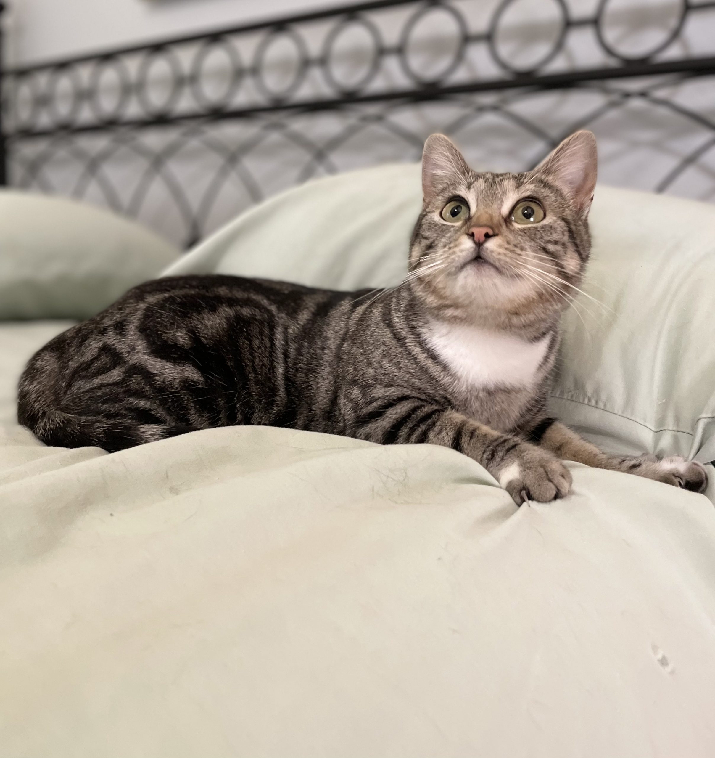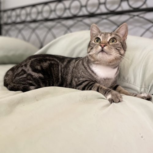 Meet Starlit! This one-year-old classic tabby is a swirl of black and brown with a soft white chest and tiny “paint splashes” on her paws—simply gorgeous! Rescued while caring for her two kittens, she’s now ready to reclaim her playful kitten days.