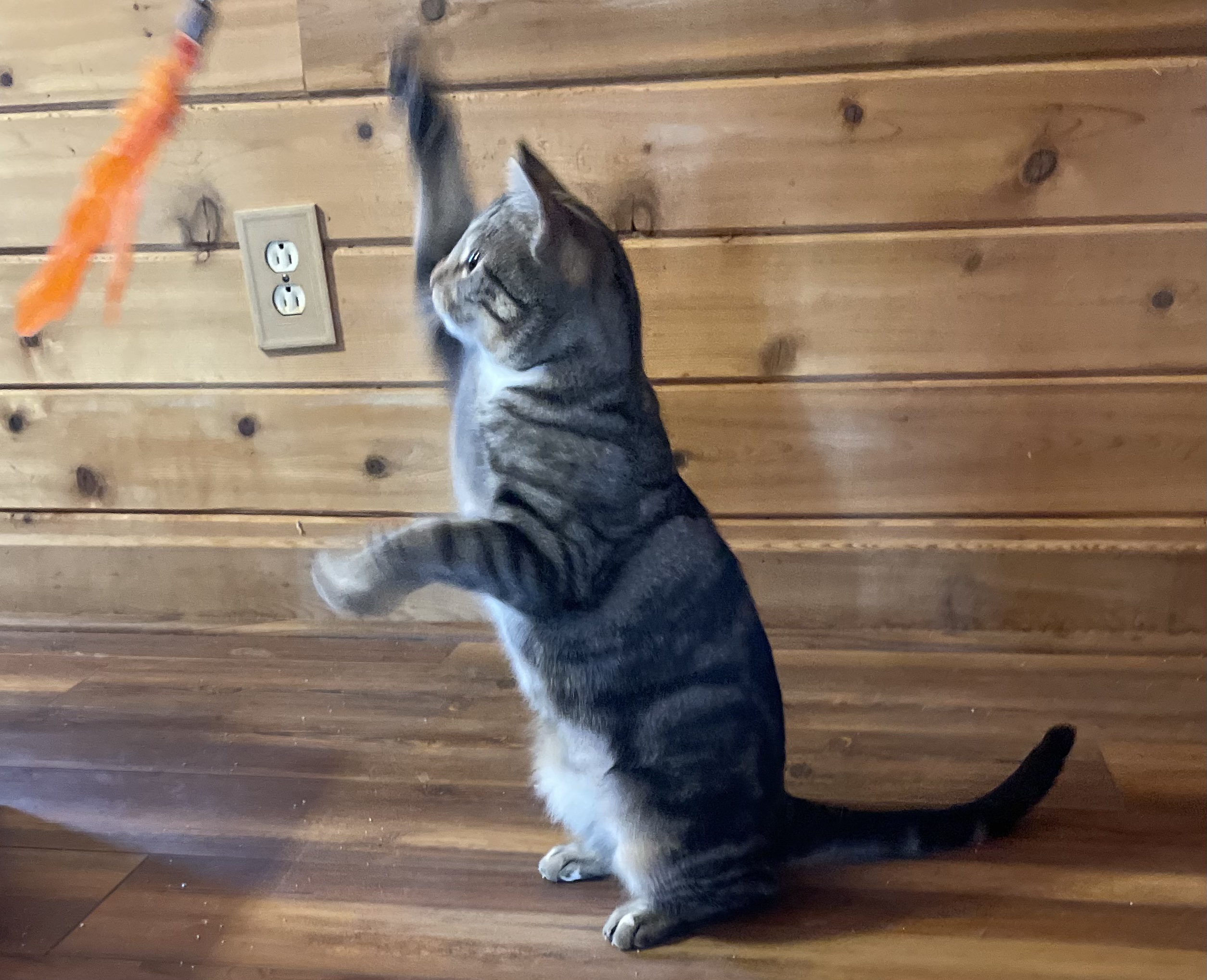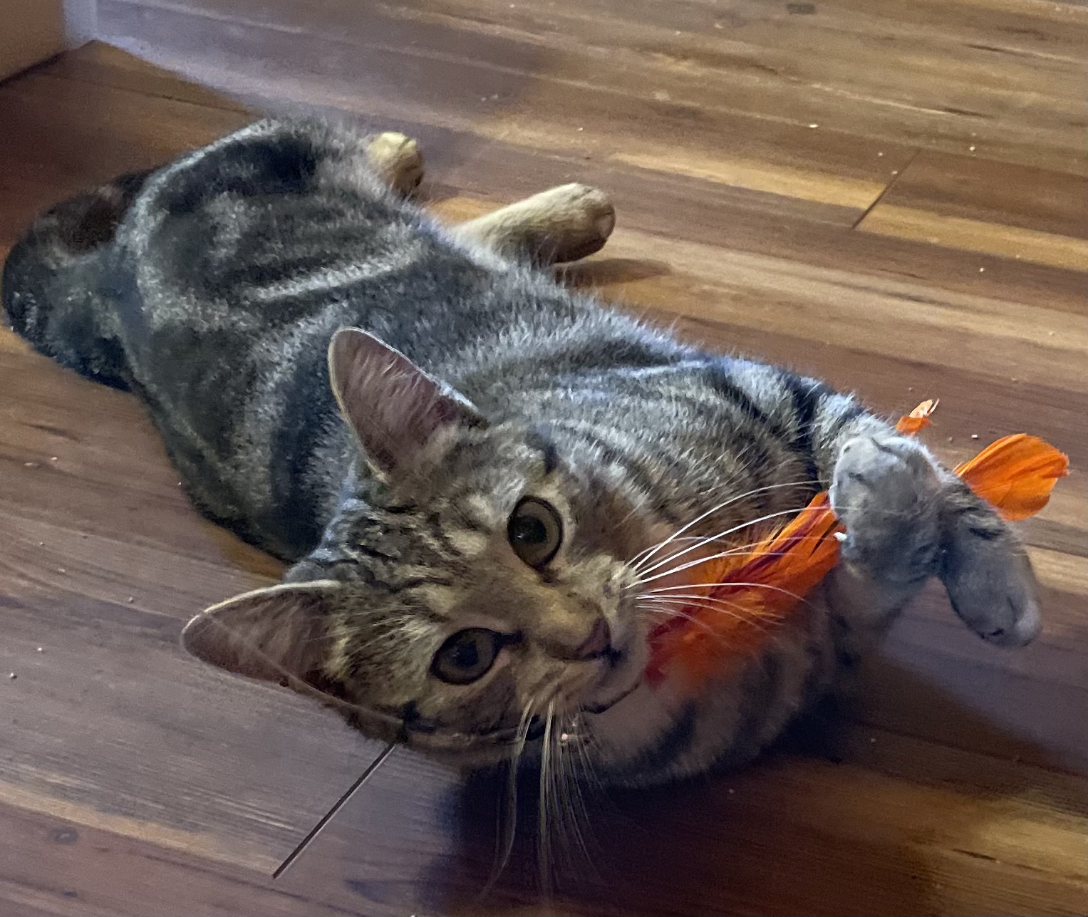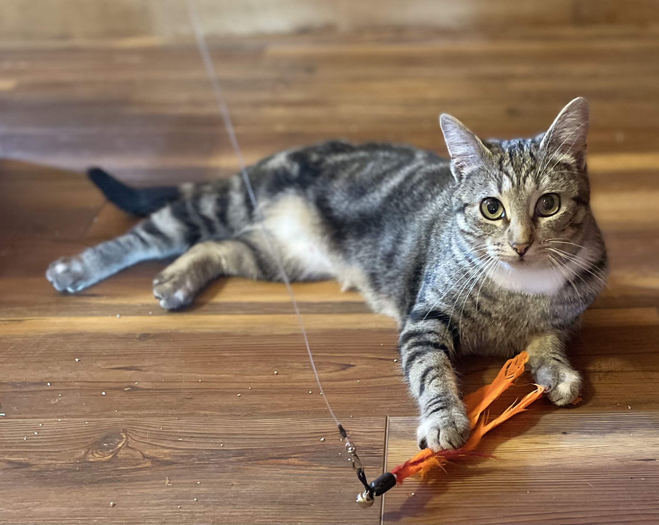 Meet Starlit! This one-year-old classic tabby is a swirl of black and brown with a soft white chest and tiny “paint splashes” on her paws—simply gorgeous! Rescued while caring for her two kittens, she’s now ready to reclaim her playful kitten days.