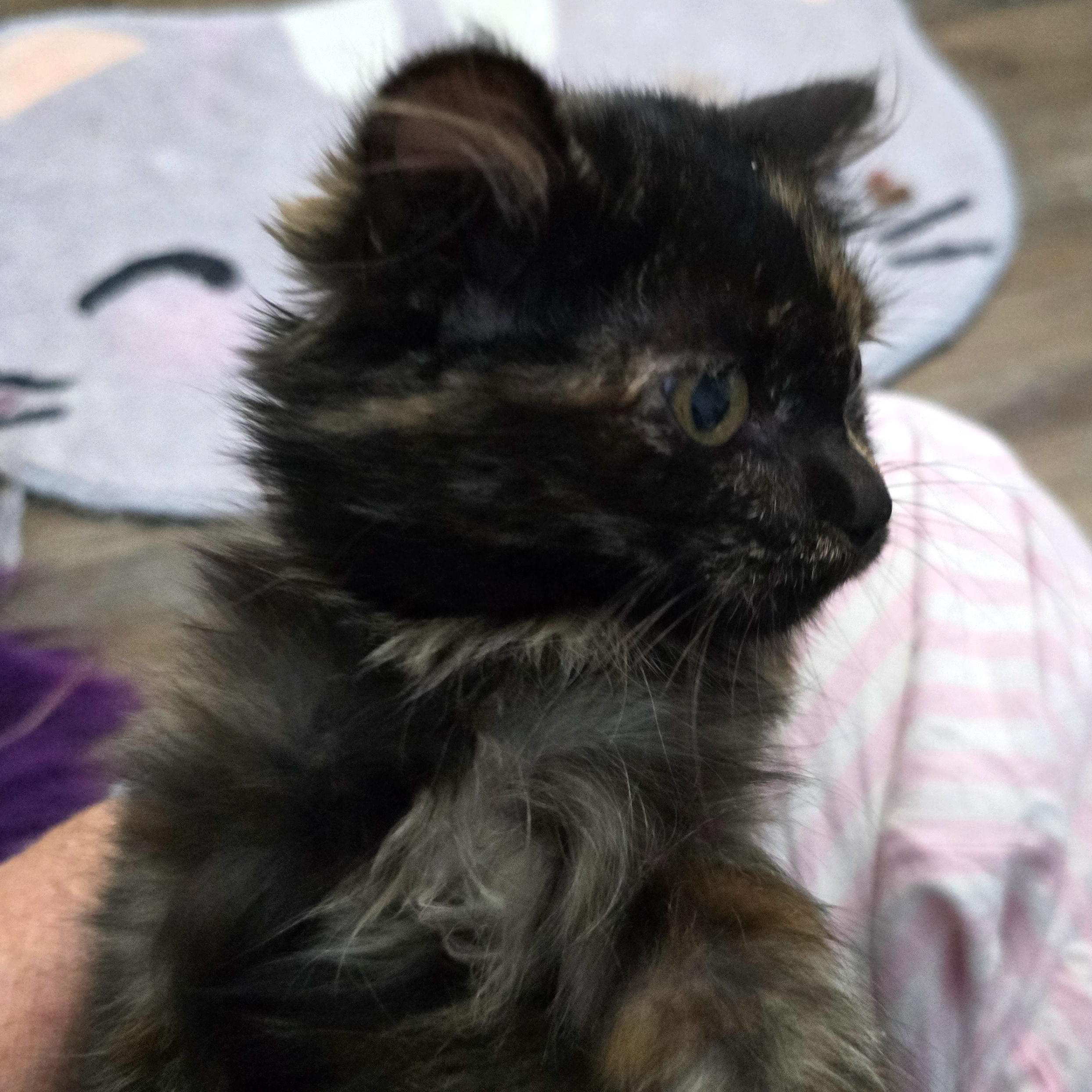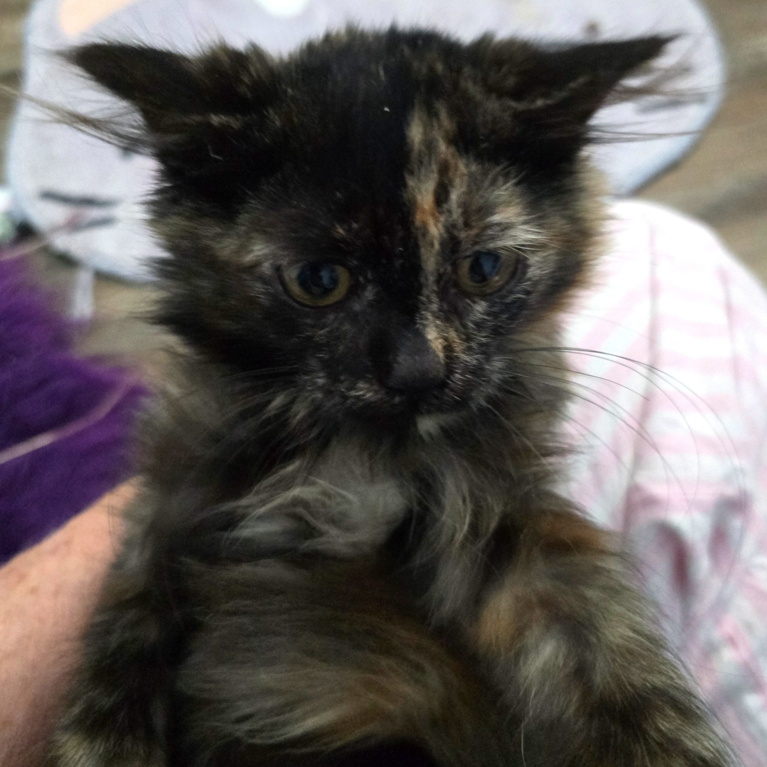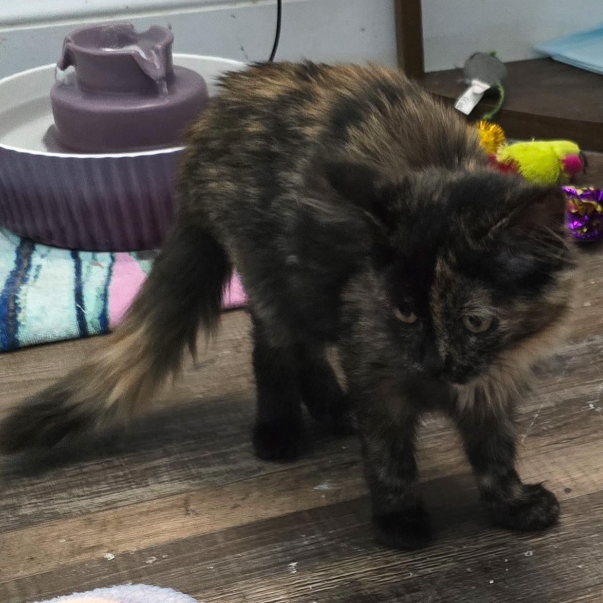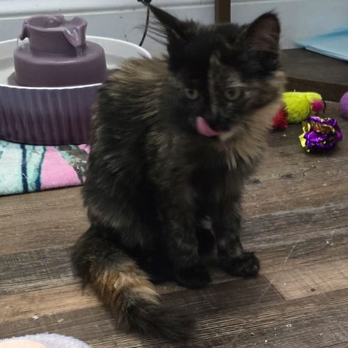 Four-month-old Maisie has been through a lot in her young life. She was trapped and brought into foster care along with her two siblings. When they were all fixed, her brother and sister both tested positive for FeLV, while Maisie tested negative. That meant she had to be quarantined and retested over a period of months to ensure she continued to be negative for FeLV, so she had to stay away from her siblings to prevent infection. It was definitely a big change to be all by herself! Maisie has completed her quarantine and finally moved into a big room, but she's still alone, trying to figure out all of these tortie emotions. She's super loving, and she'd rather be cuddled by you than even eat most of the time. Every so often she will nip you, then look surprised like it wasn’t her. Maisie needs a loving home with people who can give her the time to work through her "tortie-ness".. .she's worth every second of the wait!